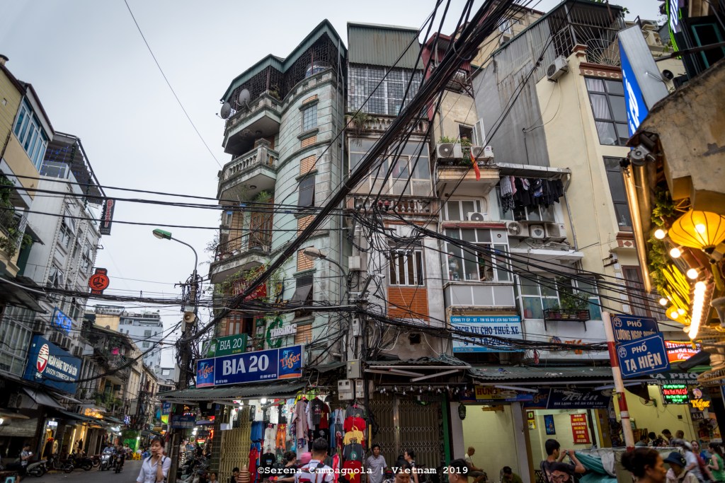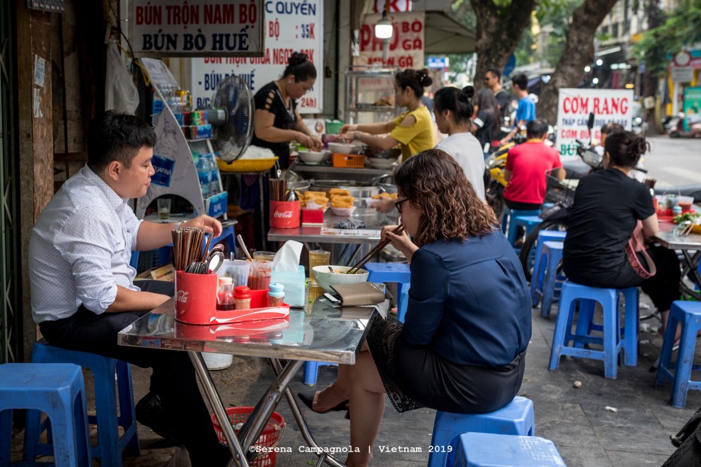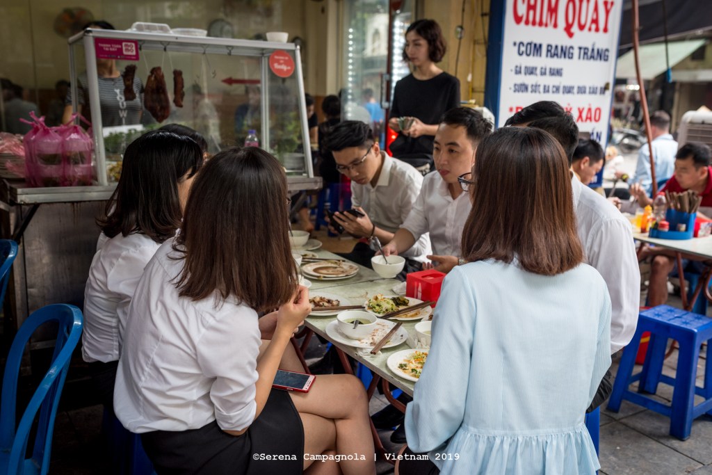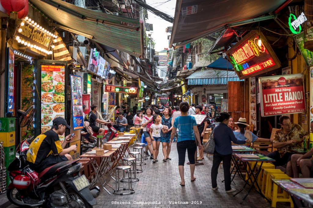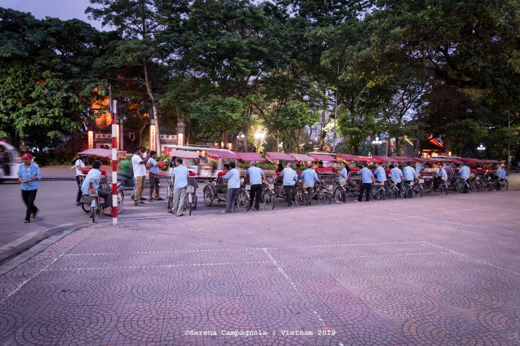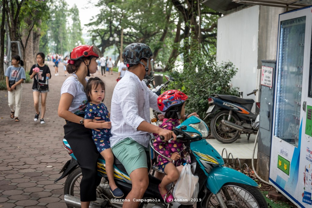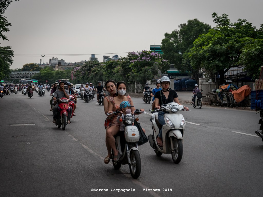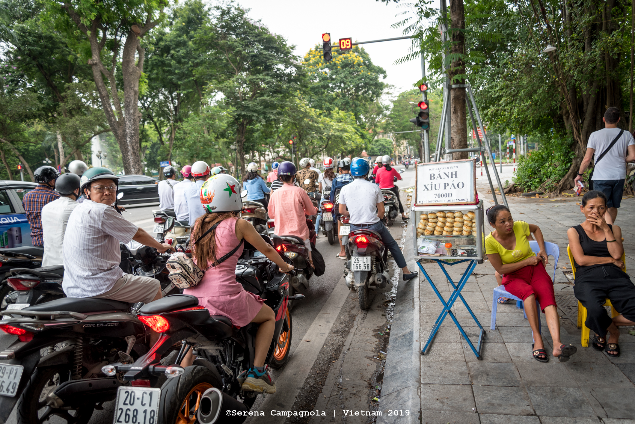 Hanoi qualche informazione. È molto facile da visitare, è stato anche facile impostare gli itinerari quotidiani. La città è caotica, ma allo stesso tempo ha il suo fascino. L’impatto è forte. Tantissimi scooter ovunque. I marciapiedi non sono per i pedoni, ma sono parcheggi per scooter e sfruttati dai vari esercenti per tavolini o esposizione di merce in vendita. Preparatevi a camminare in mezzo alla strada dove non ci sono regole: sensi unici, attraversamenti pedonali, rotonde vengono affrontate come capita. Vince chi si impone. Attraversare strade a più corsie con un fiume di scooter è veramente un’esperienza unica! Bisogna guardarli in faccia uno ad uno e tirare fuori la mano aperta in segno di “alt” e così adattano la loro traiettoria e ti passano attorno. L’impressione è di essere in mezzo ad un traffico “fluttuante”. Io mi divertivo tantissimo! Hanno comunque una guida moooolto rilassata e tranquilla, vanno lenti e usano il clacson per qualsiasi cosa e ciò aumenta il caos.
