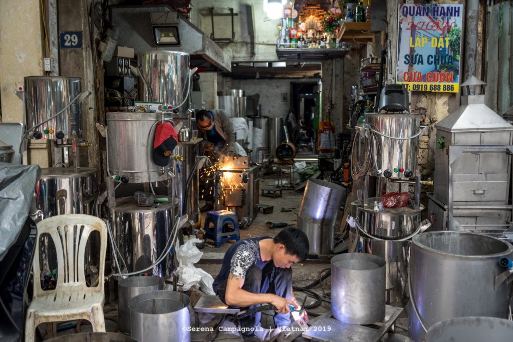 Appena usciti dall’Hotel siamo andati a visitare la Cattedrale di San Giuseppe (entrata gratuita). Poi abbiamo seguito, al contrario, l’itinerario “a piedi Quartiere Vecchio” della Lonely Planet partendo dalle strade specifiche per il tipo di attività o di prodotti venduti, negozi: di sete, di giocattoli, di statue buddiste, degli specchi, delle scatole di latta, di erbe, dei fabbri, gioiellerie, di calzature… Passando per le vie Pho Hang Gai, 26 Tố Tịch, Pho Hang Quat, Hàng Thiếc, Pho Hang, siamo giunti al Mercato di Dong Xuan (il mercato coperto più grande di Hanoi). Purtroppo siamo arrivati nel tardo pomeriggio e stavano già iniziando a chiudere.