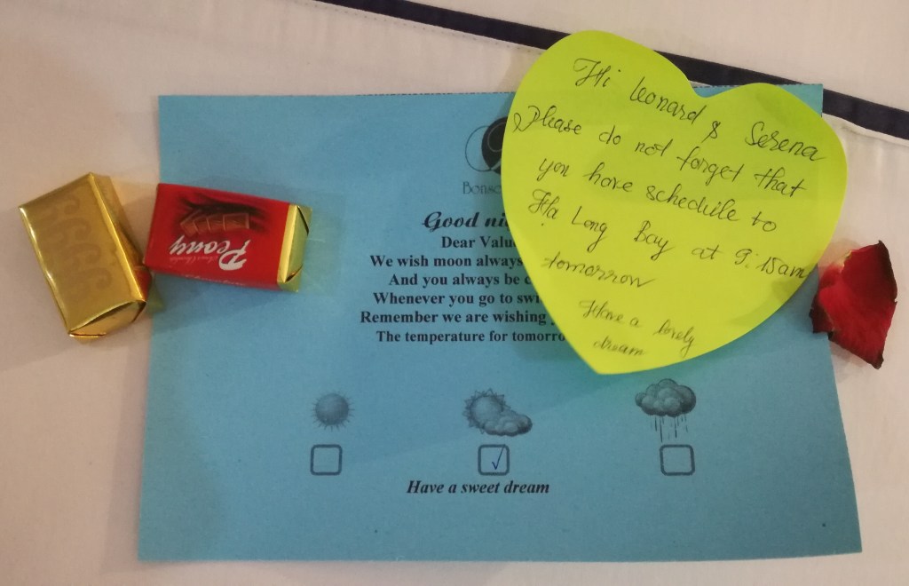 Il valore aggiunto del Bonsella è nel personale che vi lavora. Tutte ragazze gentilissime ed estremamente disponibili. Faccio qualche esempio: hanno pensato loro alla conferma della crociera alla baia di Ha Long, nonostante la prenotazione l’avessi fatta io con Booking; nel secondo soggiorno ci hanno fatto un upgrade gratuito della camera, dicendoci, visto che eravamo stanchi dal tour, una camera più comoda sarebbe stata più adatta per farci rilassare; prima di partire per i tour hanno voluto i contatti dell’agenzia; ci hanno prenotato loro lo spettacolo delle marionette sull’acqua mandando un collega a prenderci i biglietti, senza sovrapprezzo. Gentilezza e accoglienza a noi italiani sconosciute, soprattutto se si pensa che tutte le attenzioni erano proprio genuine, senza doppio fine, per il piacere di far star bene il cliente.