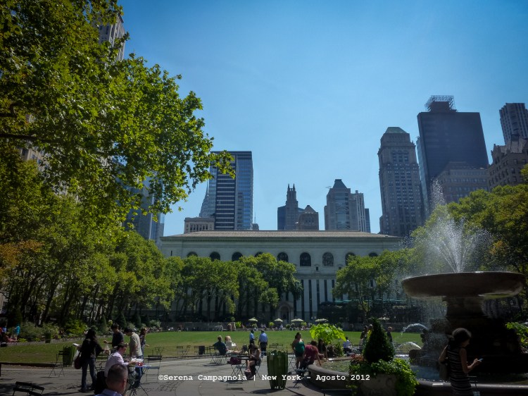 Verso le 15 abbiamo ripreso il treno per tornare a Manhattan. Arrivati davanti alla New York Public Library John ci ha fatto notare che Bryant Park “nasce” sopra le stanze della biblioteca. Dopo esserci goduti il relax del parco ci siamo tuffati nel caos di Time Square.