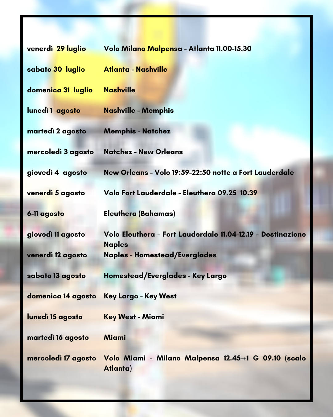 Se tornassi indietro non farei l’ultima parte dedicata alla Florida, ma dedicherei 3 giorni in più alla Strada della Musica (sicuramente una notte in più ad Atlanta, una Memphis e una a New Orleans). Farei qualche tappa intermedia di qualche ora, regalandoci anche il “lusso” di fermarci a caso lungo il tragitto. E perchè non aggiungere 2 giorni a Eleuthera o partire da Chicago?