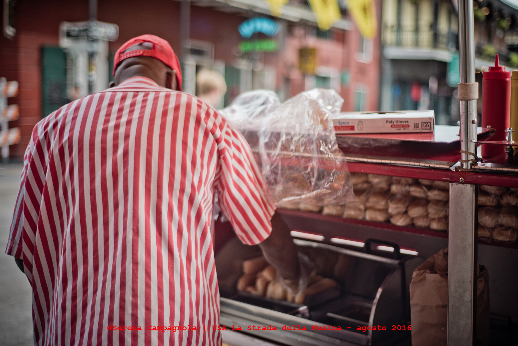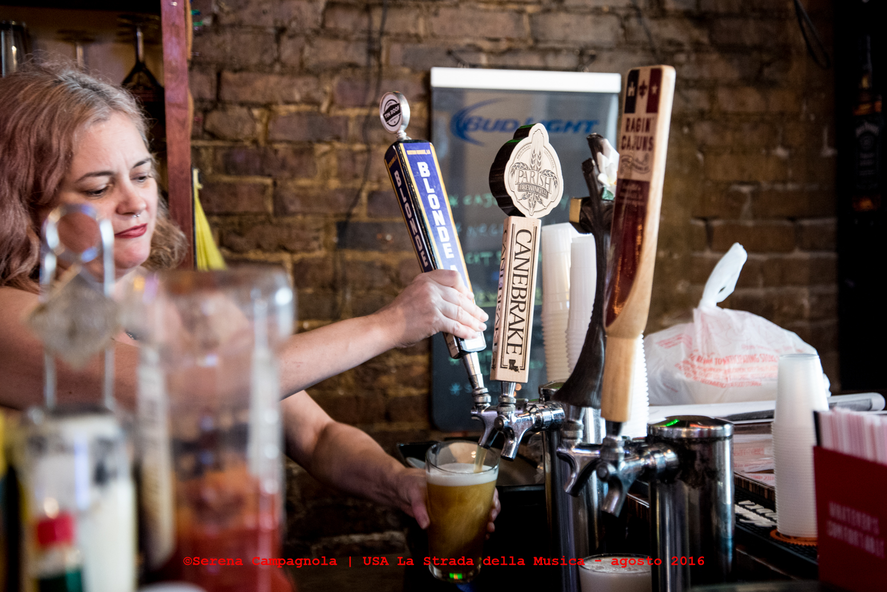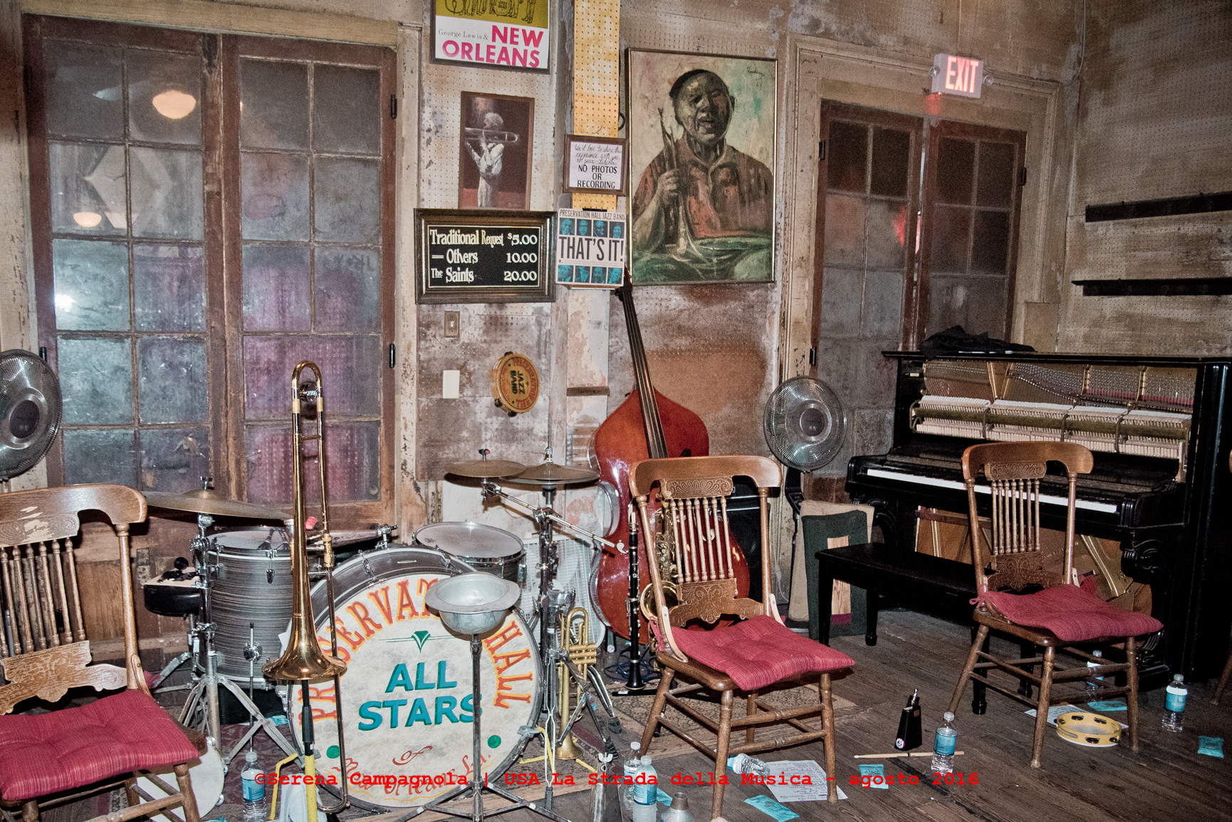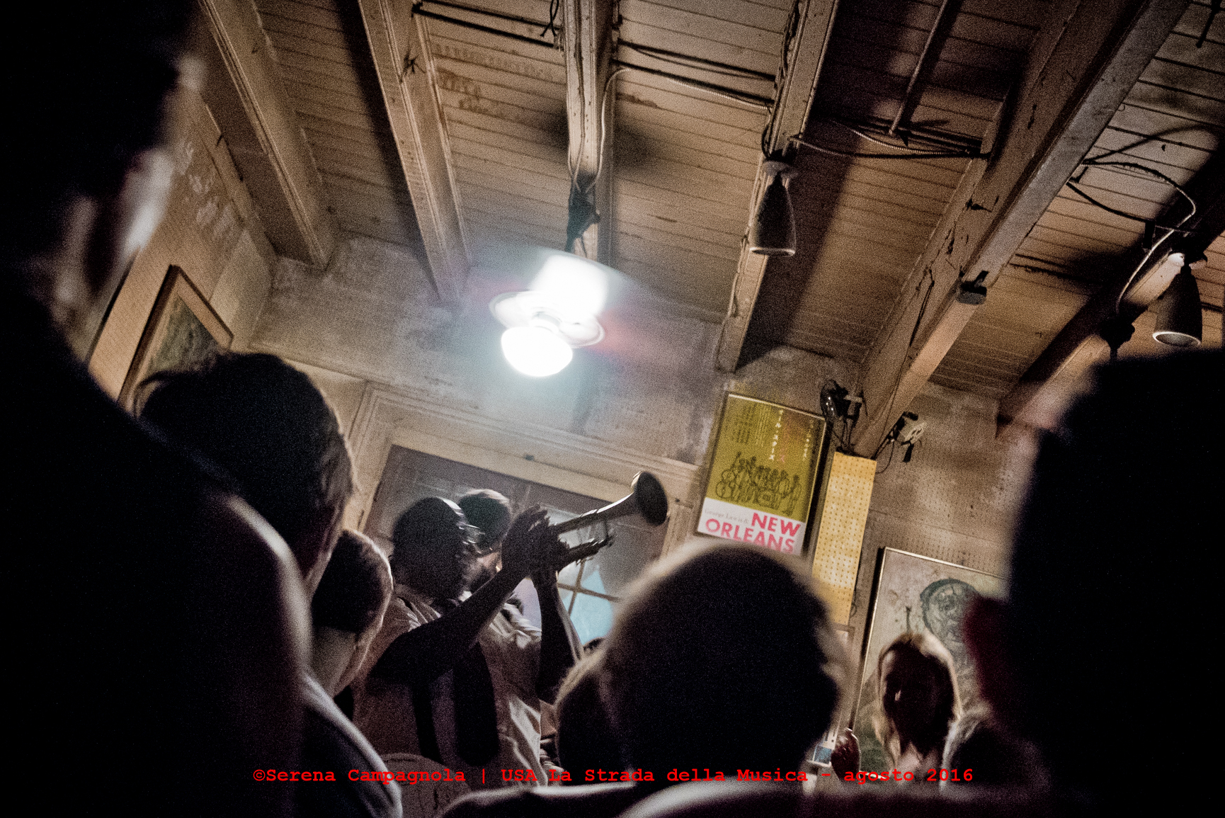 Dopo aver passeggiato su Bourbon Street, ci siamo messi in coda per l’ultimo spettacolo a Preservation Hall (entrata $15 a testa all’interno non vedono da bere). Mentre eravamo in coda, sentivamo dalle finestre l’entusiasmo della gente che assisteva allo spettacolo in corso. Lo stabile che ospita la Preservation Hall è del 1750, la location è davvero autentica ma allo stesso tempo essenziale: curatissima con foto alle pareti che testimoniano la storia della jazz-music, ma con panchette minuscole per gli spettatori. Lo stabile si “riempie” della musica dei gruppi jazz che si esibiscono.