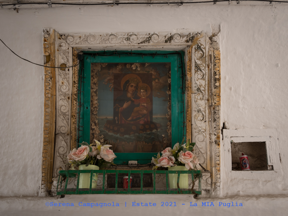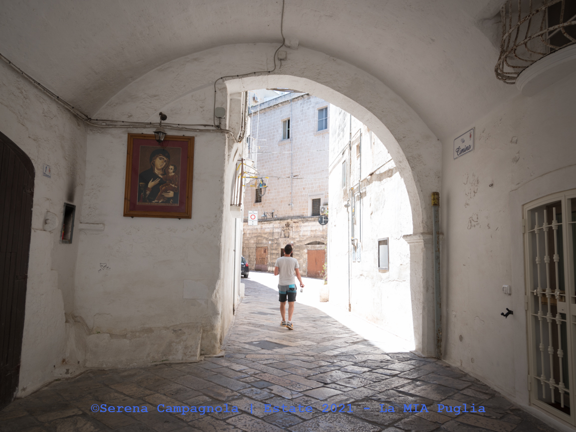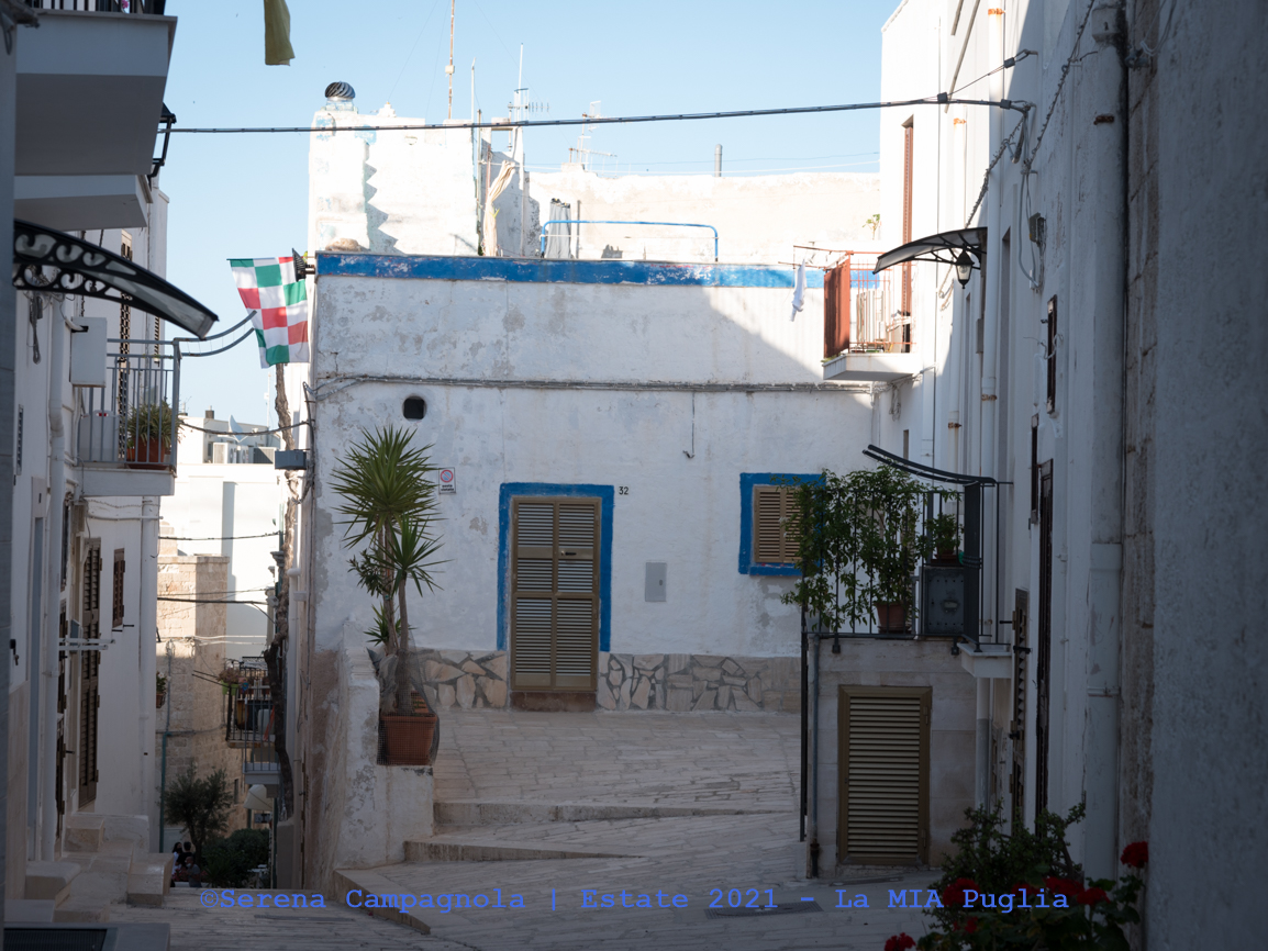 Dicevo di Monopoli… Parcheggiato vicino allo Skatepark, siamo passati da: Cala Porta Vecchia, Castello Carlo V, Palazzo Martinelli e Porto Vecchio. Quest’ultimo è di fatto l’ingresso alla città per chi proviene dal mare, luogo molto pittoresco che si presenta con la forma di un golfo delimitato da antichi palazzi bizantini e veneziani in cui sono ormeggiate le tipiche barche da pesca locali con i colori azzurro (o blu) e rosso. Sul porto, guardando il lato in cui sono ormeggiate le imbarcazioni, noterai una piccola porticina. È la porta d’ingresso al centro storico, dove vi consiglio di gironzolare senza meta perdendovi tra i suoi bianchi vicoli che si aprono in scenografiche piazzette.