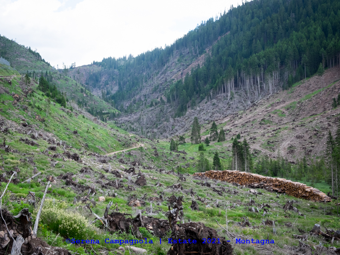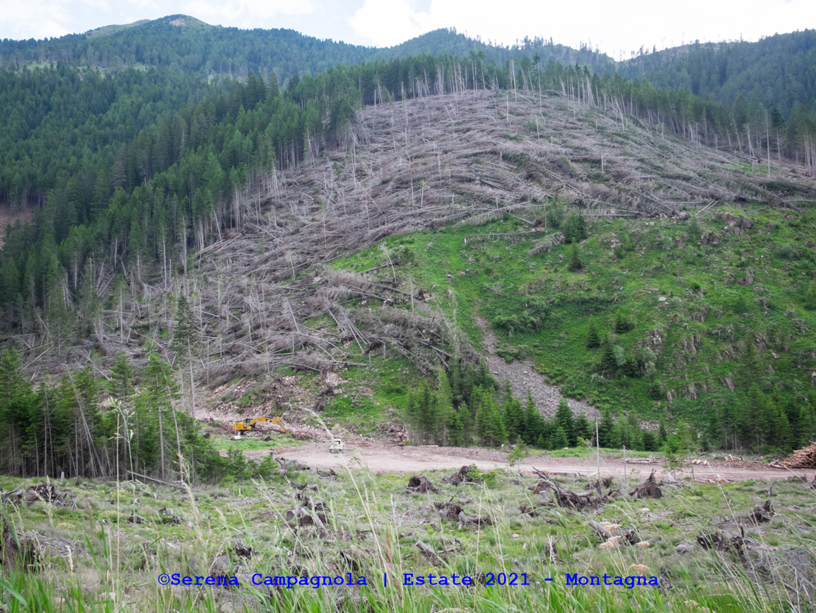 Il contrasto tra le vallate intatte e quelle distrutte è impressionante. Quel cimitero di alberi è un segno tangibile di un bosco che ha ora cessato di esistere e che ha bisogno di cure, interventi e investimenti.