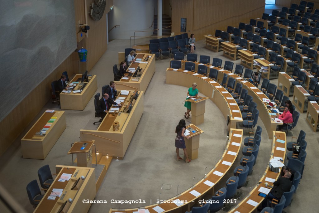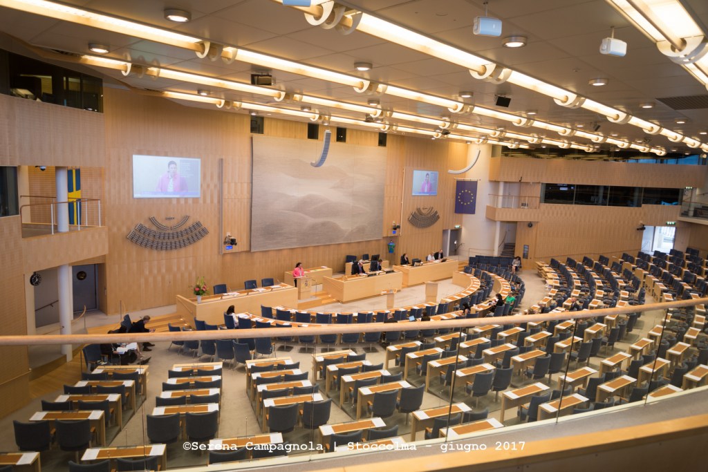 Dopo aver fatto abbondante colazione ci siamo diretti, sempre a piedi, verso Stadshuset (il Municipio di Stoccolma). L’edificio è splendido con i suoi sgargianti mattoni rossi. Volevamo salire, ma l’attesa di più di un’ora ci ha fatto desistere. Ci siamo accontentati di fare un giro intorno e ci siamo diretti verso il Riksdagshuset (Parlamento), dove siamo entrati mentre erano “aperti i lavori” e stavano discutendo su…non ho ben capito cosa.