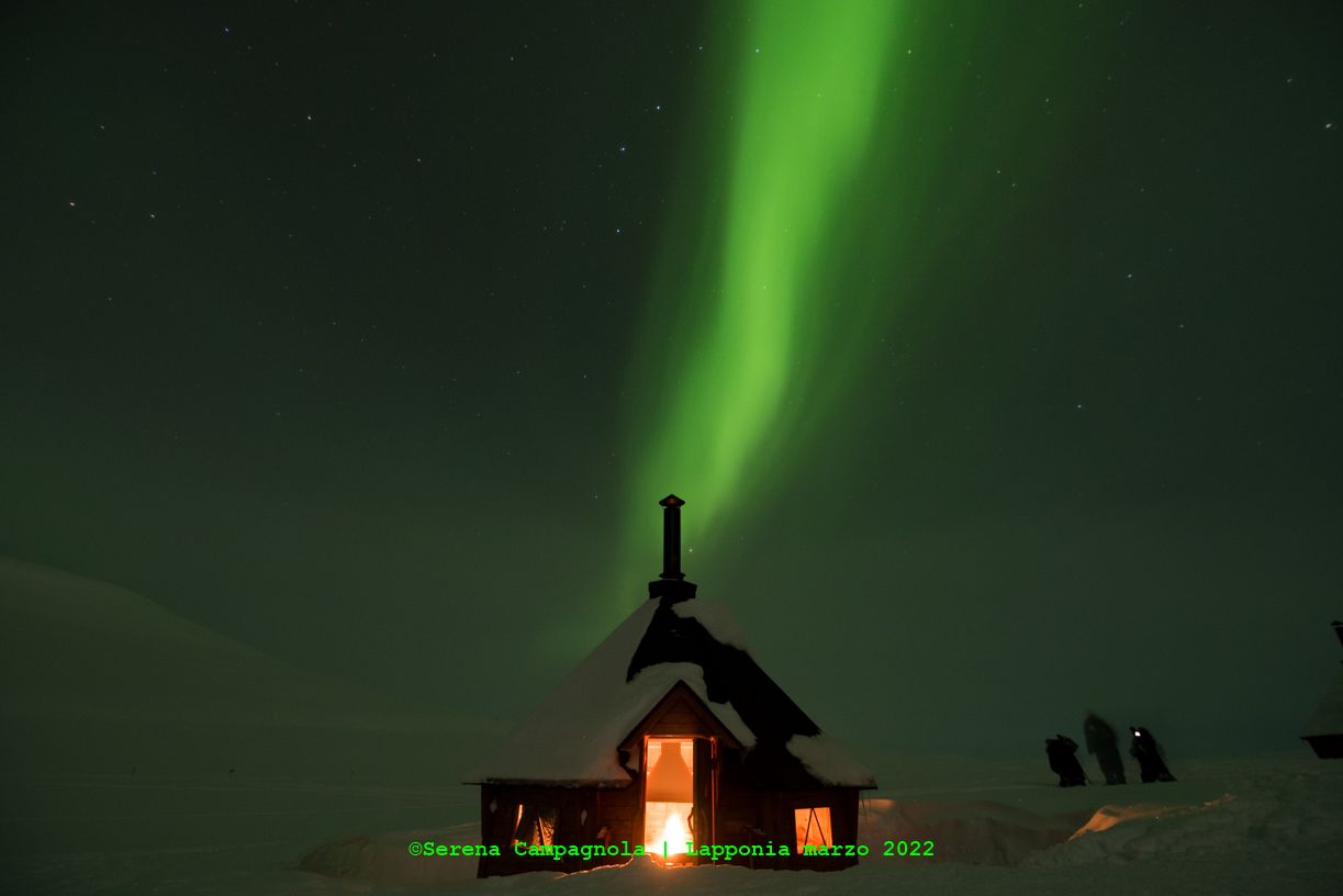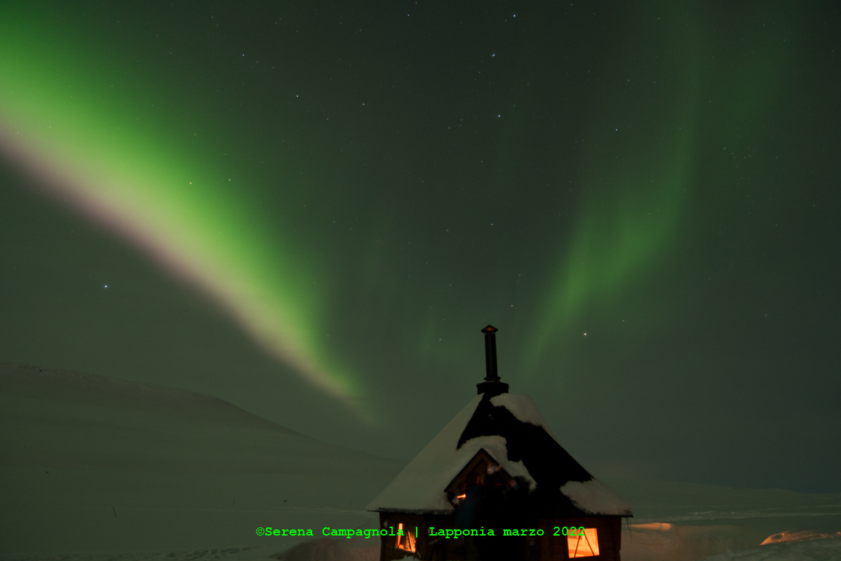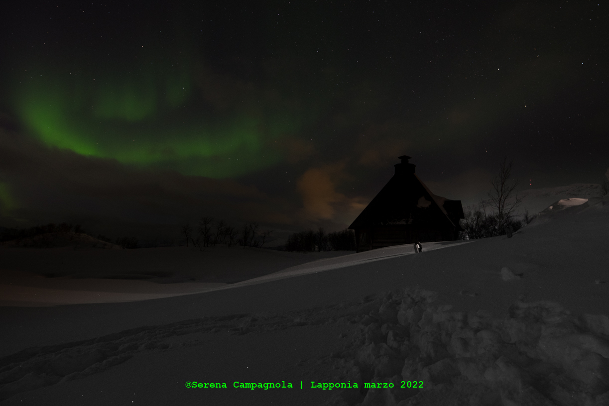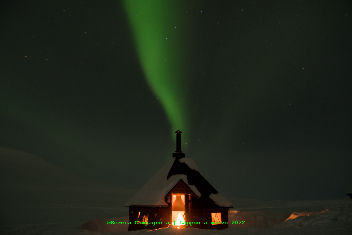 Dopo cena, verso le 20.00 siamo partiti con la slitta verso un altro posto magico alla ricerca dell’aurora. Si è fatta attendere parecchio tanto che eravamo tutti molto disillusi! Poi, ad un certo punto, è iniziato lo spettacolo che è durato un’oretta: danze, movimenti, colori… Da togliere il fiato!