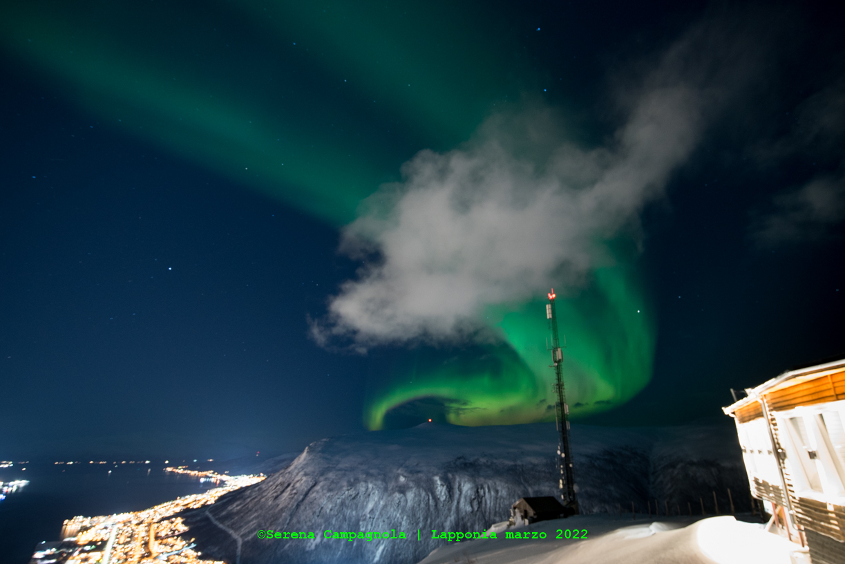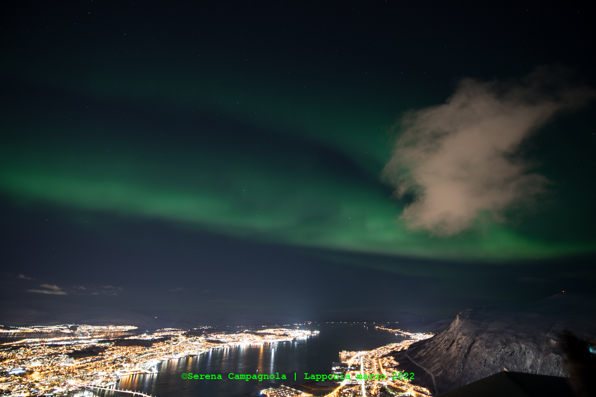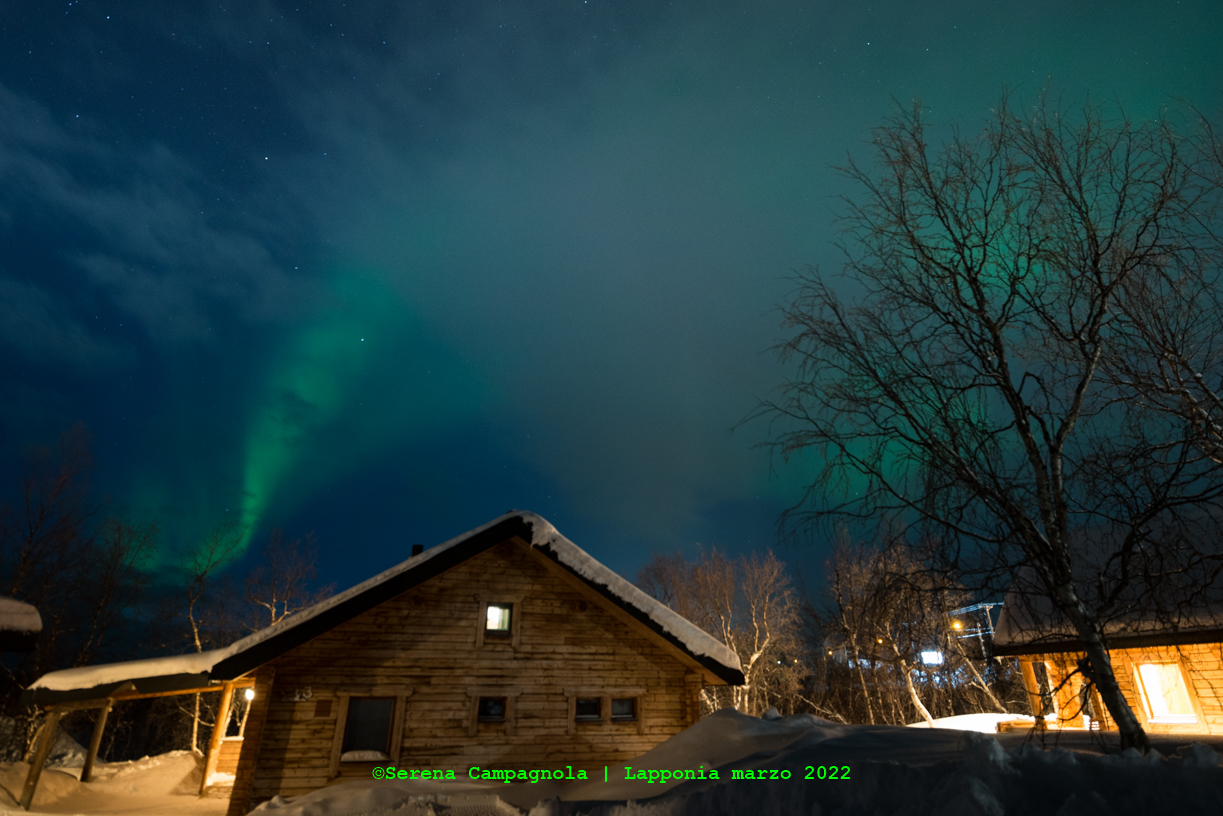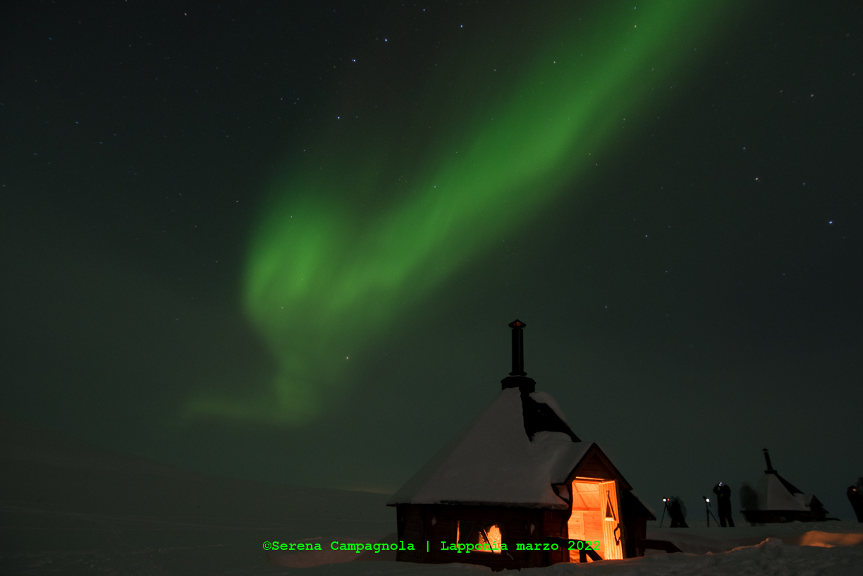 Dopo cena, verso le 20.00 siamo partiti con la slitta verso un altro posto magico alla ricerca dell’aurora. Si è fatta attendere parecchio tanto che eravamo tutti molto disillusi! Poi, ad un certo punto, è iniziato lo spettacolo che è durato un’oretta: danze, movimenti, colori… Da togliere il fiato!