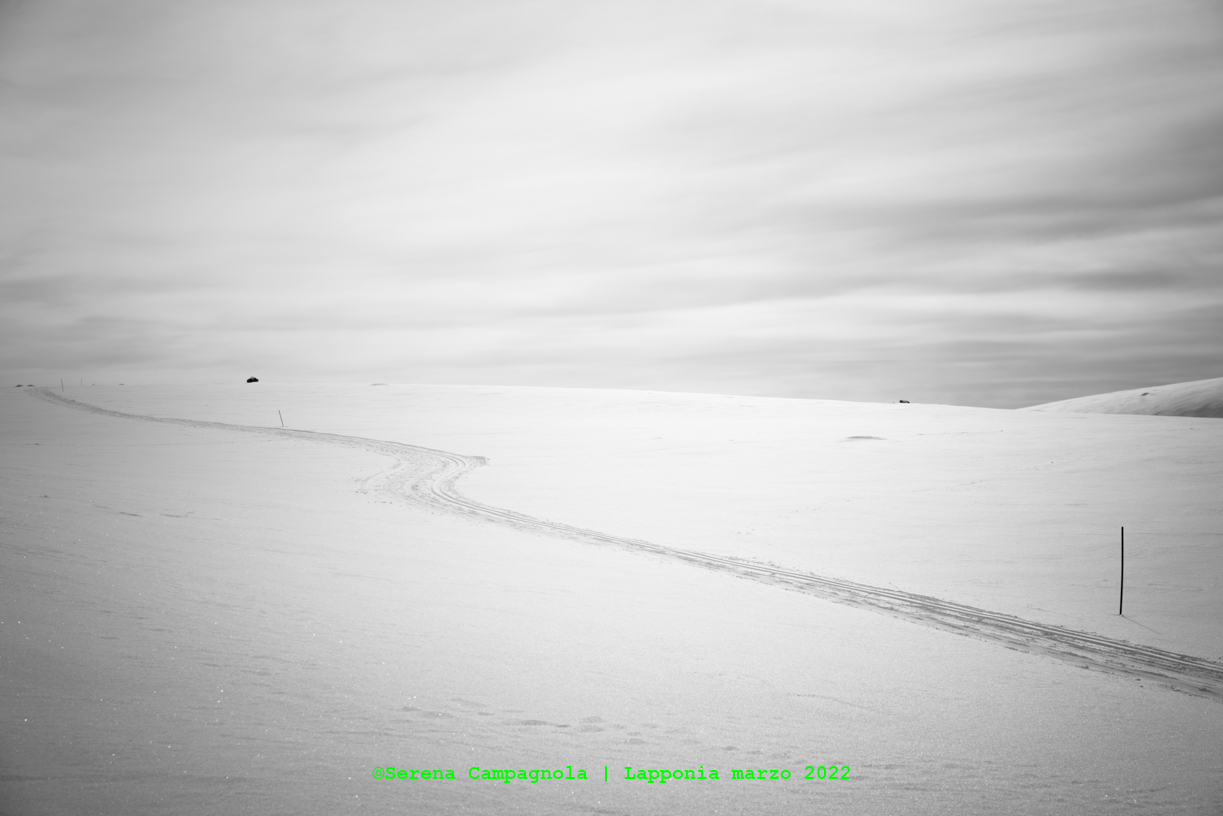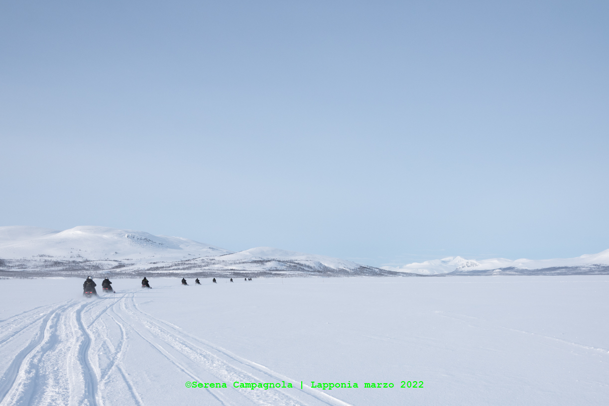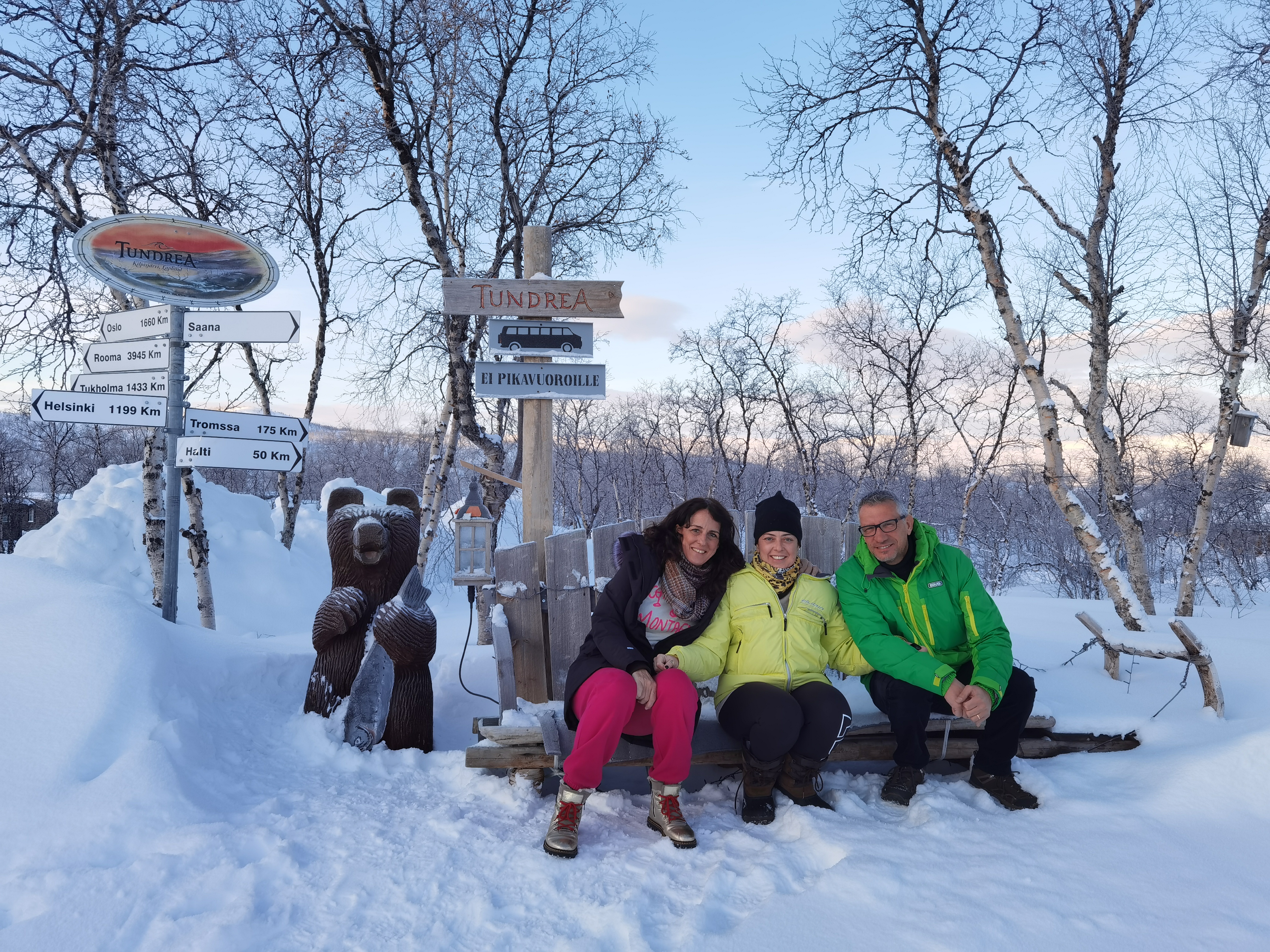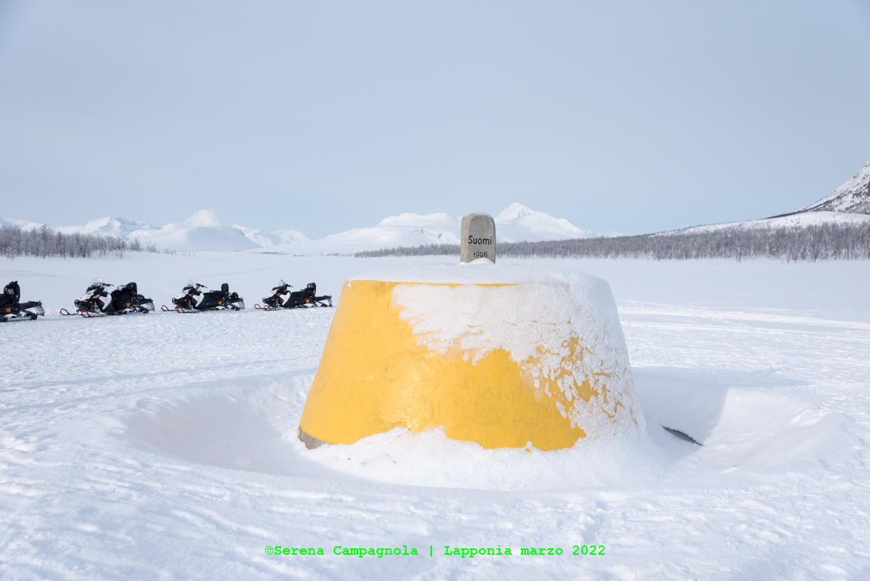 Abbiamo iniziato con la gita con motoslitta verso Three-Country Cairn, il punto dove si uniscono le tre Lapponie: Norvegese, Svedese e Finlandese. Il percorso è incantevole, bianco candido a perdita d’occhio. Sembra un paesaggio lunare…