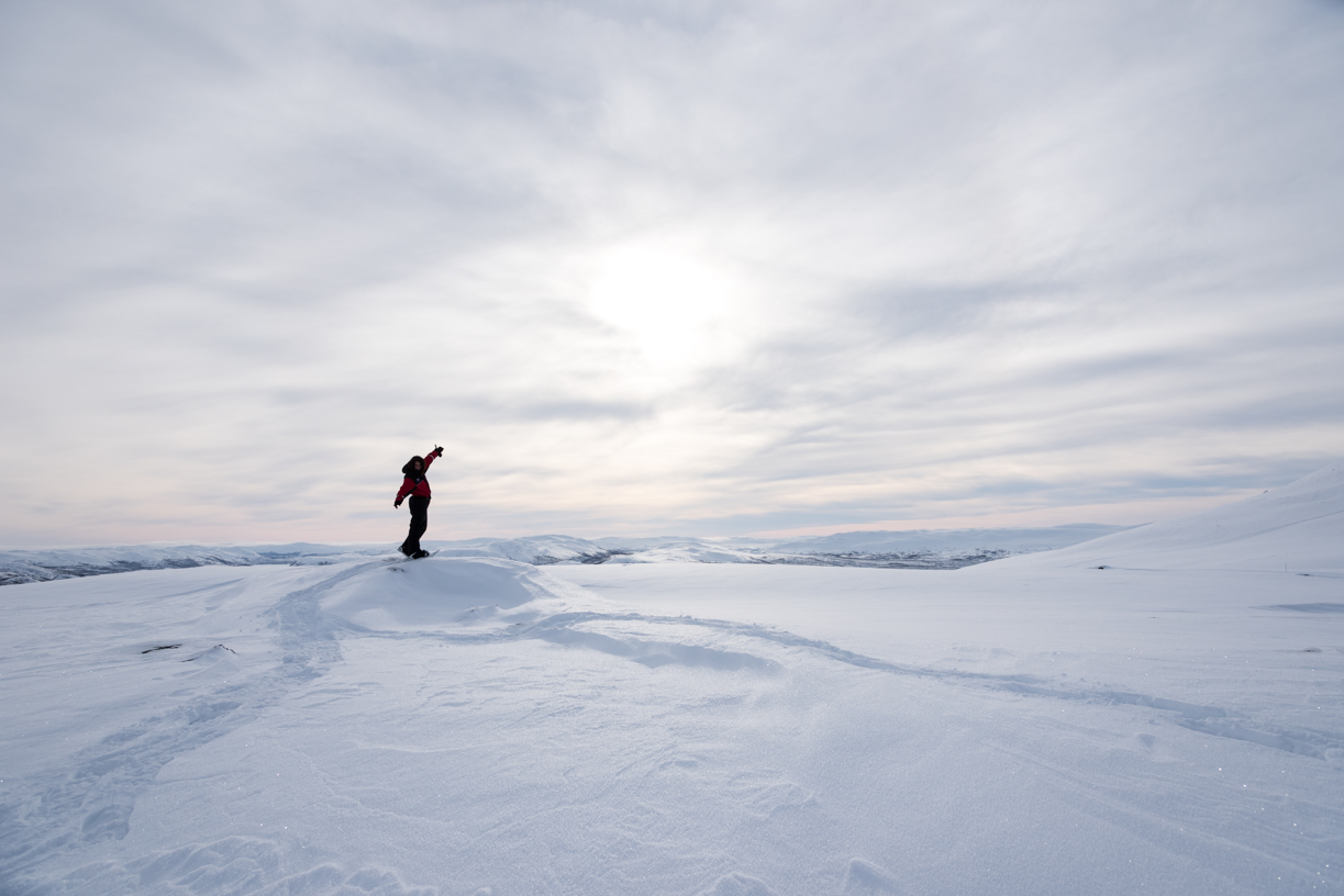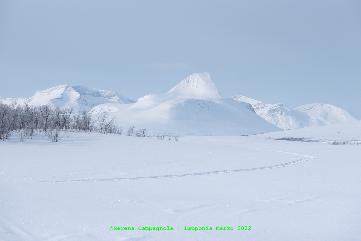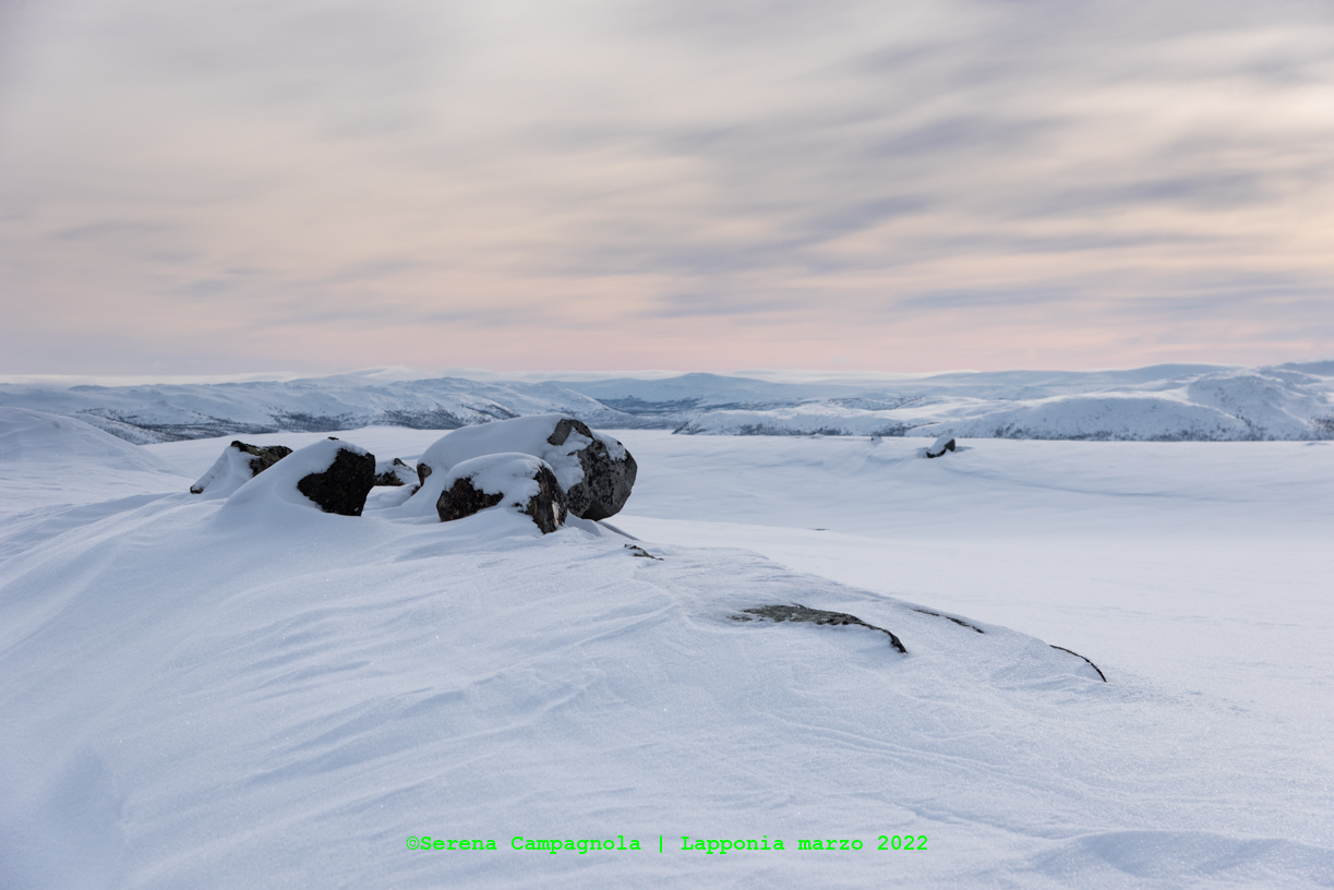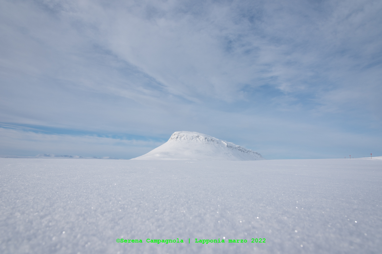 Abbiamo iniziato con la gita con motoslitta verso Three-Country Cairn, il punto dove si uniscono le tre Lapponie: Norvegese, Svedese e Finlandese. Il percorso è incantevole, bianco candido a perdita d’occhio. Sembra un paesaggio lunare…