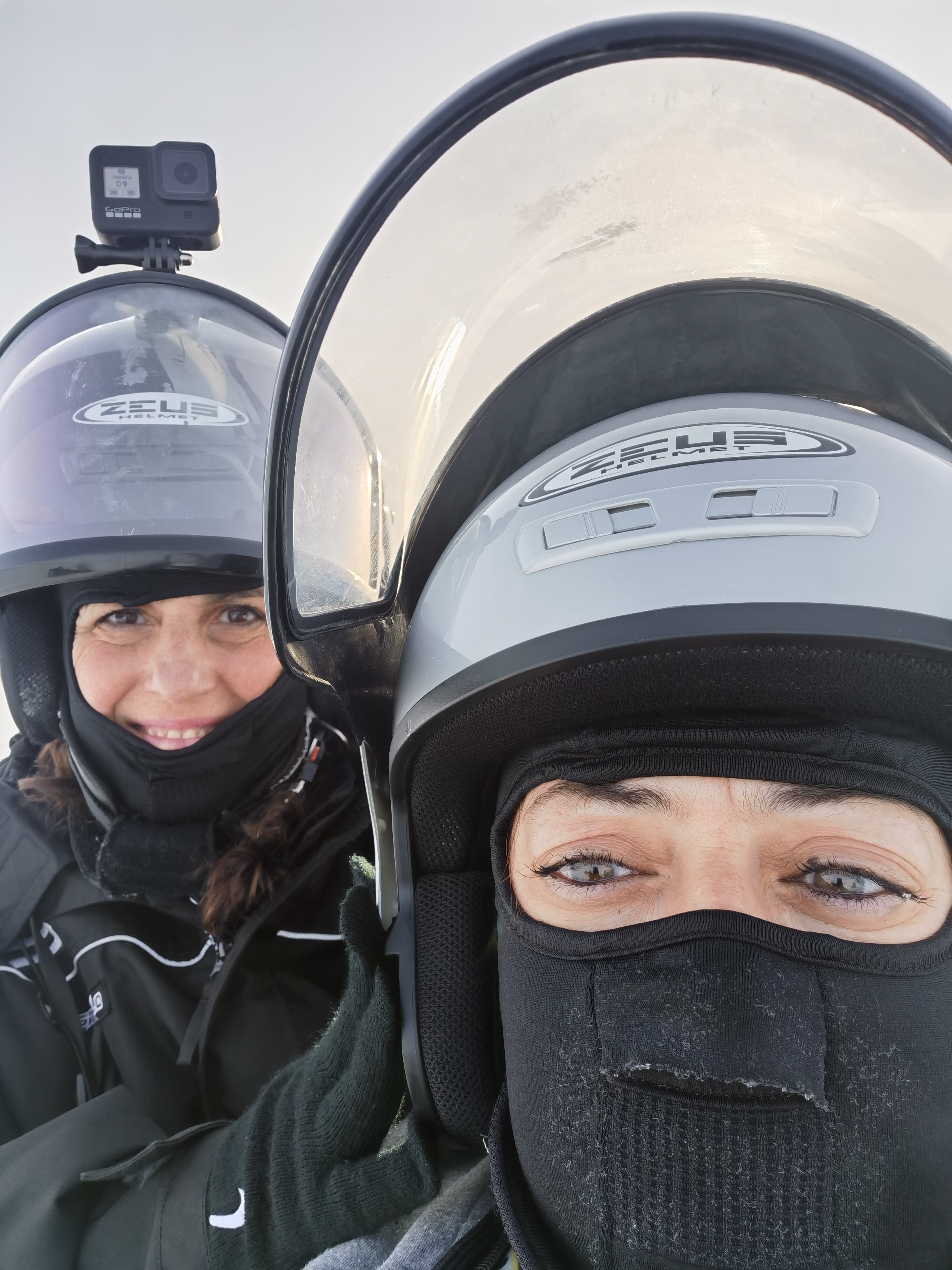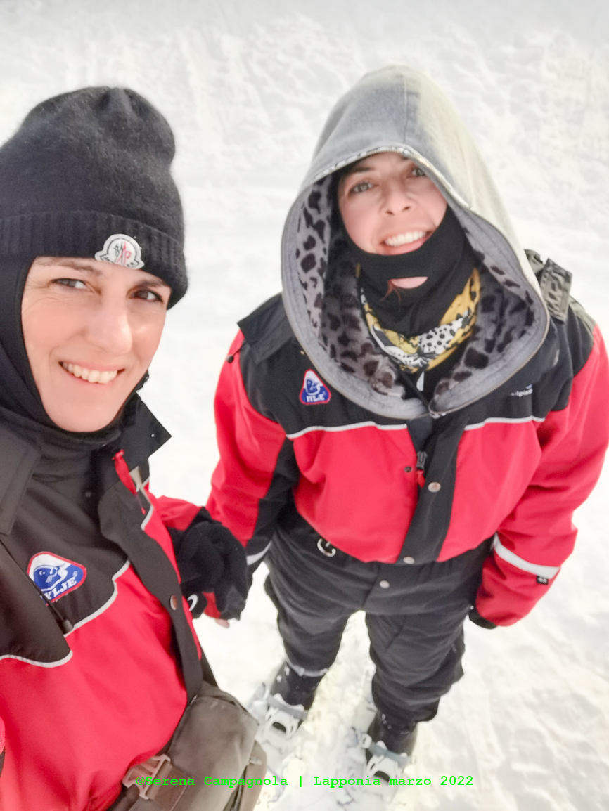 Sia Lyngsfjord Adventure che Kilpissafarit ci hanno consegnato per le escursioni lo strato più esterno da indossare: tutone, stivali, calzettoni di lana (mi hanno ricordato quelli che faceva qualche decennio fa mia nonna, pesantissimi e poco elastici), passamontagna, casco, moffole da mettere sopra ai guanti di lana. Un kit da un peso non indifferente, soprattutto gli stivali, ma fondamentale per quelle temperature! La mattina dell’8 marzo Kilpissafarit ci ha consegnato l’attrezzatura e l’abbiamo restituita quando abbiamo lasciato il cottage.