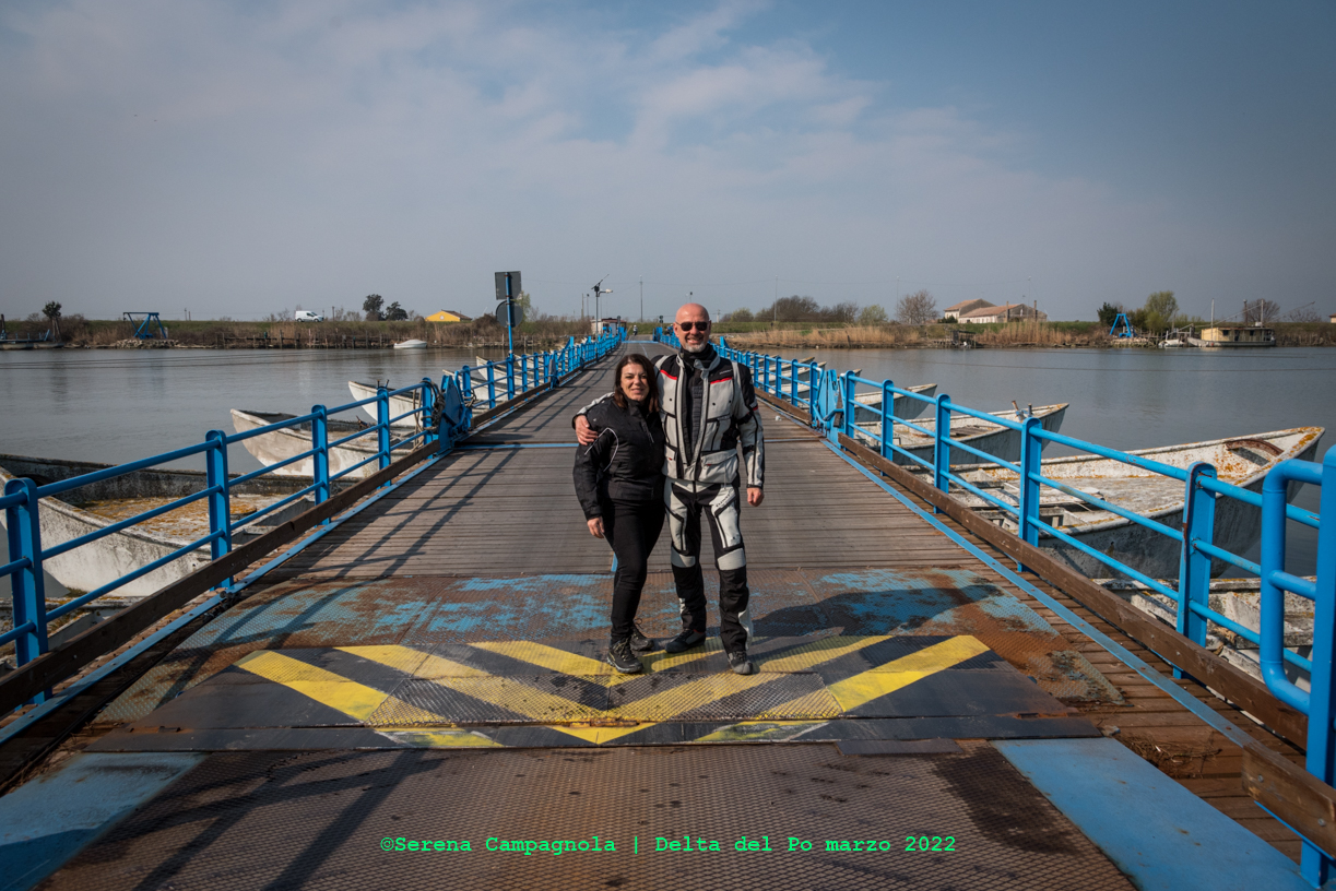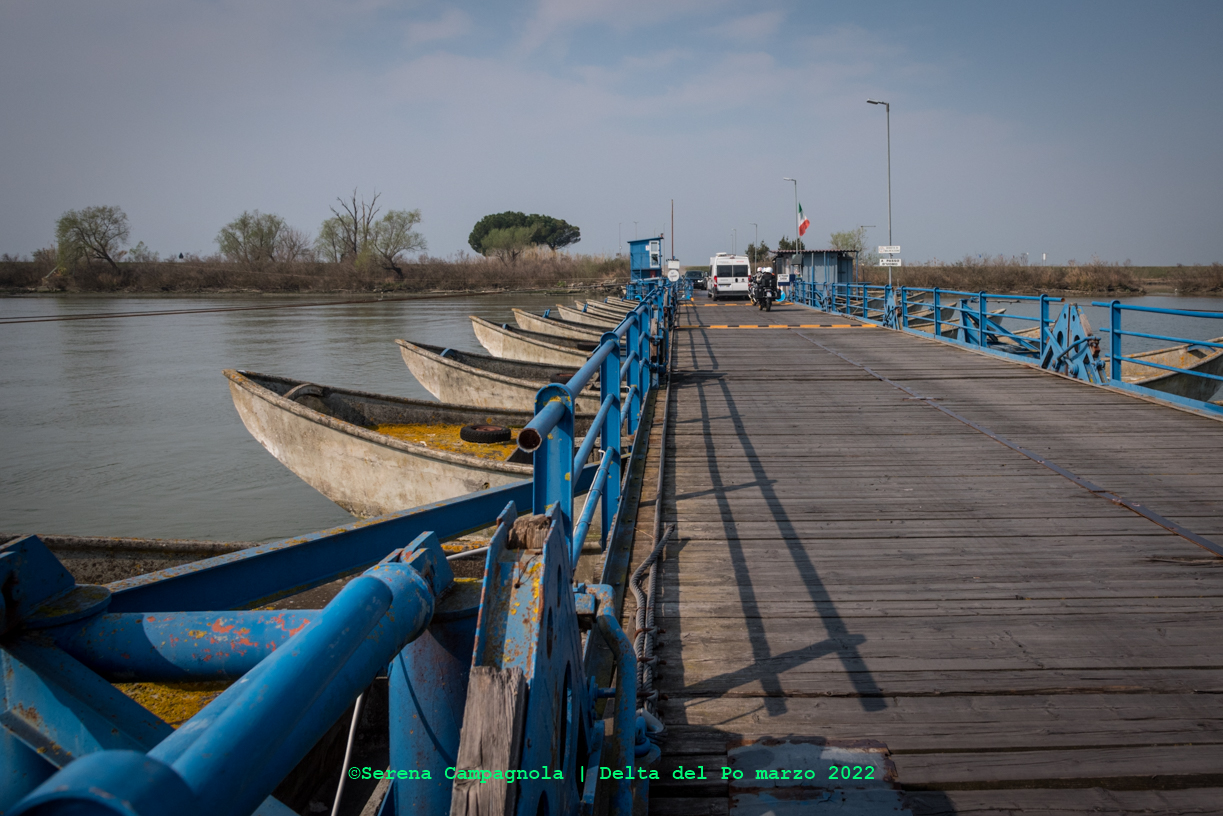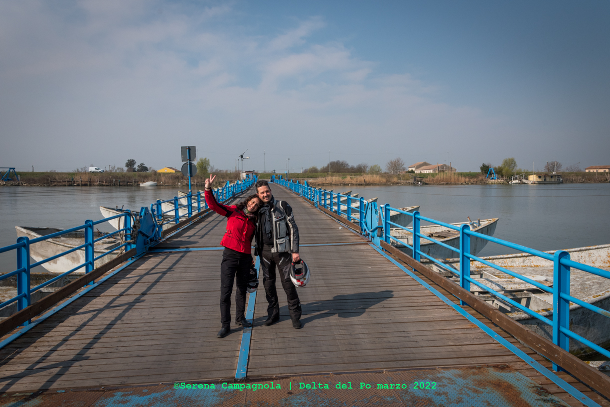 All’altezza di Cassella abbiamo preso la strada in direzione Santa Giulia (ovest), proseguendo sull’argine del Po della Donzella verso il ponte di barche del Po di Gnocca (passaggio gratuito) e poi sul ponte di barche del Po di Goro (€ 1,50 a moto). Devo dire che tra i due ponti di barche attraversati il primo è quello che mi è piaciuto di più!
