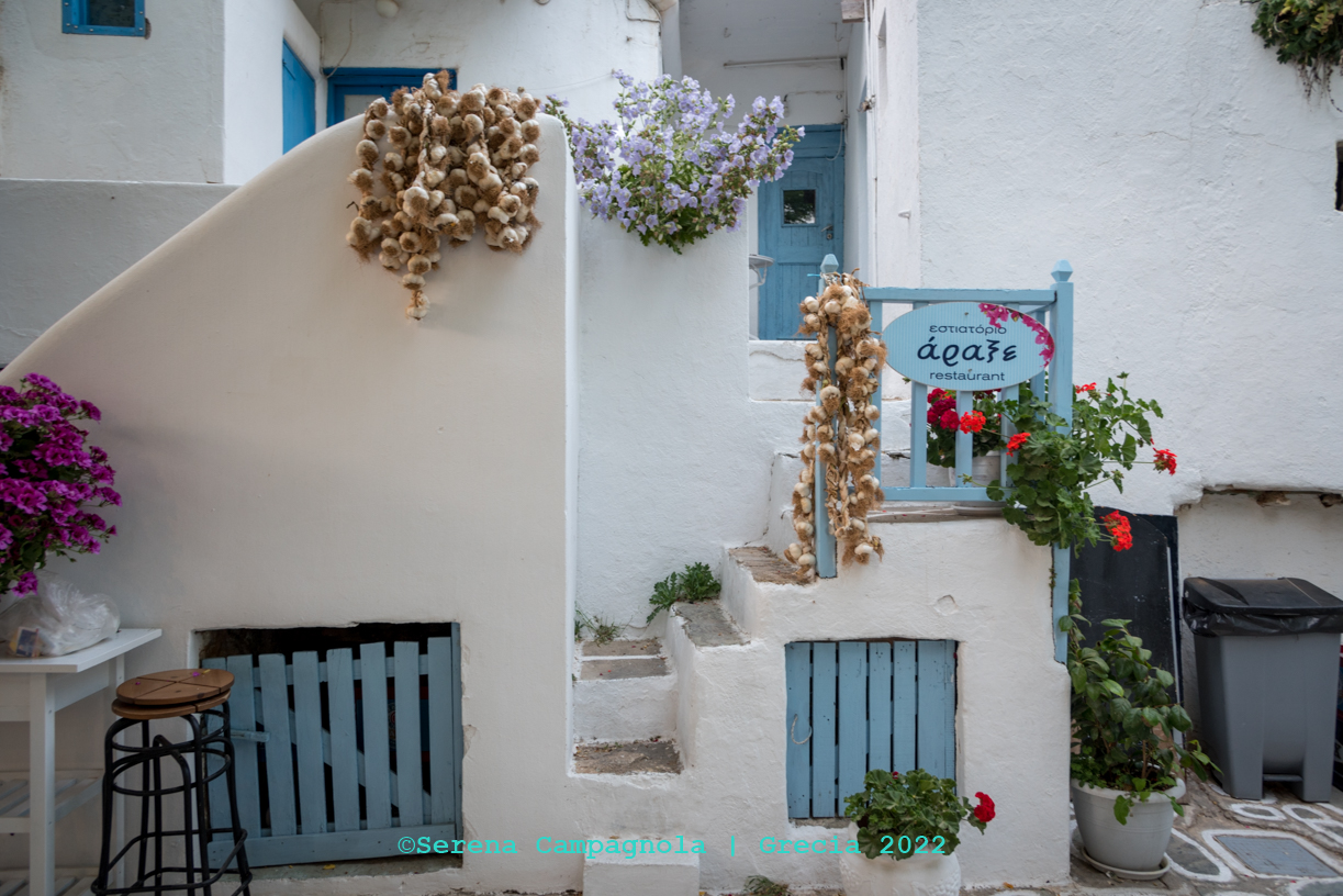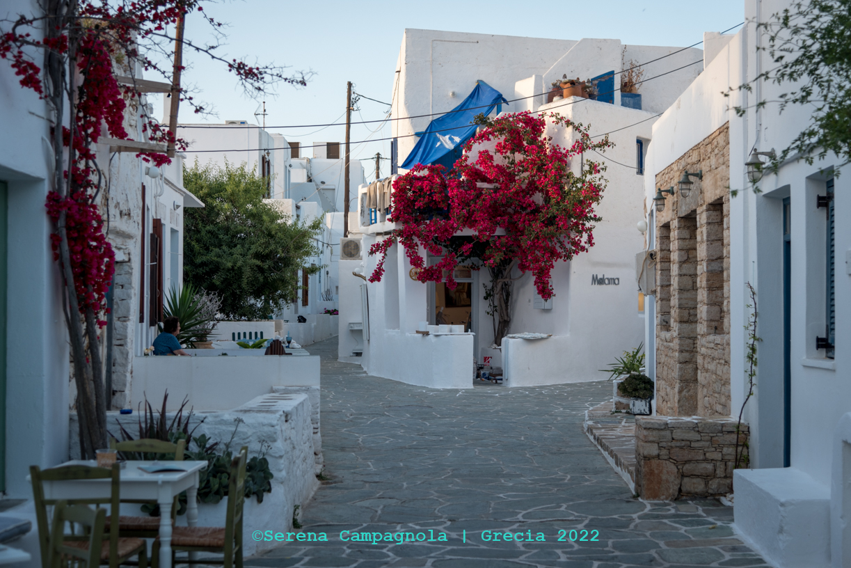 Tutte le sere non poteva mancare il giretto al centro di Chora, che è un piccolo gioiello. Un borgo divinamente tenuto, con case esclusivamente bianche e dove i toni di colore sono dati dagli infissi, cancelli, vasi e fiori.