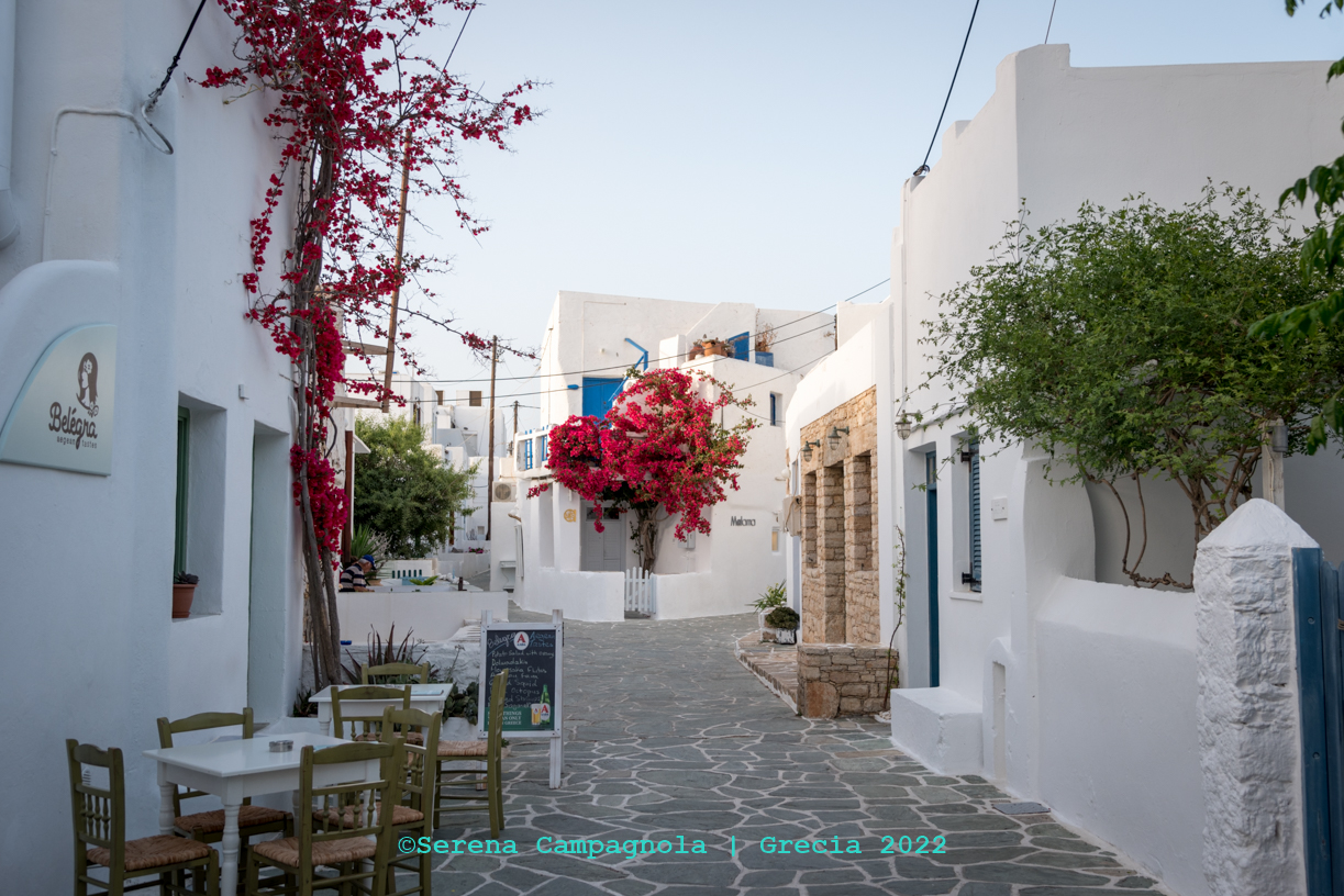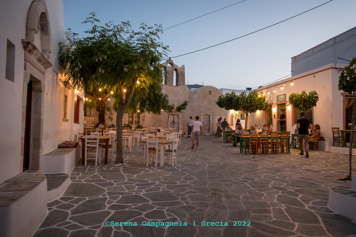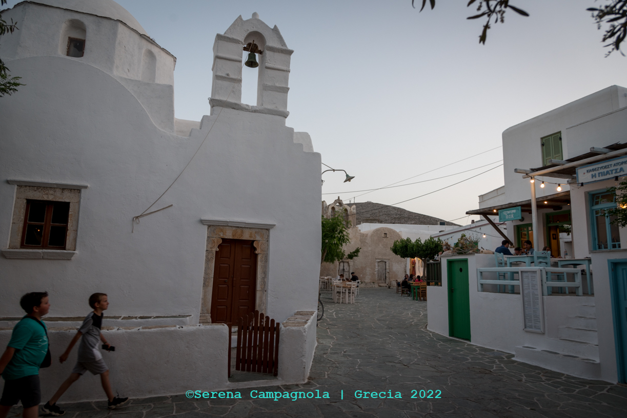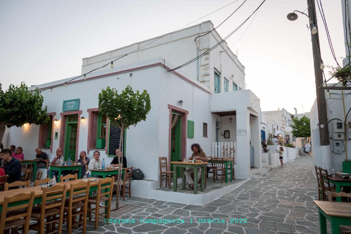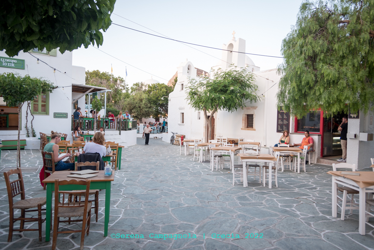 Costruita a ridosso di una falesia, Chora è in assoluto la più suggestiva tra le cittadine delle Cicladi che abbiamo visitato: sembra quasi sospesa, protesa verso il mare ma al tempo stesso protetta. Chiusa al traffico, la cittadina si sviluppa con strette viuzze attorno ad una fortezza e si caratterizza per tre graziose piazze in fila, contornate da ombrosi alberi e con le immancabili taverne con tavolini all’aperto.