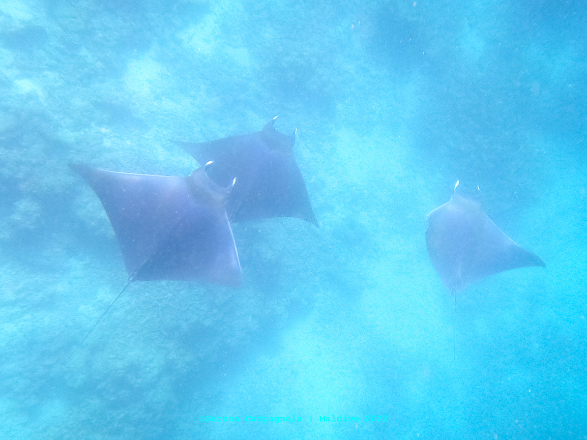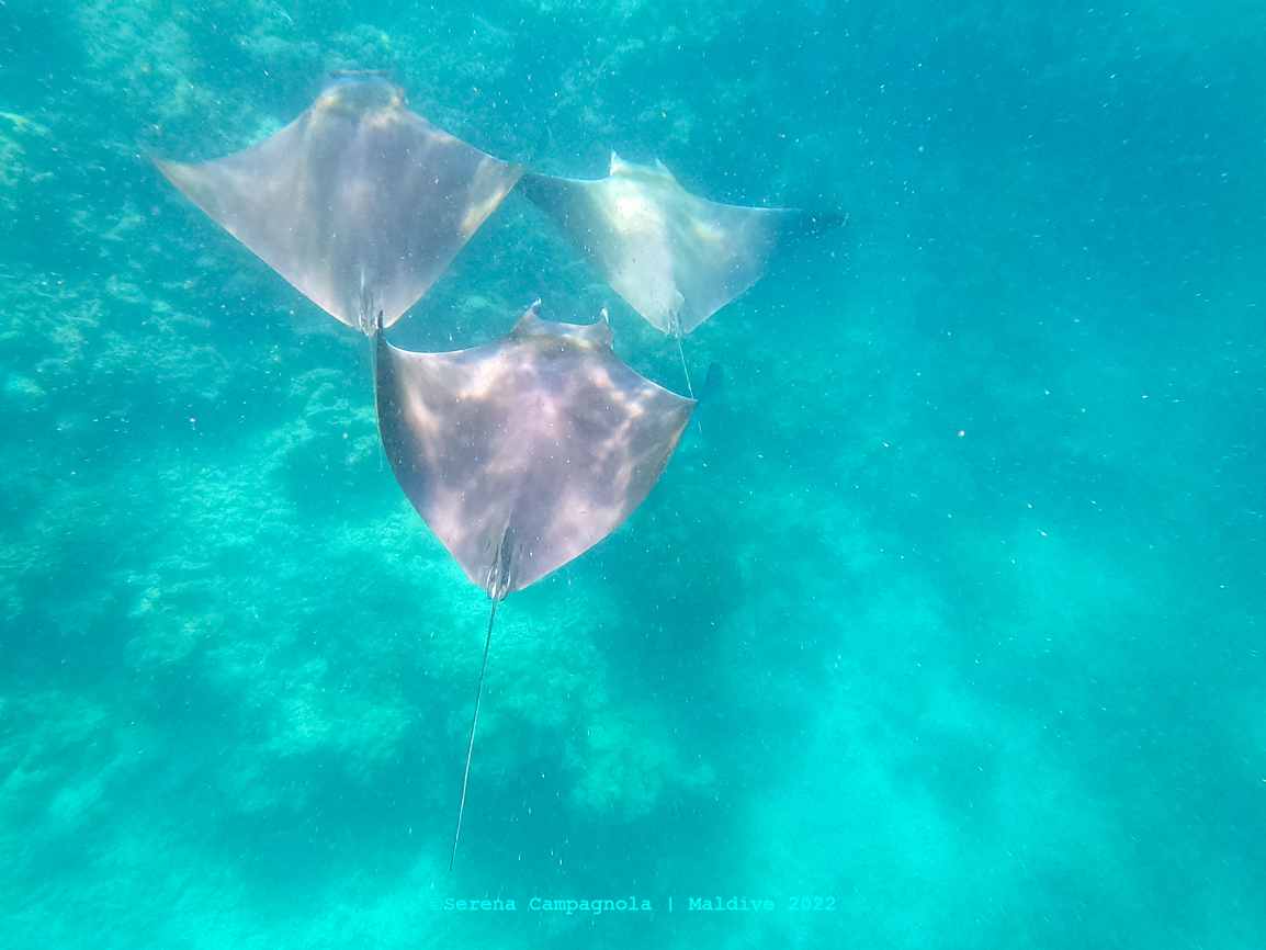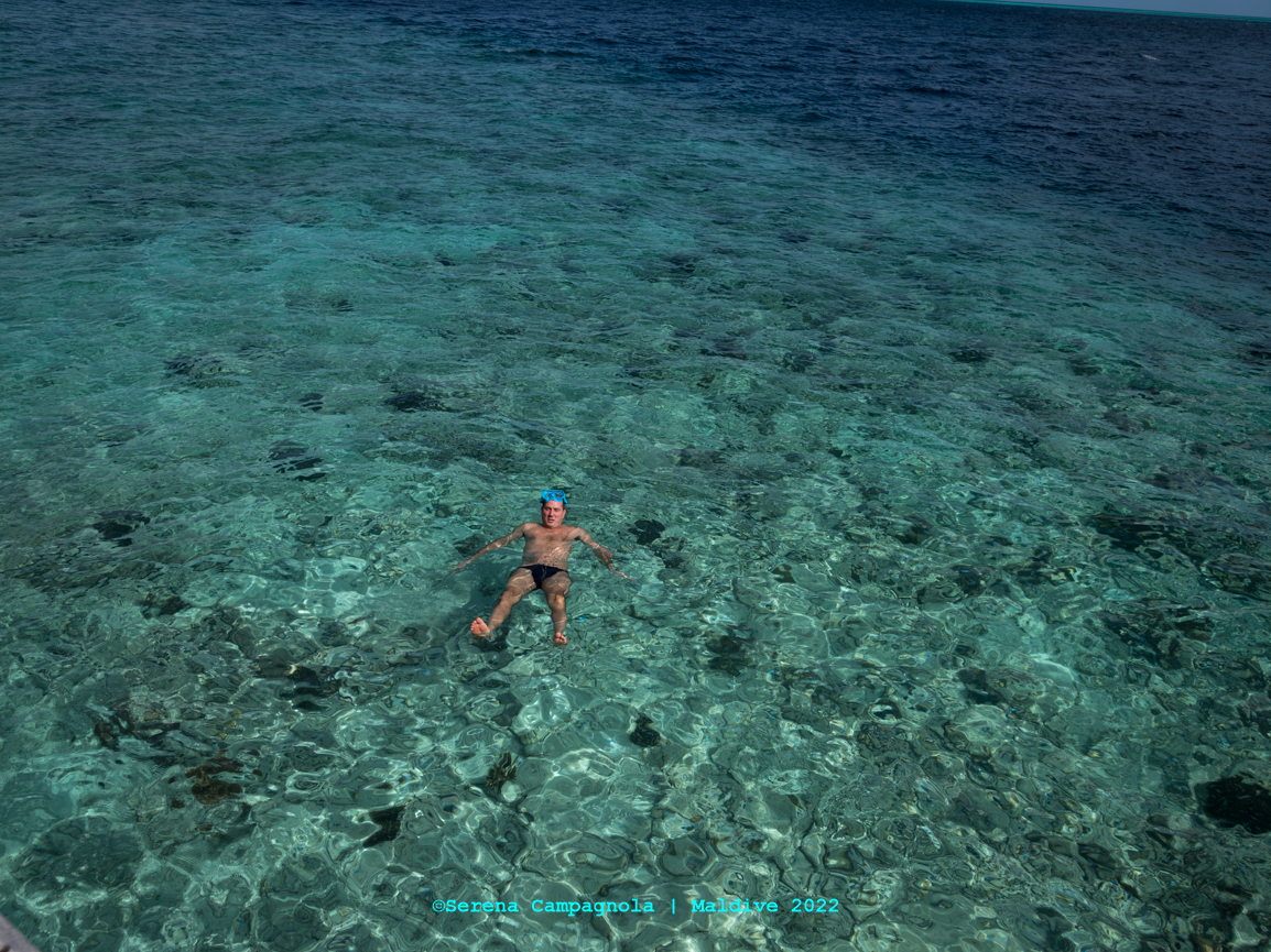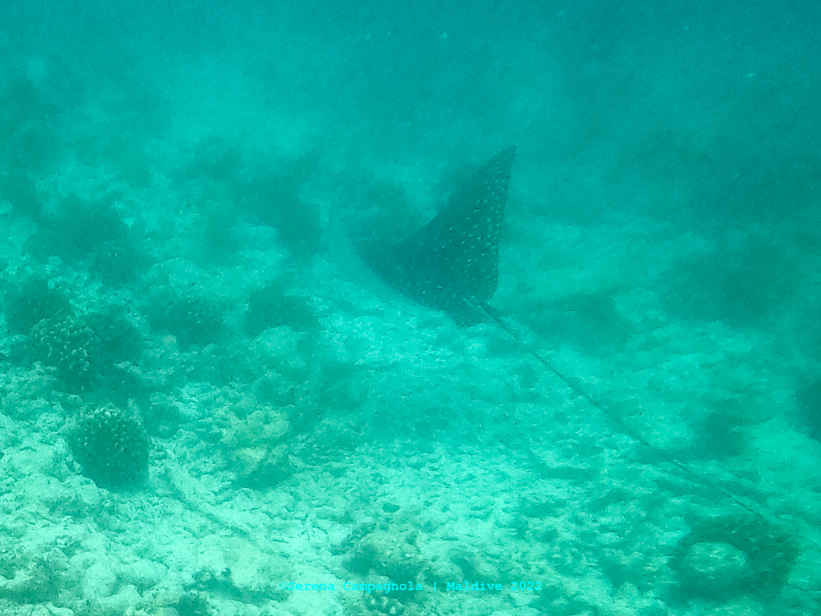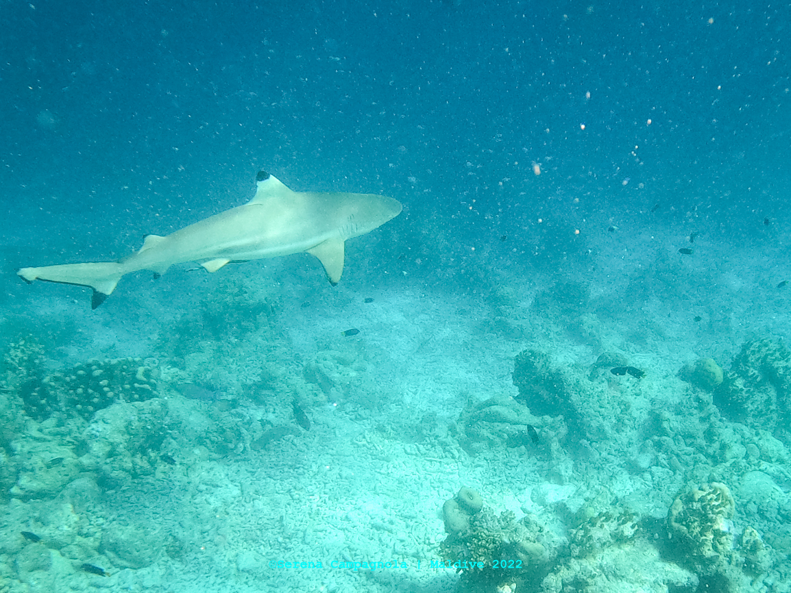 L’isola è ricchissima di pesci, perché appena fuori dal pontile c’è un canale che collega l’Oceano con l’Atollo di Felidhoo. Abbiamo visto quasi tutto: aquile di mare, mobule, squali nutrice, pinna nera e pinna bianca, tartarughe e delfini… Ma non abbiamo visto quello che tanto sognavamo: le mante… Vorrà dire che ci riproveremo un’altra volta.
