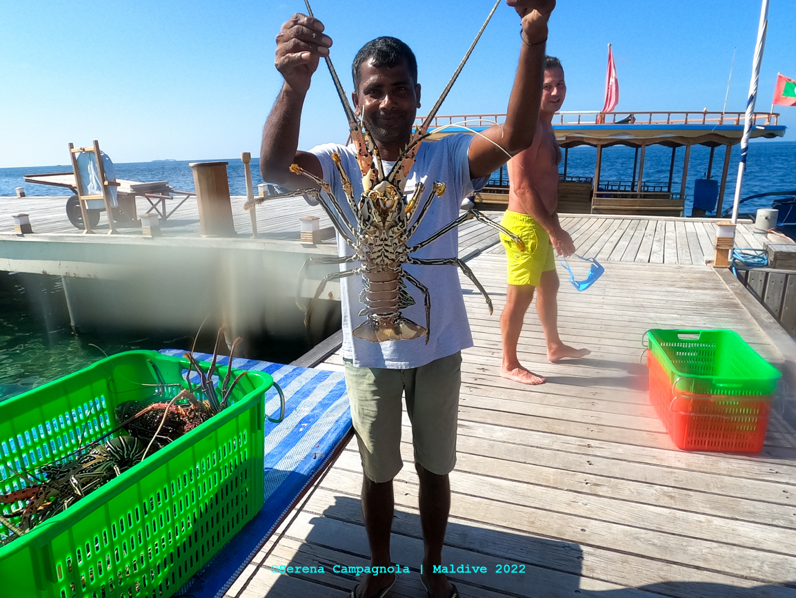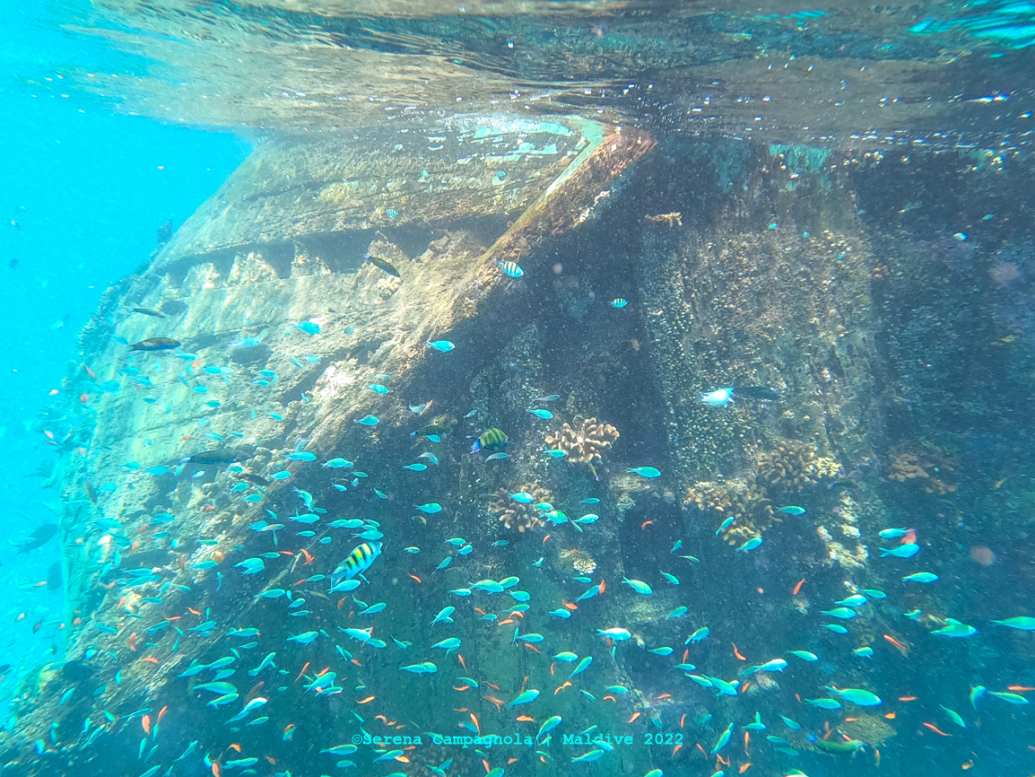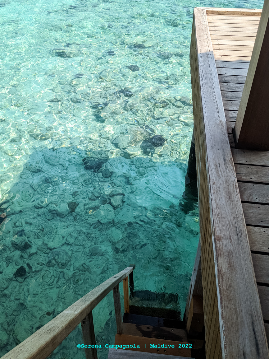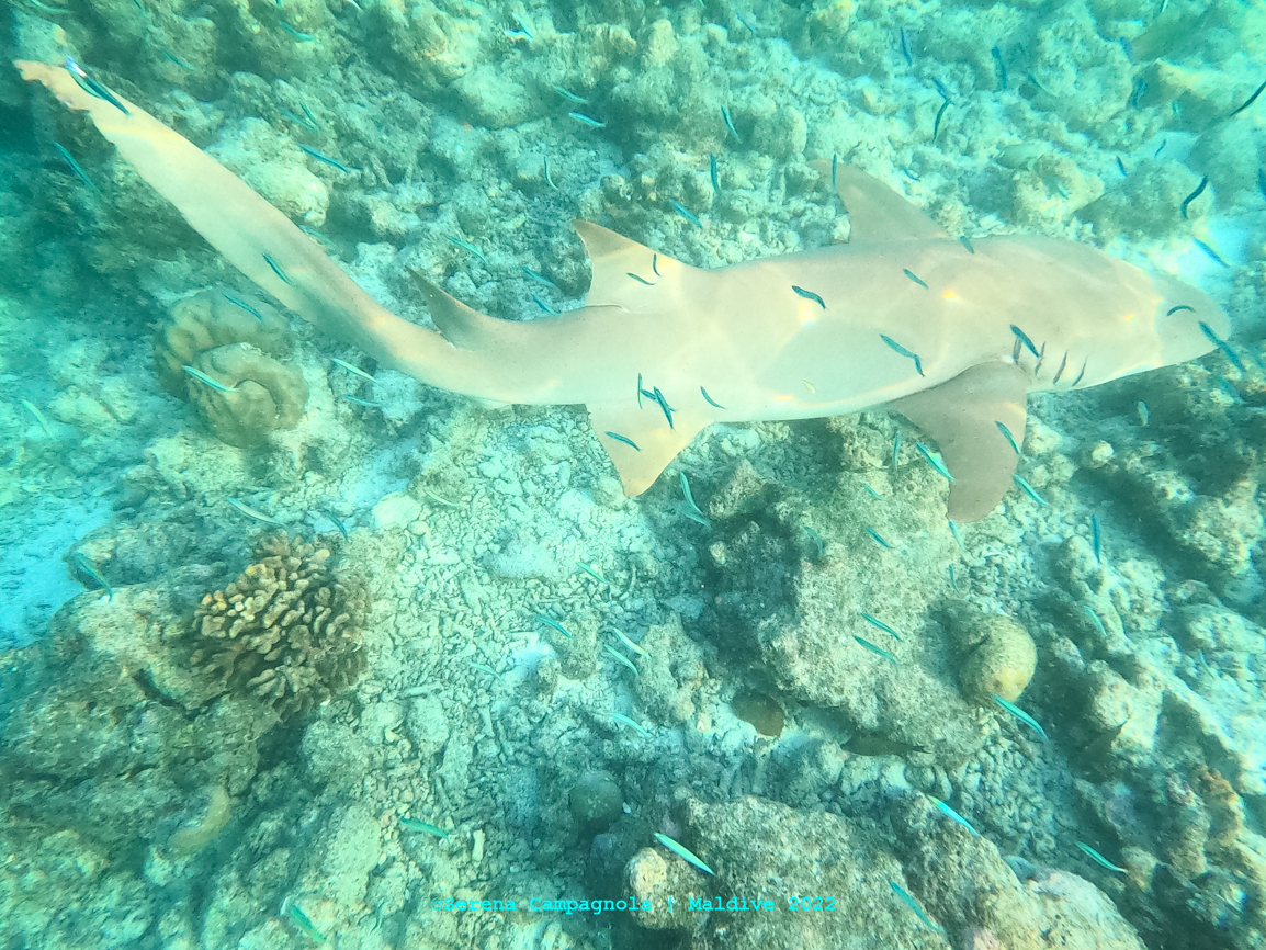 L’isola è ricchissima di pesci, perché appena fuori dal pontile c’è un canale che collega l’Oceano con l’Atollo di Felidhoo. Abbiamo visto quasi tutto: aquile di mare, mobule, squali nutrice, pinna nera e pinna bianca, tartarughe e delfini… Ma non abbiamo visto quello che tanto sognavamo: le mante… Vorrà dire che ci riproveremo un’altra volta.