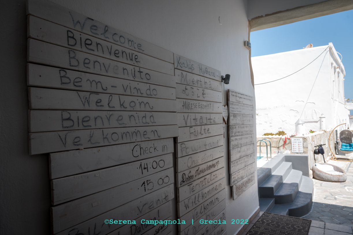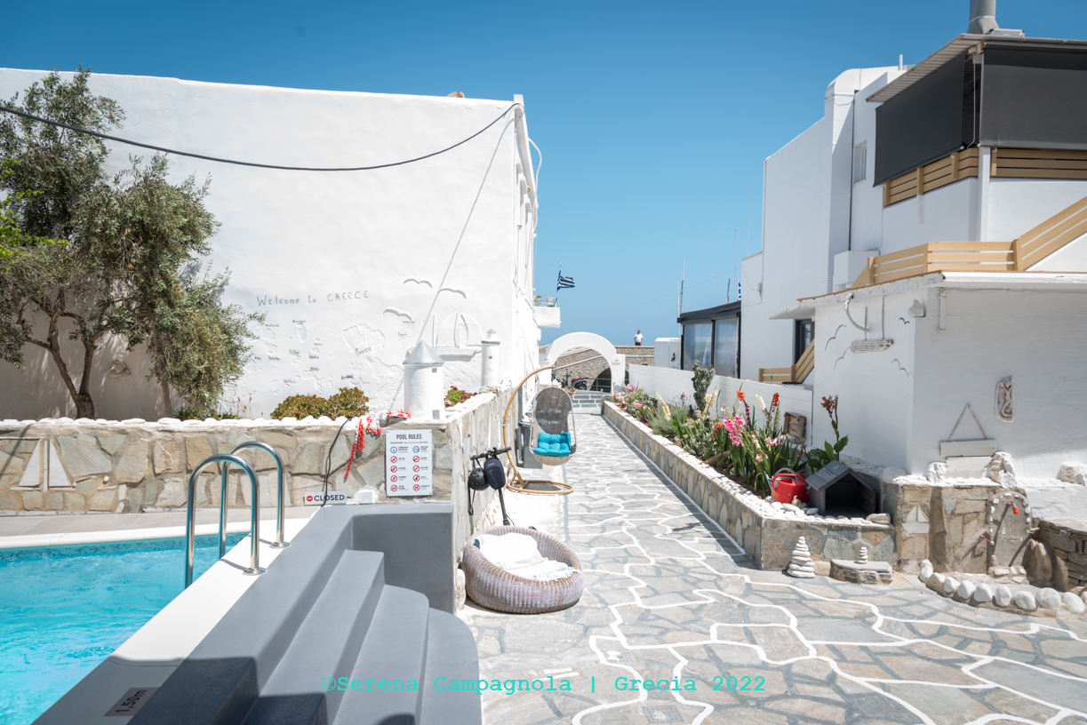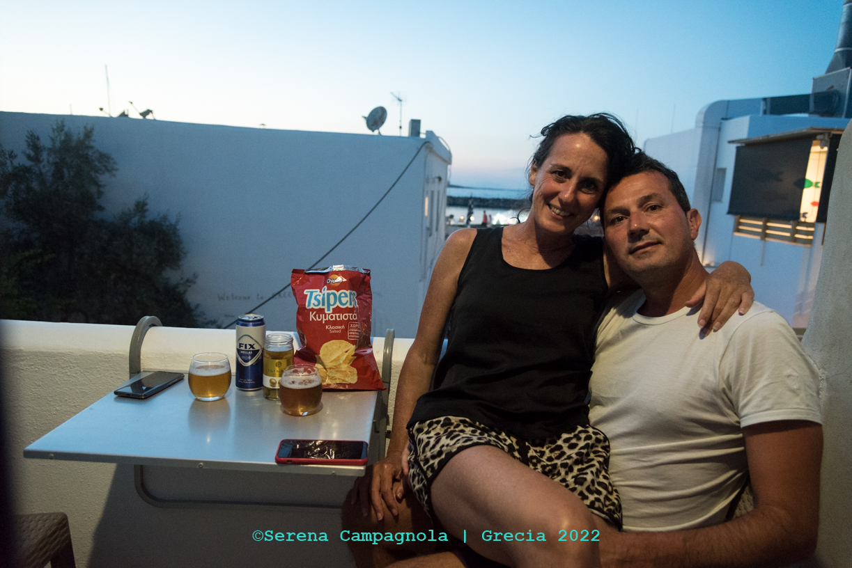 Madaky Hotel. Inizialmente avevo fatto una prenotazione per sole 4 notti ma, quando abbiamo deciso di prolungare la permanenza, la nostra stanza era già occupata. Abbiamo così dovuto cambiare stanza con una un po’ più grande ma senza vista mare (per 3 notti € 216). La famiglia che lo gestisce è disponibile e molto accogliente. Ci siamo trovati divinamente quasi come se fossimo parte della famiglia. La mattina prima di uscire facevamo sempre un briefing con i figli, con cui calcolavamo il Meltemi e le spiagge migliori in base al vento. L’8 giugno, chiacchierando, ho detto alla titolare che era il nostro quarto anniversario di matrimonio. Tornati in stanza la sera abbiamo trovato un piccolo pensiero di artigianato locale.