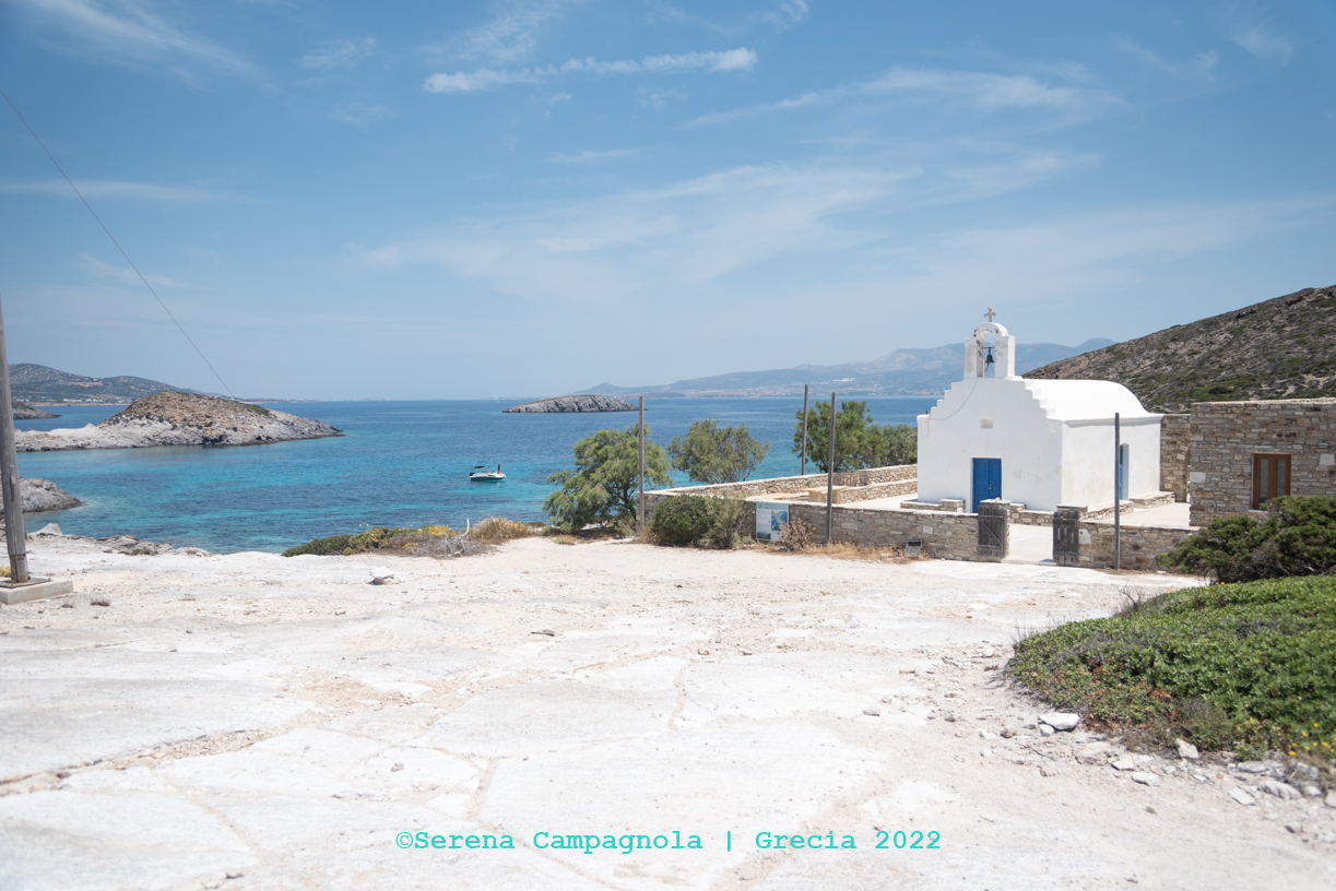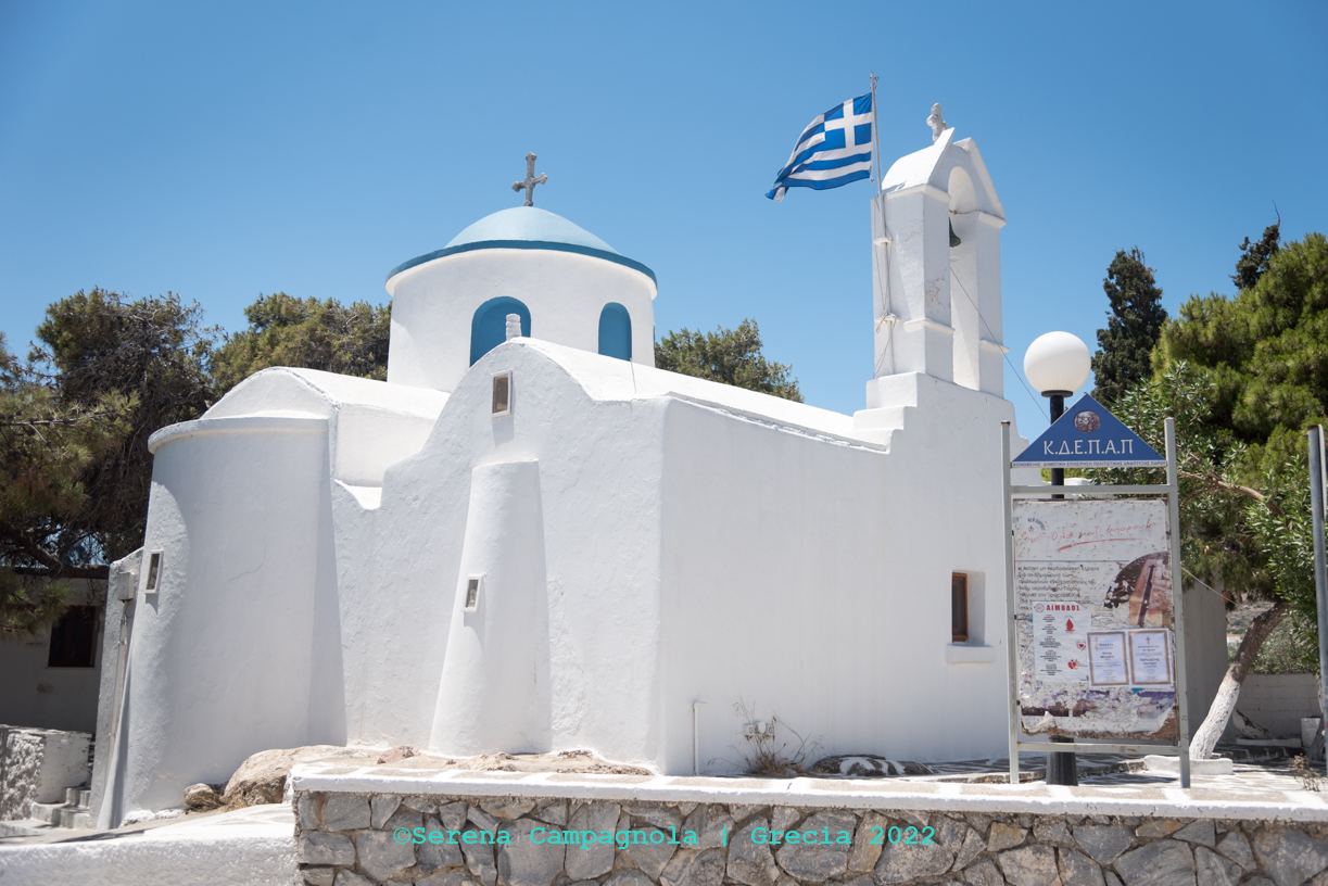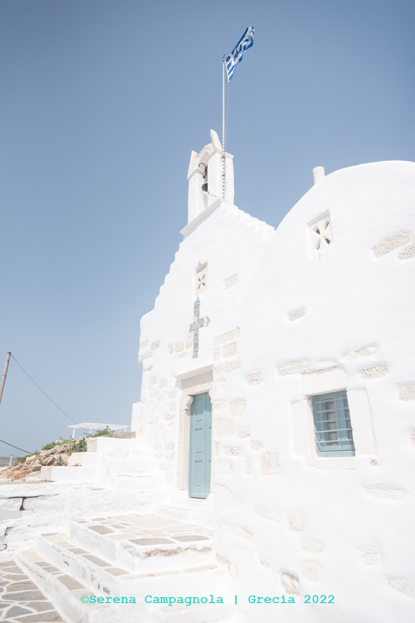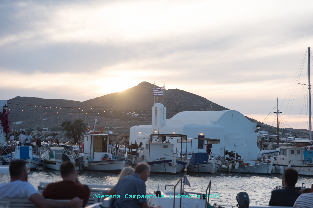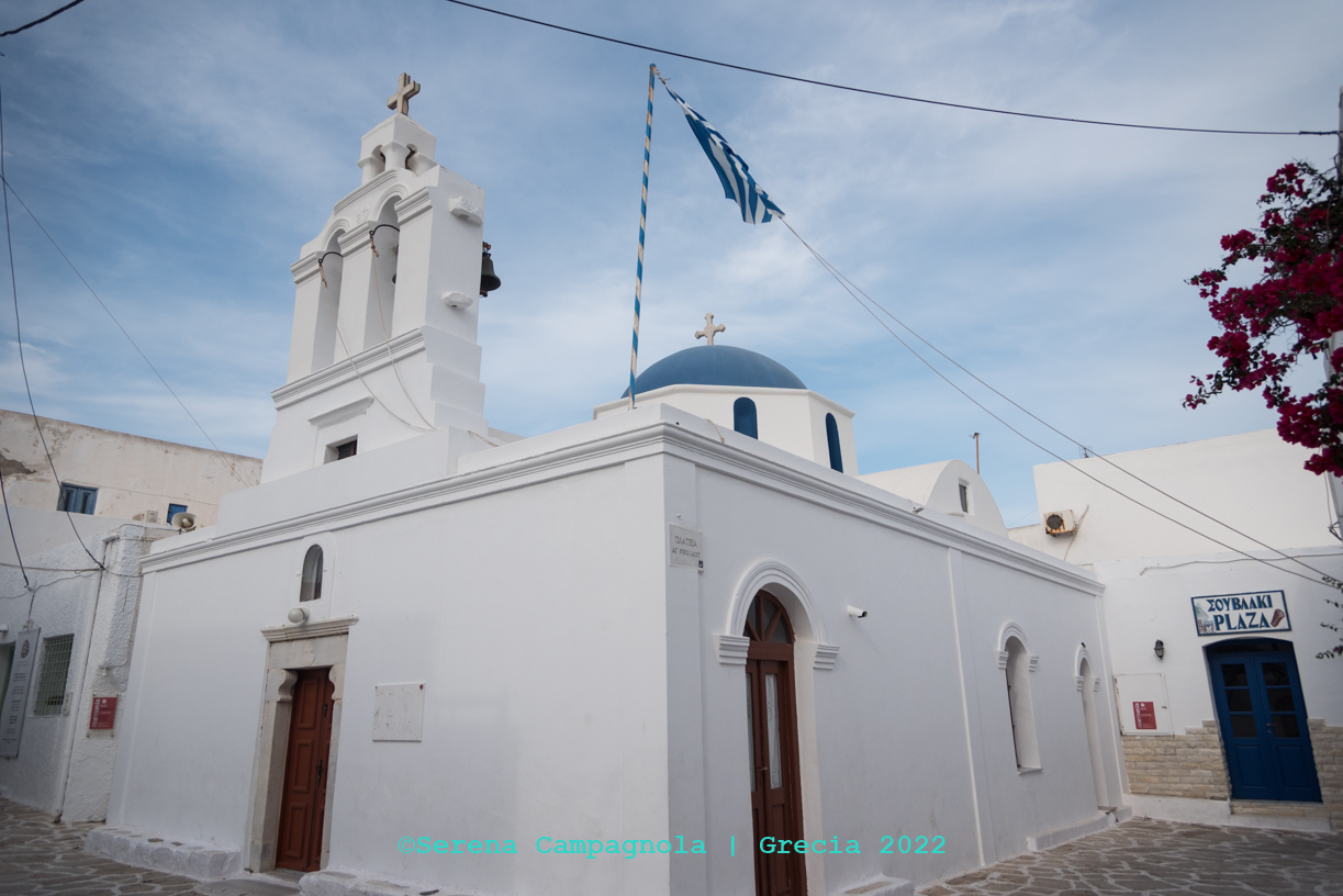 Rientrando da Santa Maria, abbiamo notato una chiesa che secondo me ha una vista pazzesca su Naoussa e il suo golfo, purtroppo c’è un cartello che indica una proprietà privata e così ci siamo fermati al cancello. Ci siamo tornati il giorno successivo poco prima del tramonto.