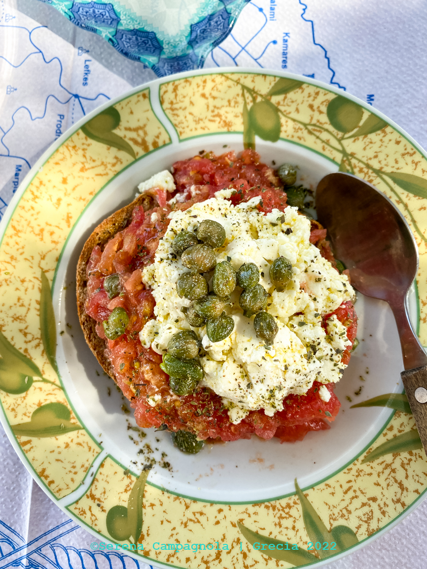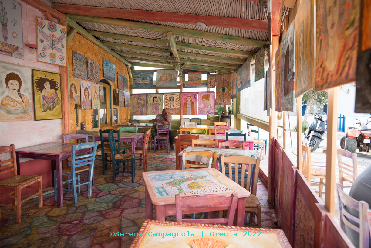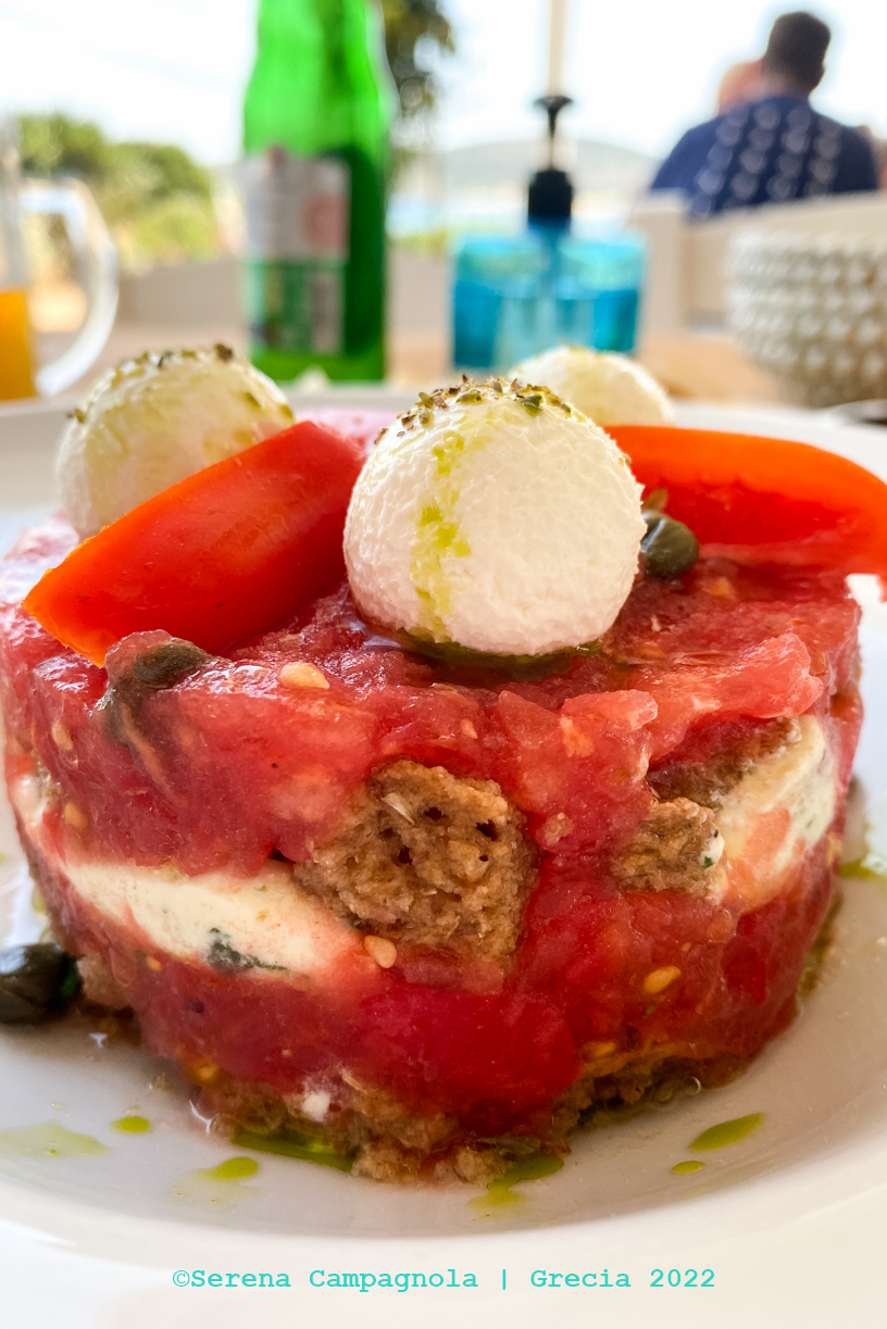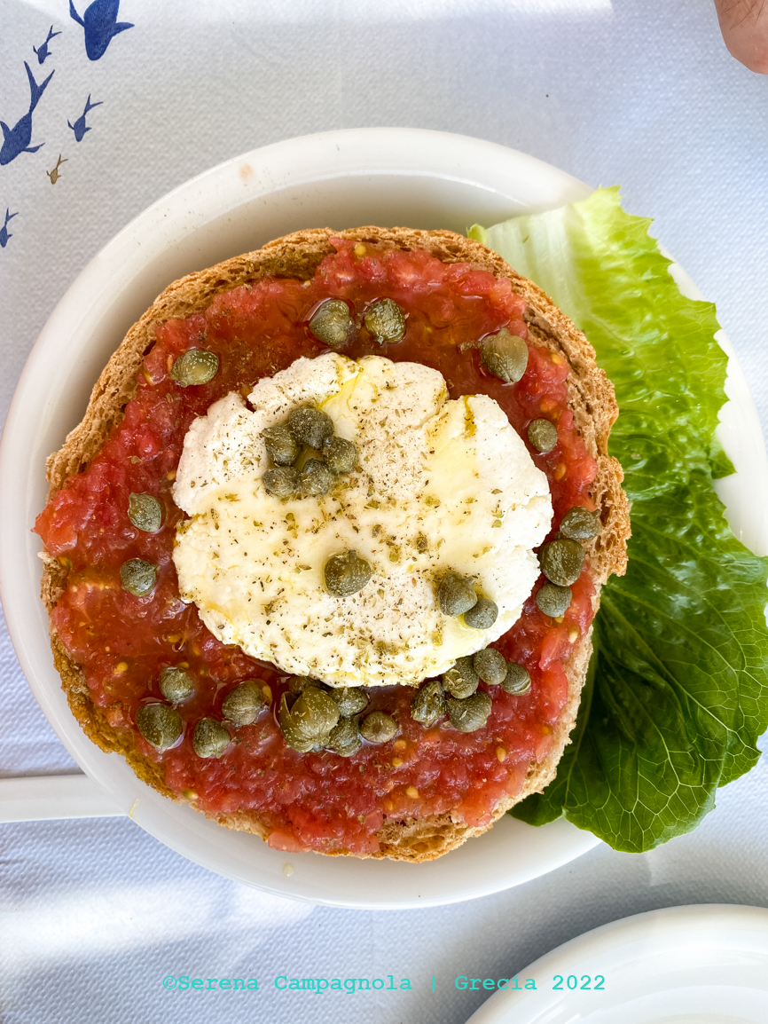Il giorno che siamo andati a Monastri abbiamo fatto uno spuntino alla Taberna Vigla dove abbiamo preso due birre, una porzione di patatine fritte e un dakos con formaggio locale. Il tutto per € 17. Ci siamo trovati bene e siamo tornati per un altro pranzetto. Io ho preso un Dakos e Leo un aubergine imam, pane, due birre, conto totale € 22.