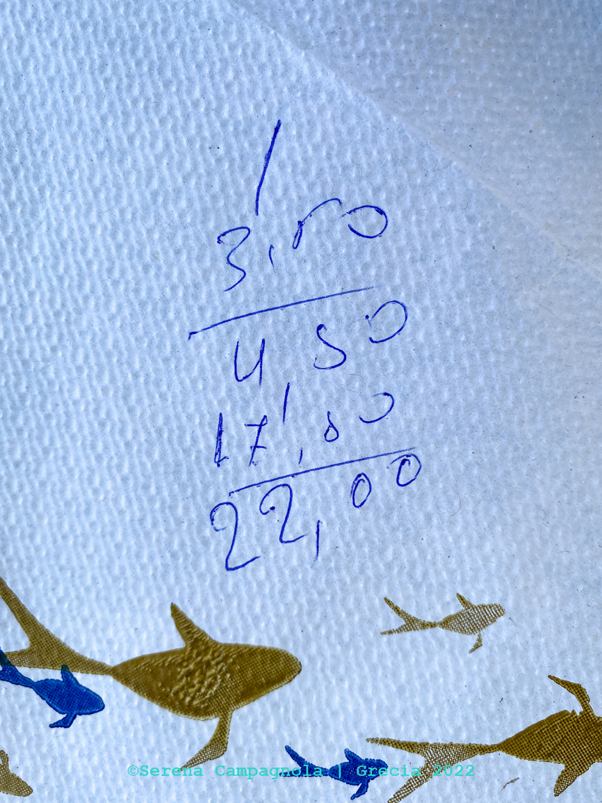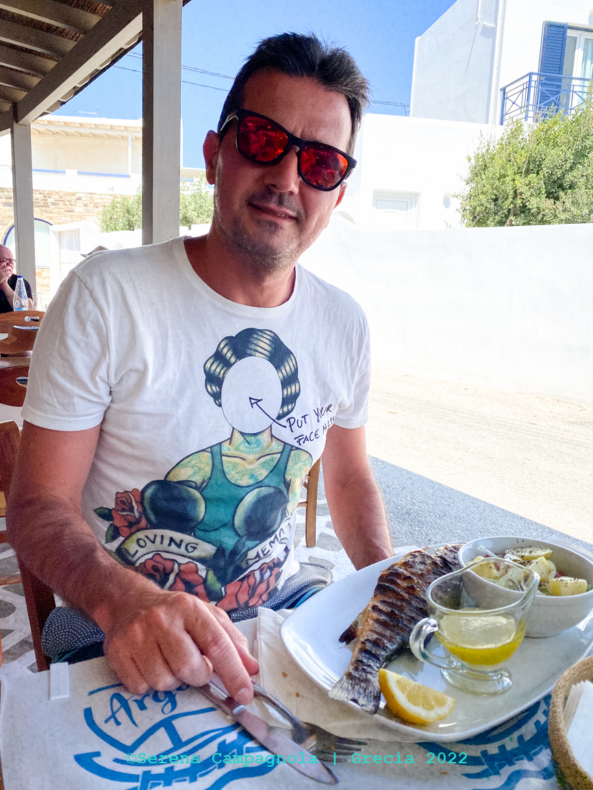 Uno dei due giorni ad Antiparos ci siamo fermati per cena e siamo andati da Argo (ve ne ho già parlato sopra per un pranzo). Il locale lo avevo trovato per caso perché mi era venuta l’idea di trascorrere una notte ad Antiparos e, leggendo le recensioni delle camere su Booking, ho capito che il ristorante meritasse. La nostra esperienza lo ha confermato! Abbiamo preso il polpo condito con olio e aceto (spettacolare), io i gamberoni alla griglia, Leo la Moussaka, una birra, un’acqua (conto totale € 45).