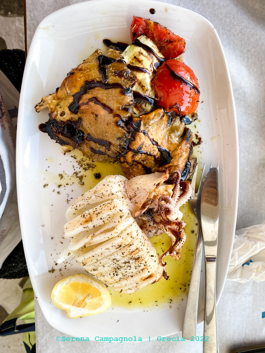 L’altro giorno trascorso ad Antiparos per pranzo abbiamo scelto Argo (ci siamo andati anche per cena), dove ci siamo concessi del buonissimo pesce. Come antipasto un piatto di alici marinate, poi io ho preso un calamaro alla griglia con verdure grigliate e Leo ha preso una spigola grigliata con insalatina, due birre, due caffè per un conto totale di € 58. Tutto quello che abbiamo mangiato era superlativo. Il mio calamaro pazzesco.
