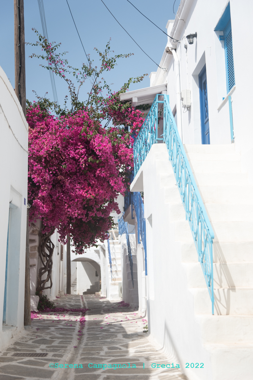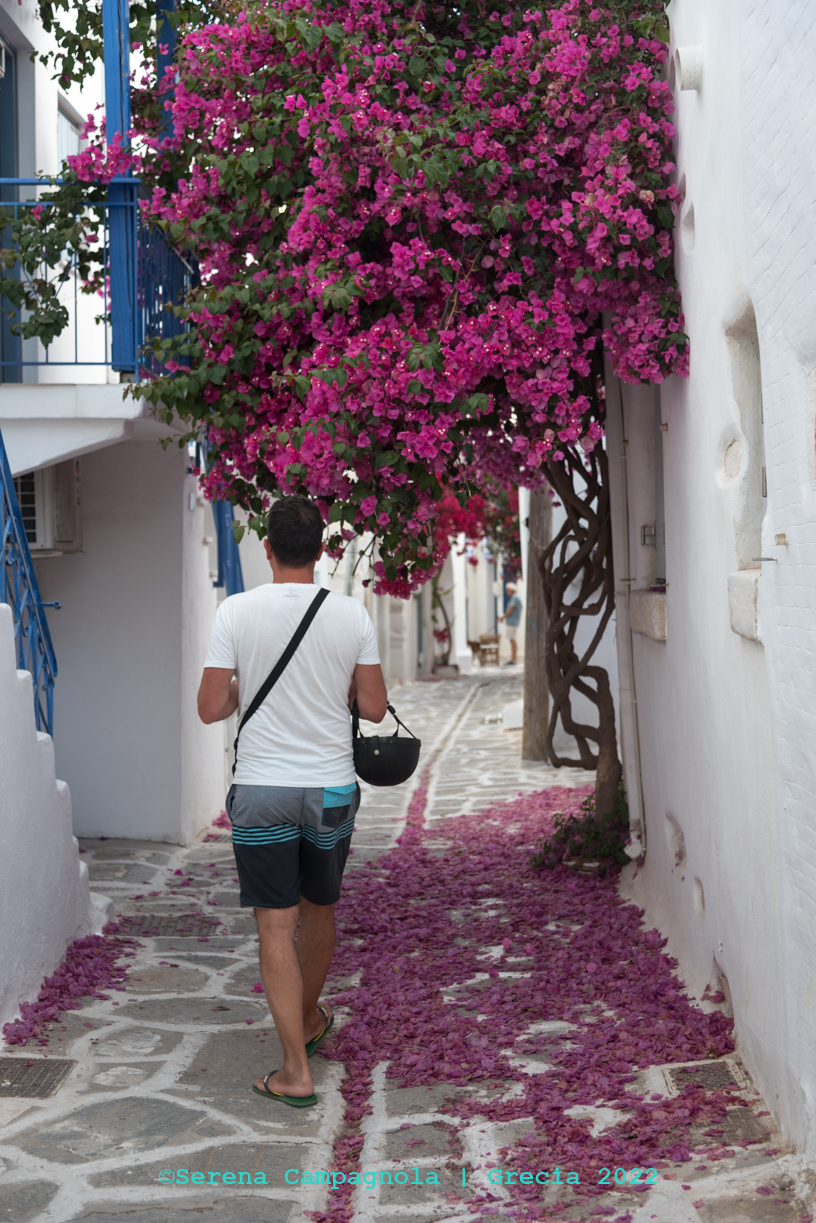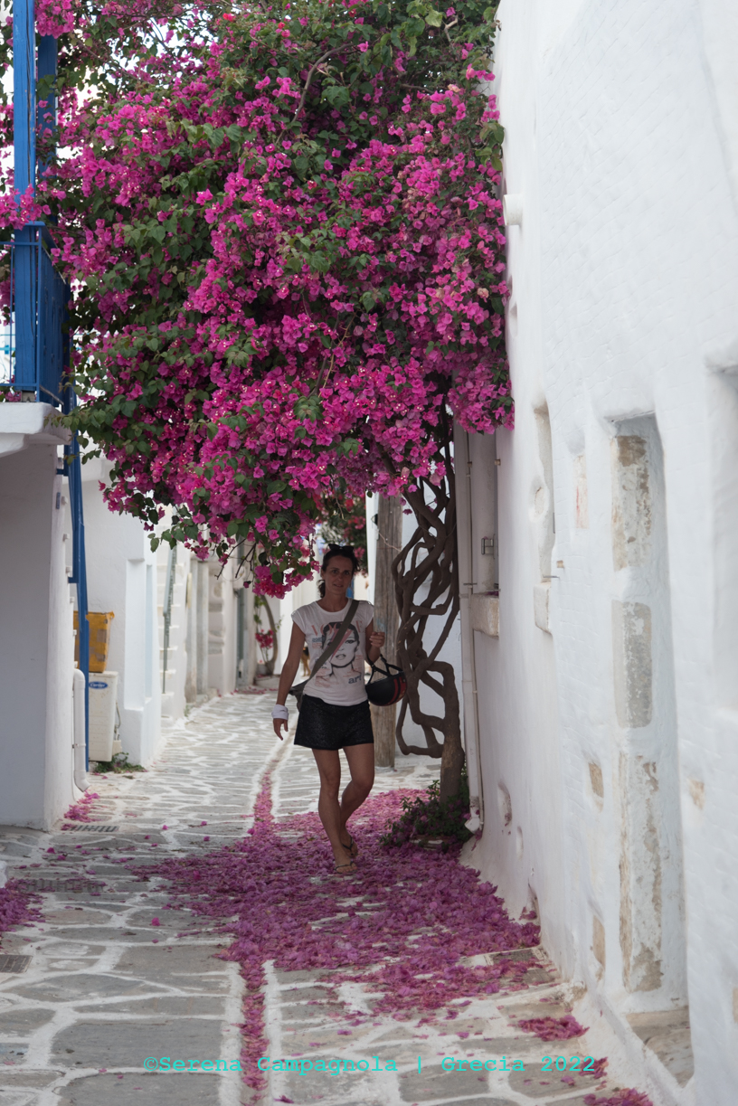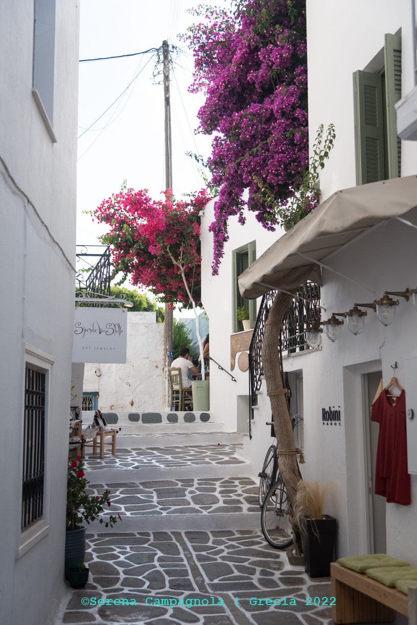 La giornata trascorsa a Marcelo Beach l’abbiamo intervallata con una breve visita a Paroikia (o Parikia). Il capoluogo dell’isola è un affascinante borgo di case bianche e vicoli labirintici adorni di fiori (abbiamo trovato scorci con bouganville in fiore spettacolari). Parikia ha anche una città vecchia con i resti del kastro. Consiglio di perdervi tra i vicoli che vi regaleranno splendidi scorci, curiosando tra negozi e taverne. Qui si passeggia solo a piedi ed è davvero piacevole.