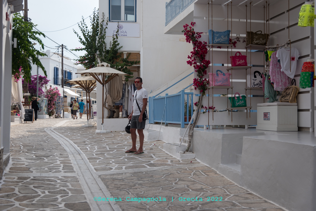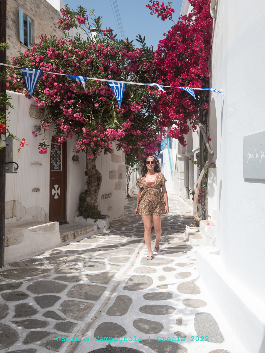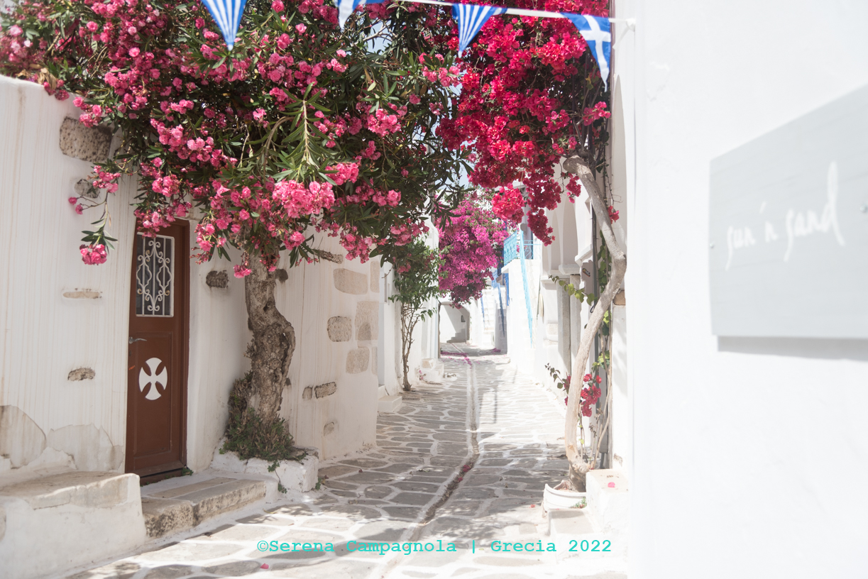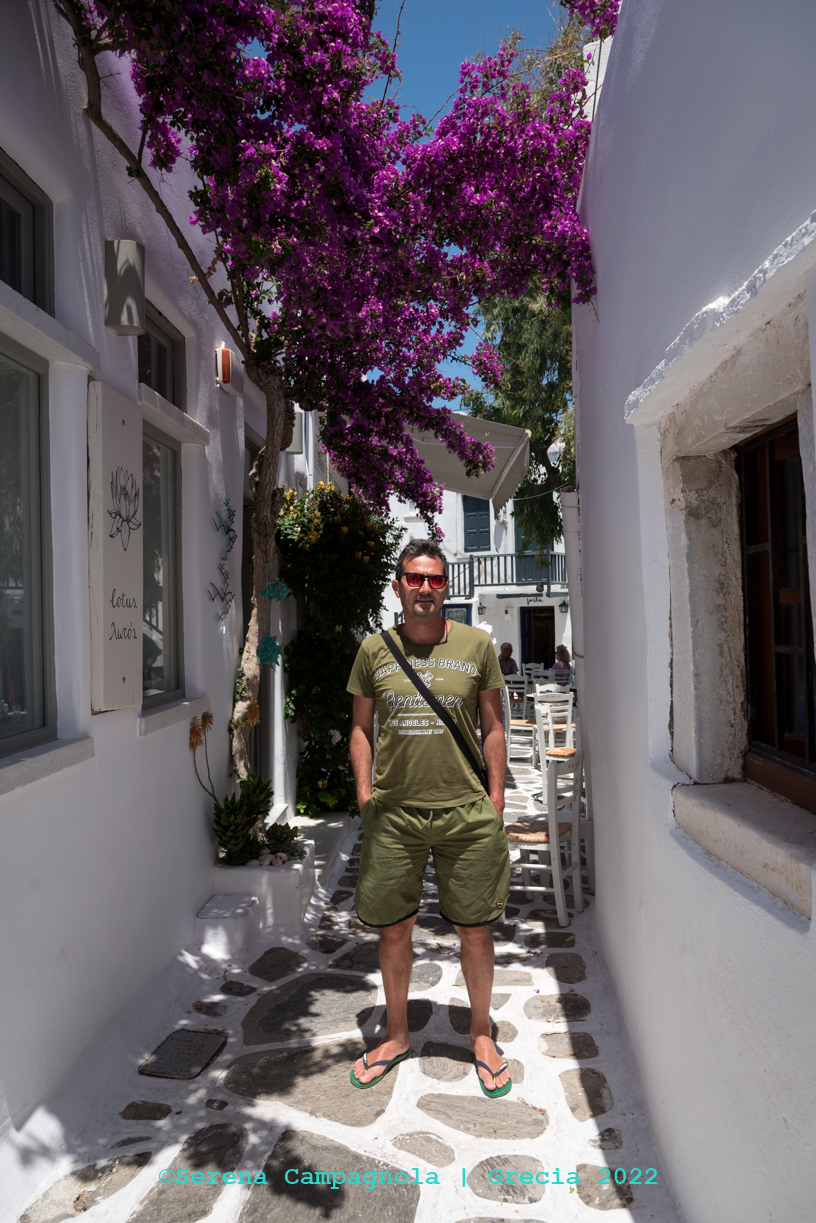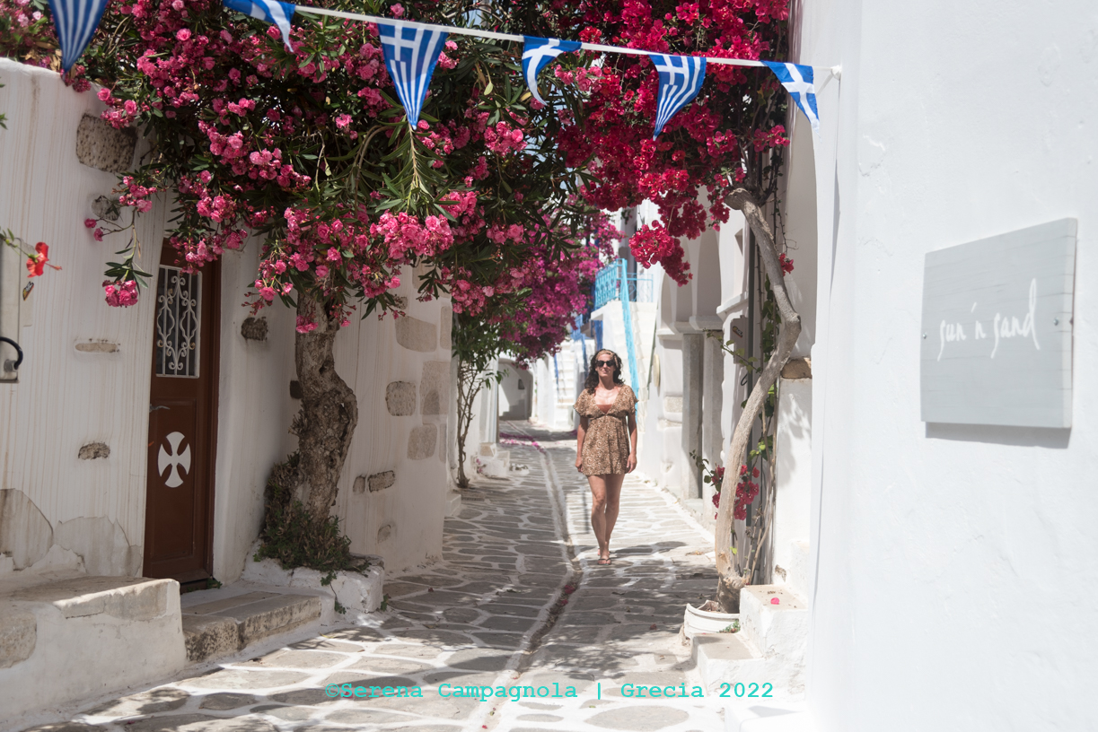 La giornata trascorsa a Marcelo Beach l’abbiamo intervallata con una breve visita a Paroikia (o Parikia). Il capoluogo dell’isola è un affascinante borgo di case bianche e vicoli labirintici adorni di fiori (abbiamo trovato scorci con bouganville in fiore spettacolari). Parikia ha anche una città vecchia con i resti del kastro. Consiglio di perdervi tra i vicoli che vi regaleranno splendidi scorci, curiosando tra negozi e taverne. Qui si passeggia solo a piedi ed è davvero piacevole.