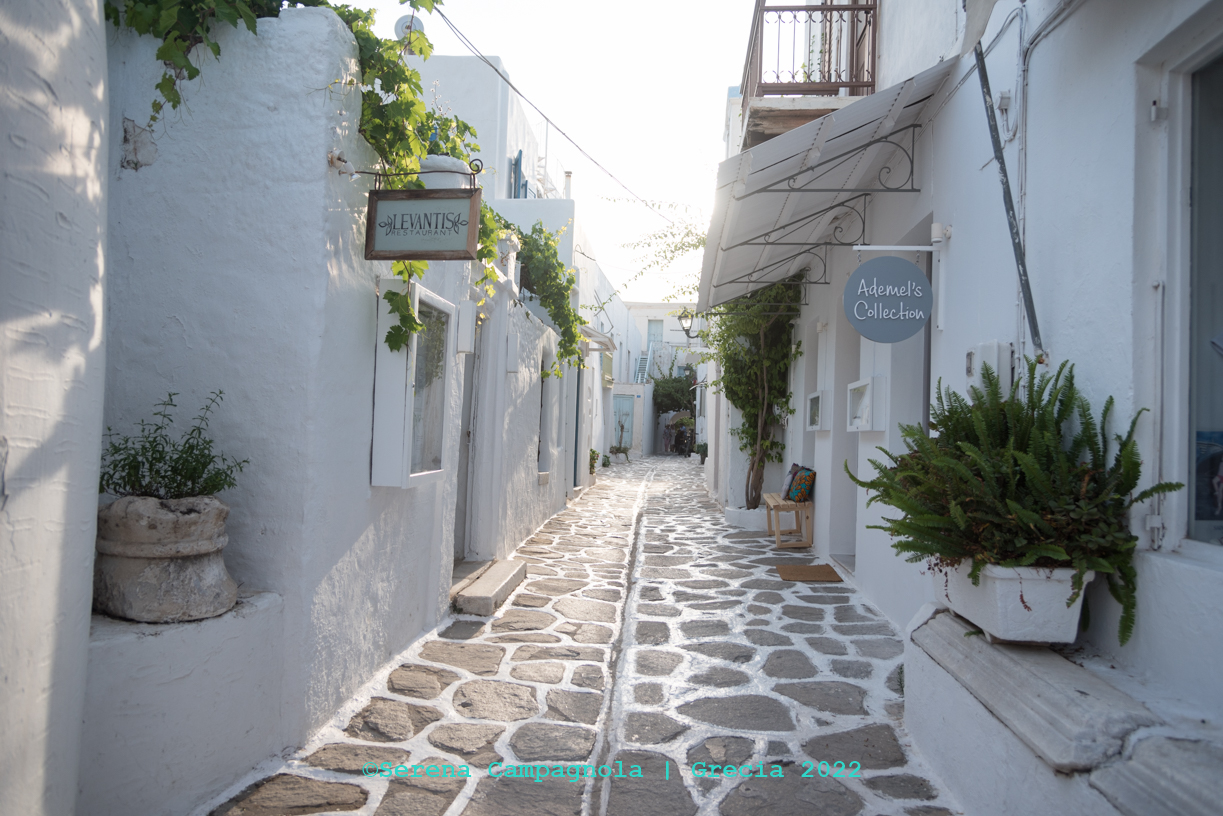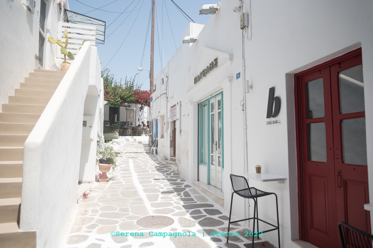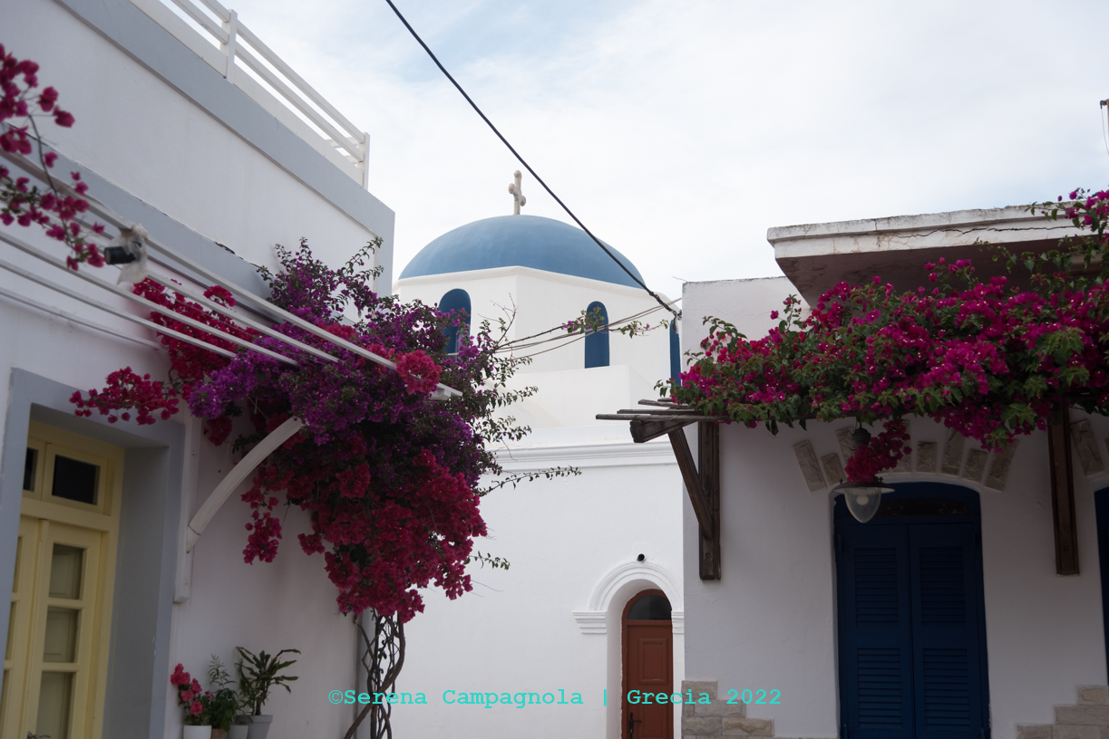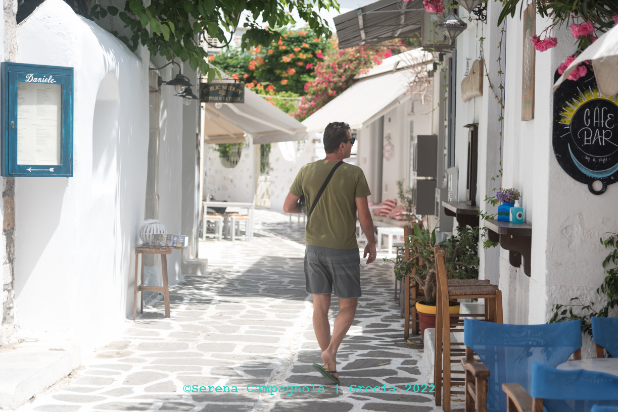 La giornata trascorsa a Marcelo Beach l’abbiamo intervallata con una breve visita a Paroikia (o Parikia). Il capoluogo dell’isola è un affascinante borgo di case bianche e vicoli labirintici adorni di fiori (abbiamo trovato scorci con bouganville in fiore spettacolari). Parikia ha anche una città vecchia con i resti del kastro. Consiglio di perdervi tra i vicoli che vi regaleranno splendidi scorci, curiosando tra negozi e taverne. Qui si passeggia solo a piedi ed è davvero piacevole.