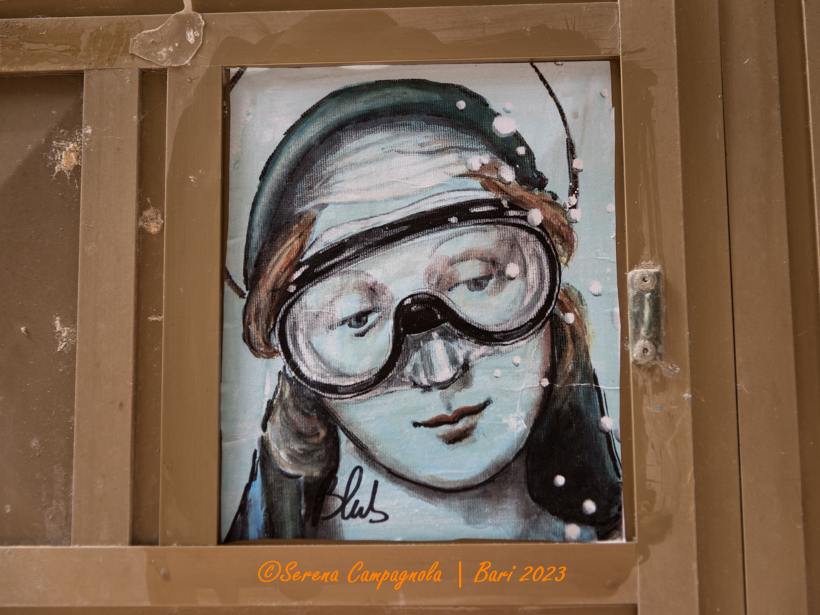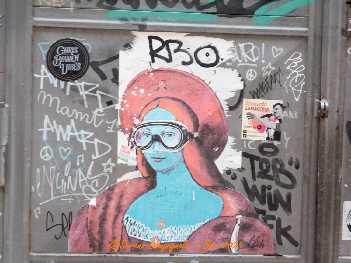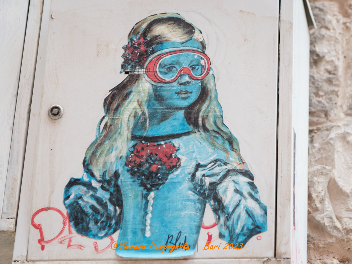 Come già mi era successo alle Cinque Terre, ad Amalfi, a Cremona, a Siena e San Gimignano, anche a Bari ho riconosciuto moltissime opere di Blub. Riconoscerle è semplicissimo tanto è originale il suo stile: lo sfondo è quasi sempre azzurro come il mare, mentre i protagonisti sono personaggi di grandi opere o grandi artisti del passato che indossano una maschera per immersioni subacquee.