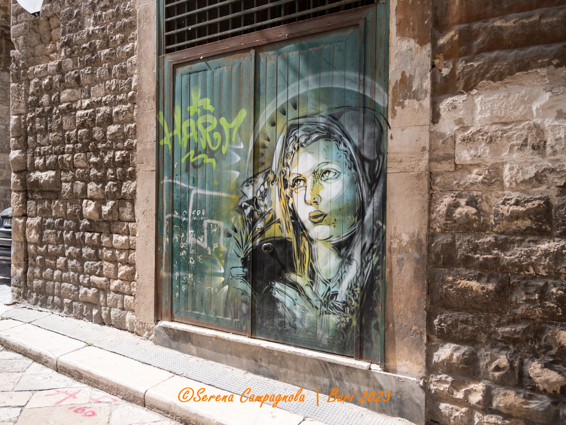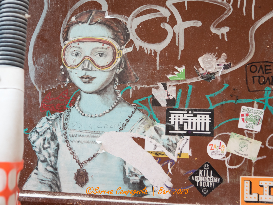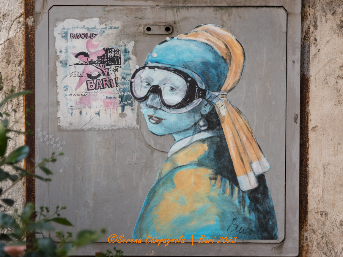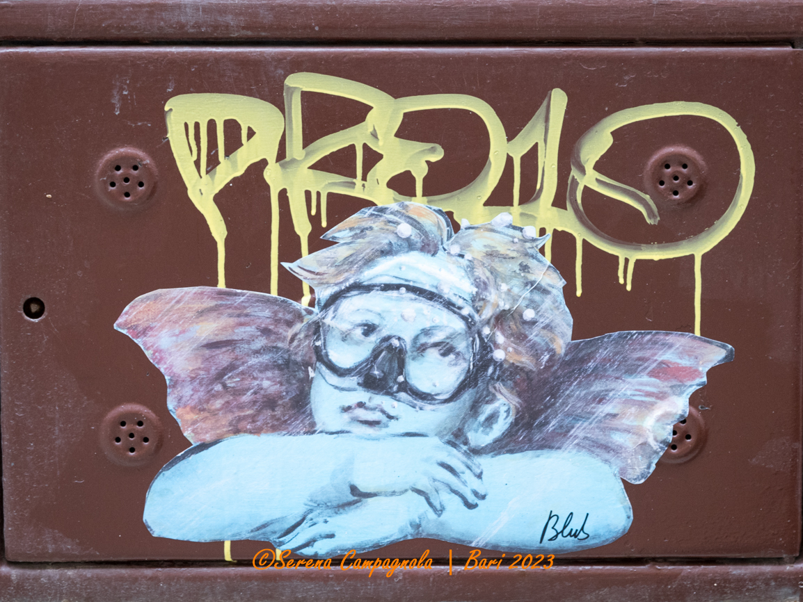 Come già mi era successo alle Cinque Terre, ad Amalfi, a Cremona, a Siena e San Gimignano, anche a Bari ho riconosciuto moltissime opere di Blub. Riconoscerle è semplicissimo tanto è originale il suo stile: lo sfondo è quasi sempre azzurro come il mare, mentre i protagonisti sono personaggi di grandi opere o grandi artisti del passato che indossano una maschera per immersioni subacquee.