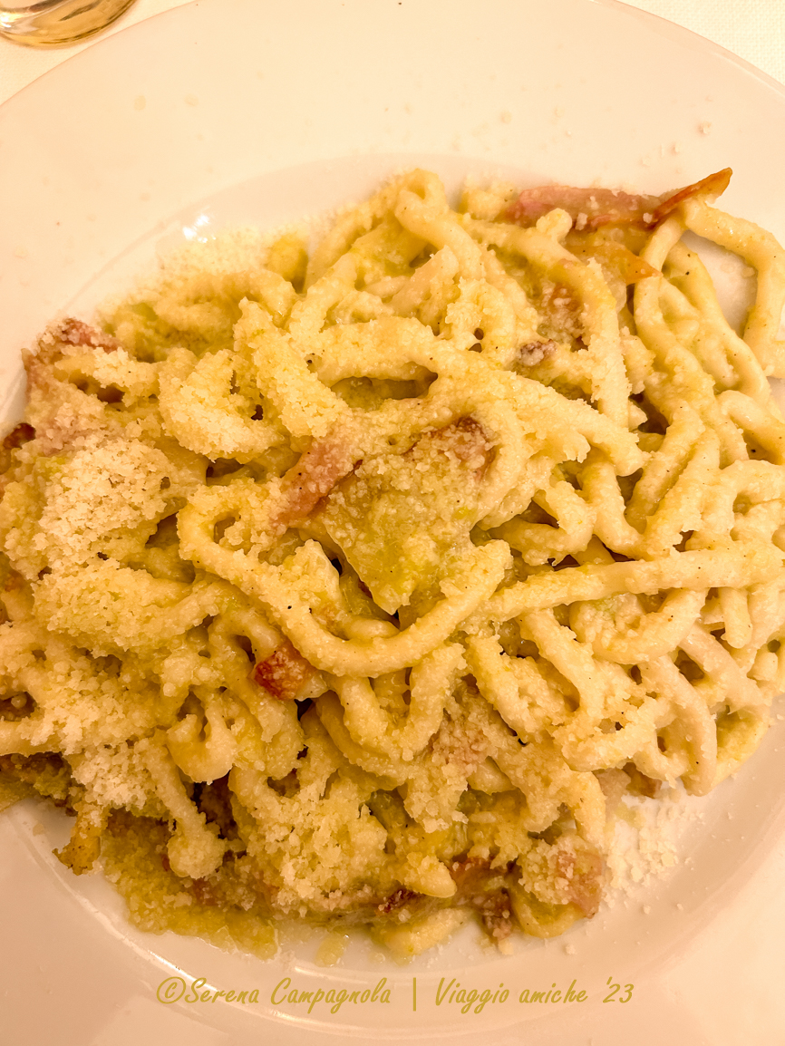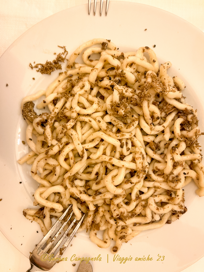 Per la seconda cena abbiamo prenotato un tavolo alla Trattoria L’Oste del Re (Via del Duomo, 9), dove abbiamo preso: un antipasto, umbrichelli al ragù, umbrichelli al tartufo, stracotto di Suino Cinta Senese, stracotto di Manzo di razza Chianina, un dolcetto, vino, birra, acqua (spesa totale € 88). Devo dire che abbiamo mangiato moooolto bene!!! La titolare veramente molto simpatica e accogliente, era incuriosita da 4 donne non più giovanissime in giro da sole…