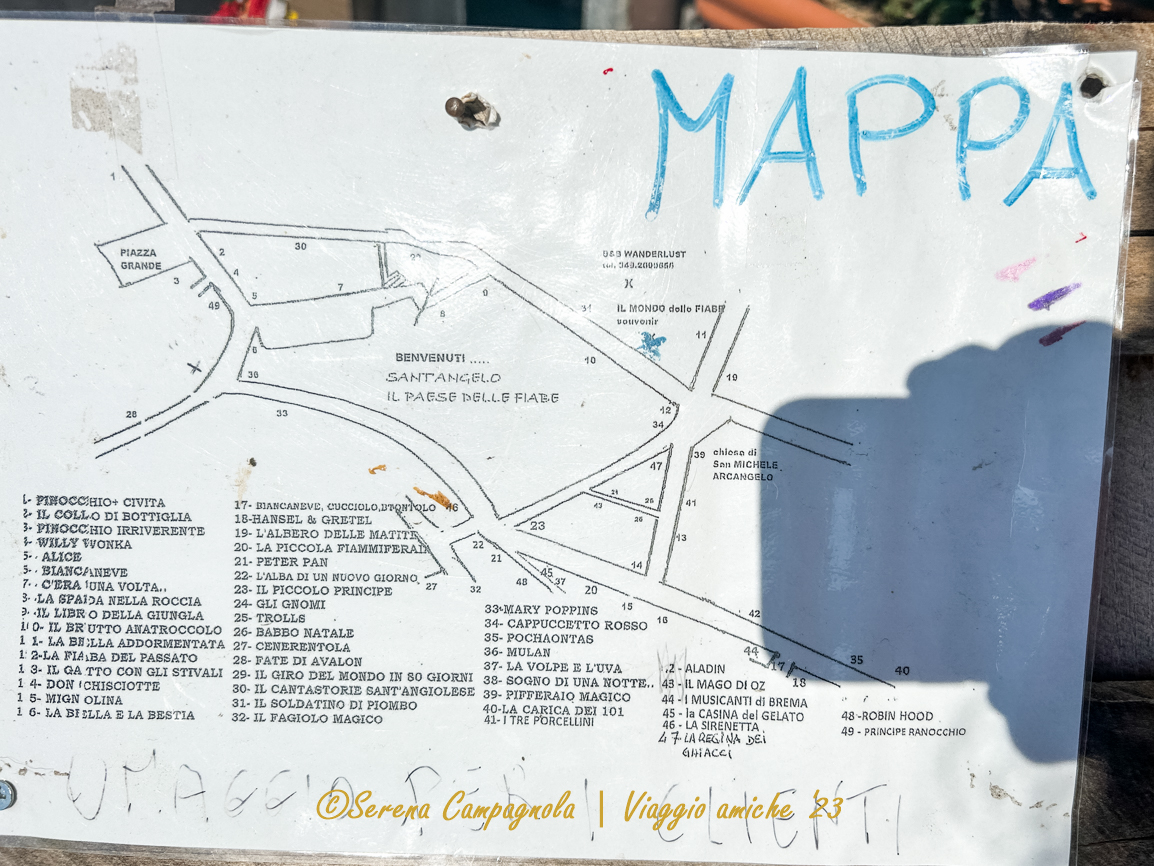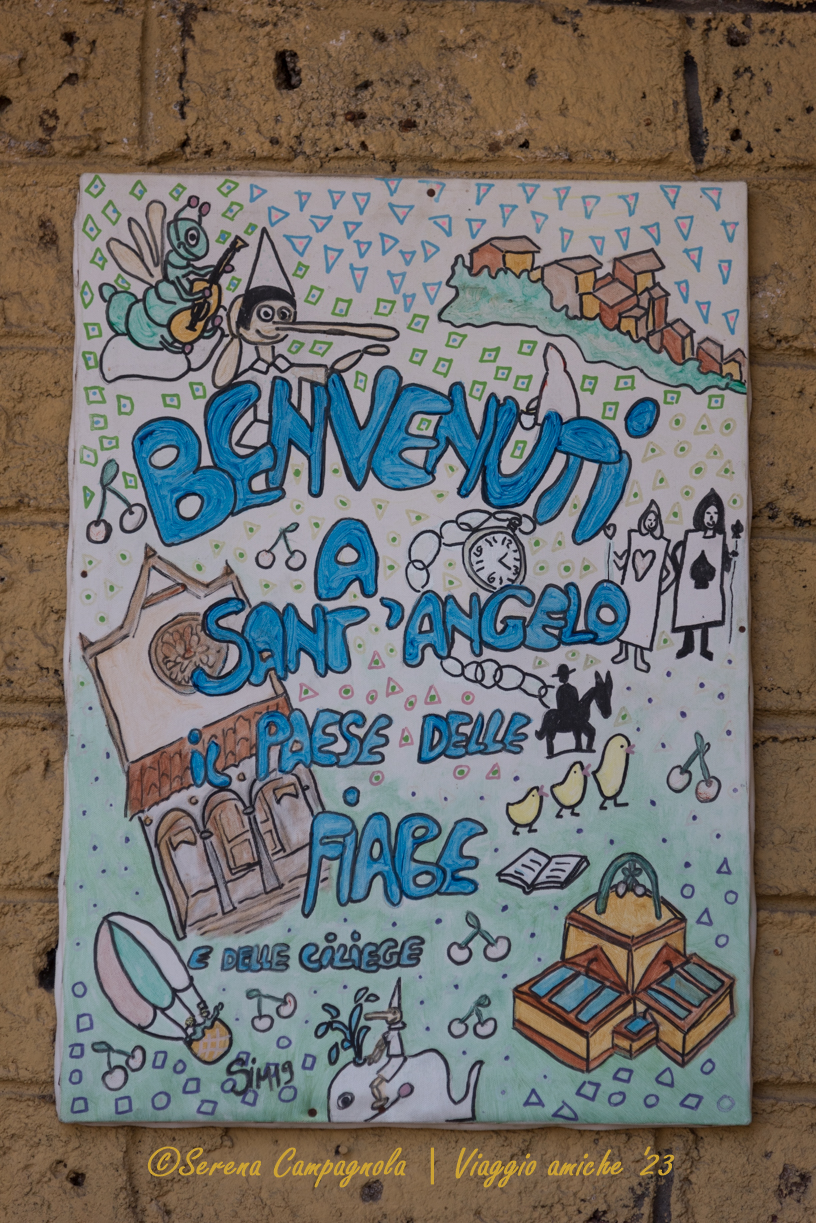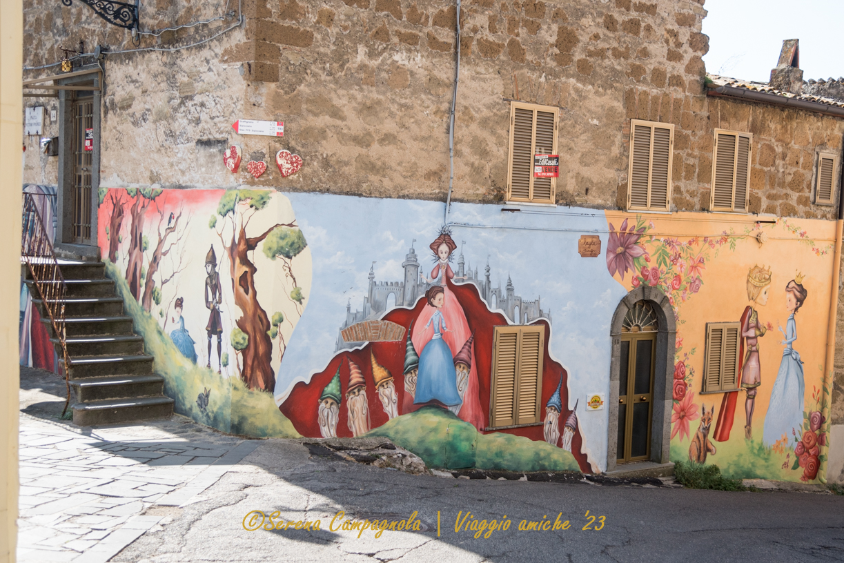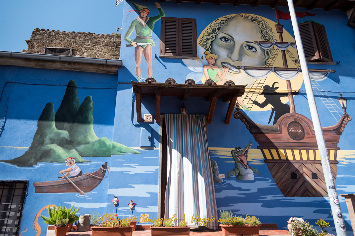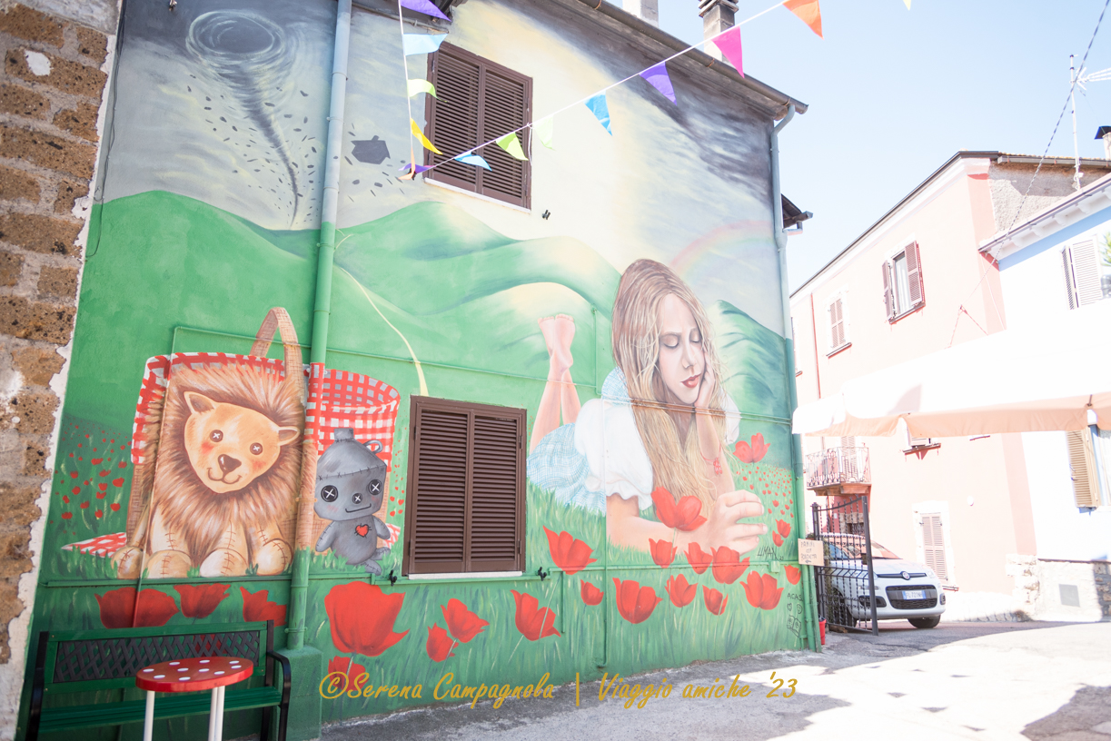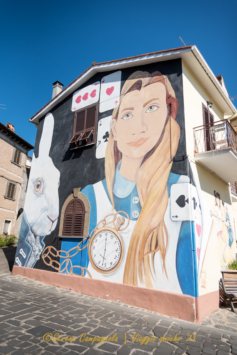 Il paese delle fiabe esiste e si tratta di una piccola frazione del Comune di Viterbo, abitata da poco più di cento persone, soprattutto anziani. Si sapeva poco di questo borgo sperduto, dimenticato fino a pochi anni fa. Infatti, nel 2017, è partito un progetto dell’Associazione culturale ACAS, diretta dai fratelli Gianluca e Paola Chiovelli, il cui obiettivo è la riqualificazione e il rilancio di Sant’Angelo, paese d’origine dei loro nonni. Nasce così l’idea di creare un museo a cielo aperto, con murales, installazioni e mosaici dedicati al mondo delle fiabe. Il 27 novembre 2017 arriva la prima opera a colorare la facciata di un’abitazione: è Alice nel paese delle meraviglie, con Bianconiglio e il suo immancabile orologio da taschino.