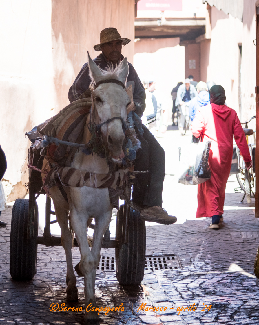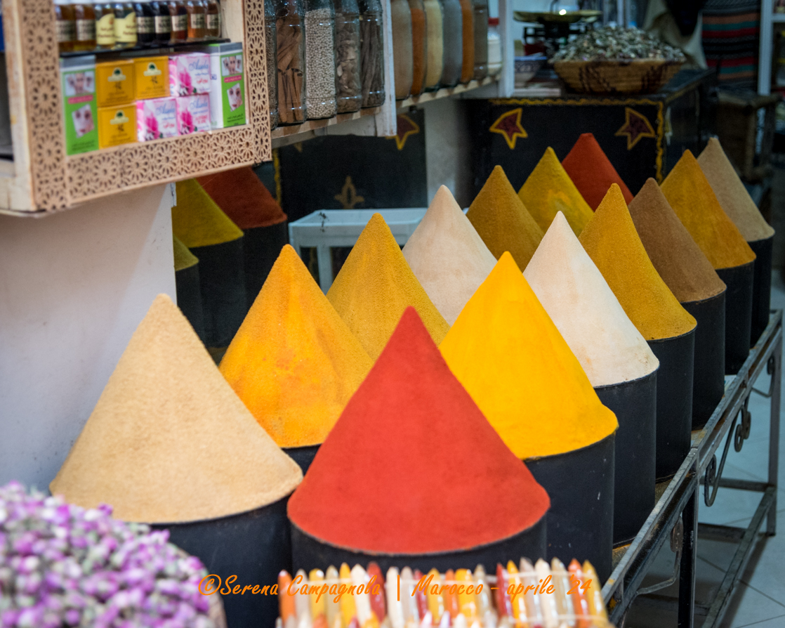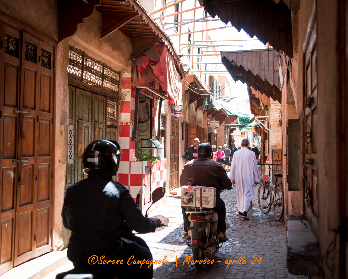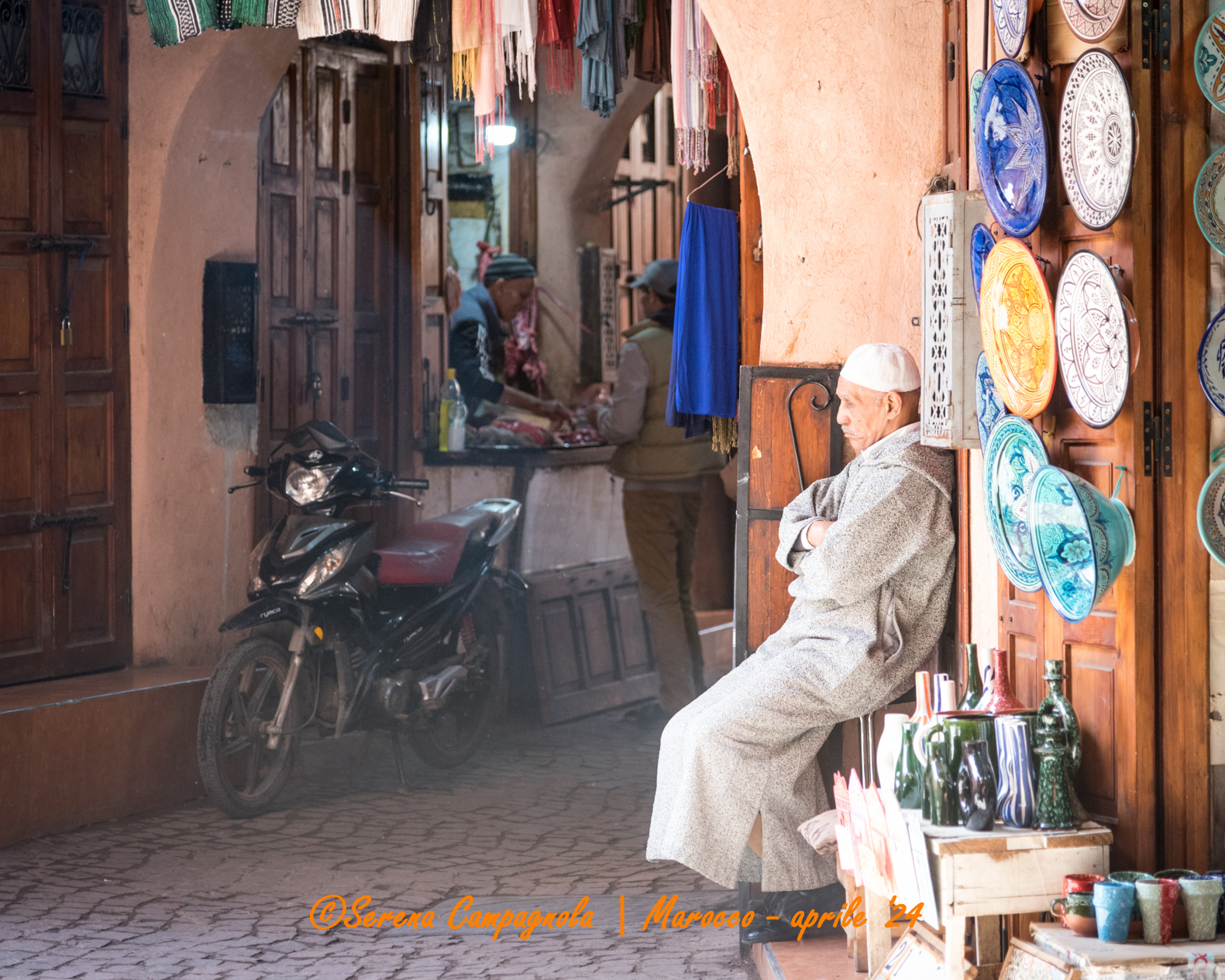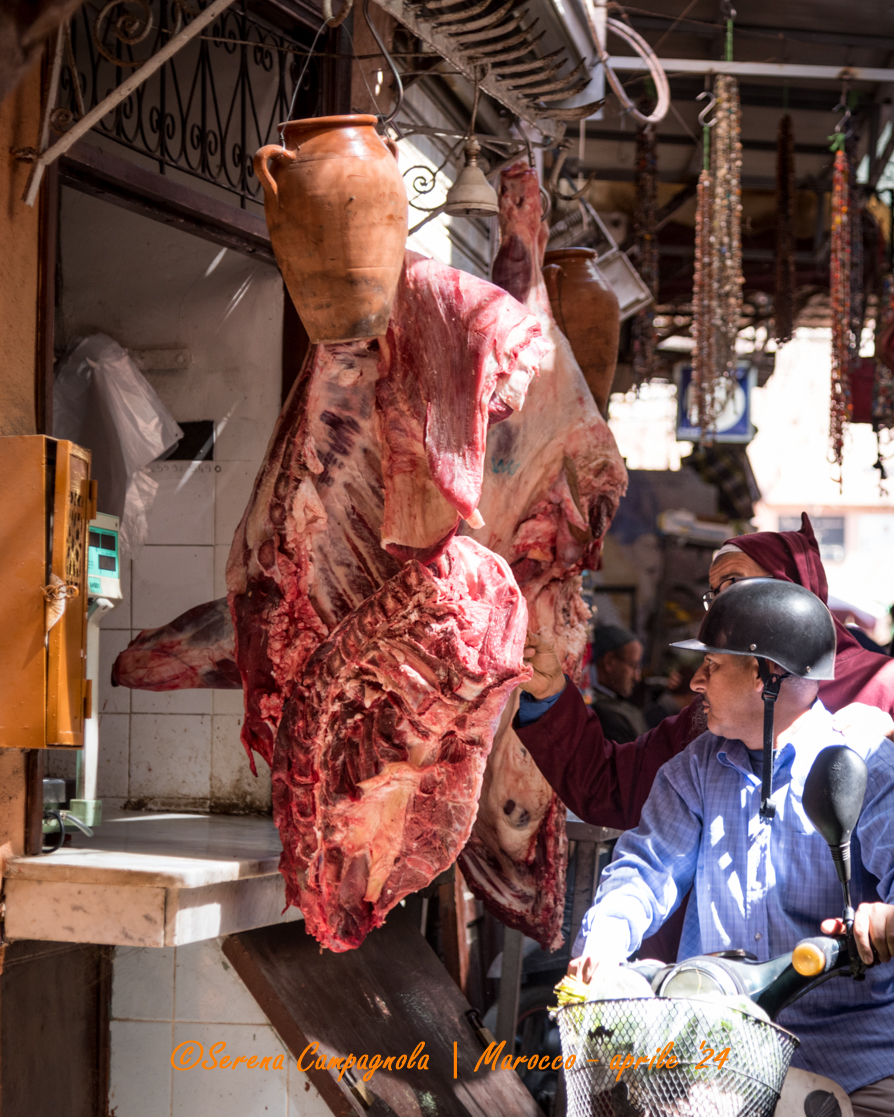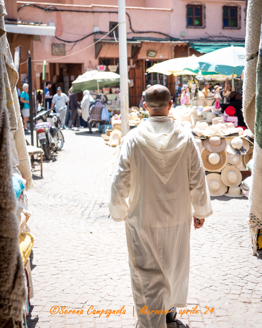 I souk di Marrakech possono sembrare stressanti ma io li adoro. Amo i mercati di tutto il mondo: mi piace farmi guidare dai profumi del cibo e delle spezie, dai colori delle stoffe e dei tappeti, dal brusio e dal caos che li caratterizzano. Senza accorgervene, sarete risucchiati in un dedalo di viuzze e vi ritroverete a vagare all’interno di questo labirinto fatto di incroci infiniti, dove spesso passano delle motociclette e mezzi di trasporto bizzarri. I negozianti sono quasi sempre sull’uscio dei loro negozi, pronti a invitarvi a entrare appena il vostro sguardo distrattamente sfiorerà qualcosa in esposizione. Vi cattureranno cercando di indovinare la vostra provenienza, facendovi mille complimenti soprattutto se siete donne, offrendovi un the alla menta di benvenuto. Non è facile sfuggire ai loro modi accattivanti, preparatevi a dire tantissimi “No, grazie!”. Io in cambio chiedevo di poterli fotografare e spesso la risposta era una mano davanti al volto.