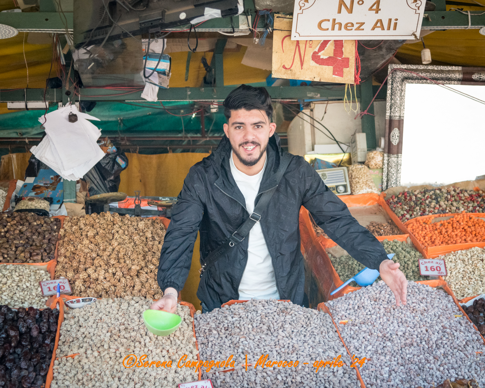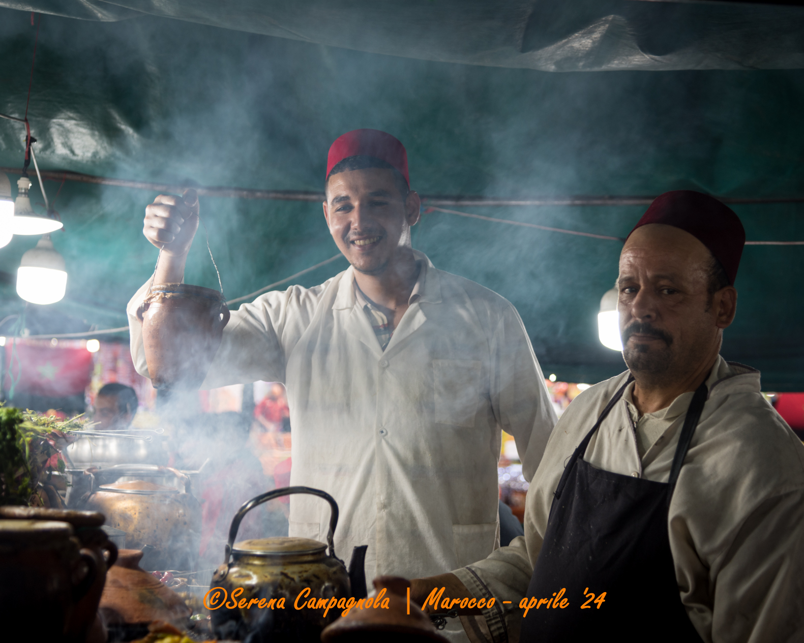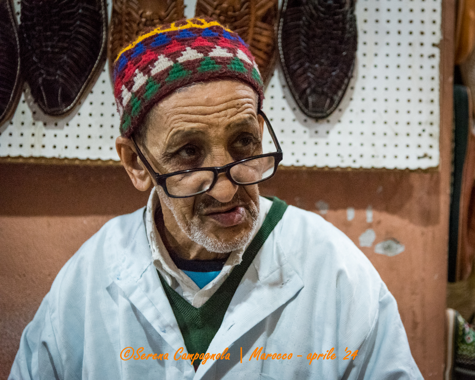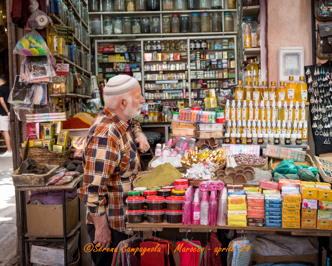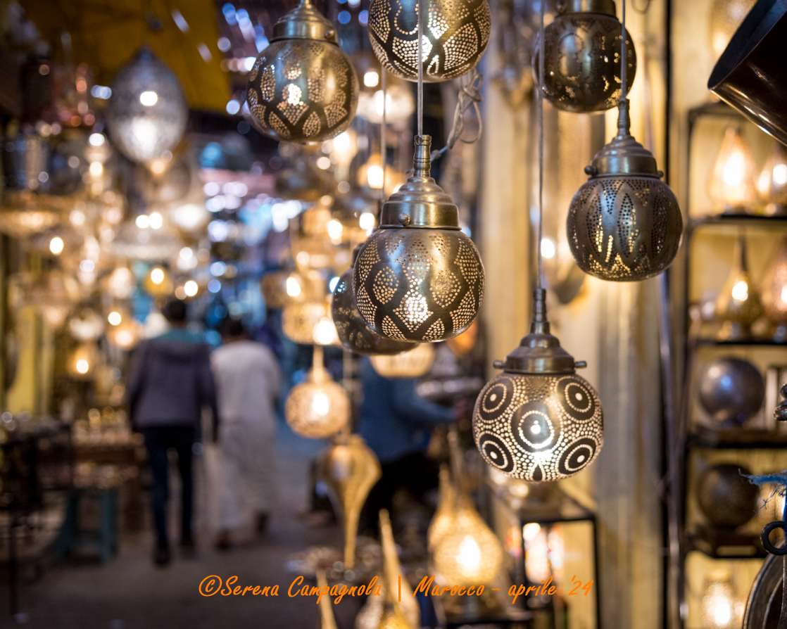 I souk di Marrakech possono sembrare stressanti ma io li adoro. Amo i mercati di tutto il mondo: mi piace farmi guidare dai profumi del cibo e delle spezie, dai colori delle stoffe e dei tappeti, dal brusio e dal caos che li caratterizzano. Senza accorgervene, sarete risucchiati in un dedalo di viuzze e vi ritroverete a vagare all’interno di questo labirinto fatto di incroci infiniti, dove spesso passano delle motociclette e mezzi di trasporto bizzarri. I negozianti sono quasi sempre sull’uscio dei loro negozi, pronti a invitarvi a entrare appena il vostro sguardo distrattamente sfiorerà qualcosa in esposizione. Vi cattureranno cercando di indovinare la vostra provenienza, facendovi mille complimenti soprattutto se siete donne, offrendovi un the alla menta di benvenuto. Non è facile sfuggire ai loro modi accattivanti, preparatevi a dire tantissimi “No, grazie!”. Io in cambio chiedevo di poterli fotografare e spesso la risposta era una mano davanti al volto.