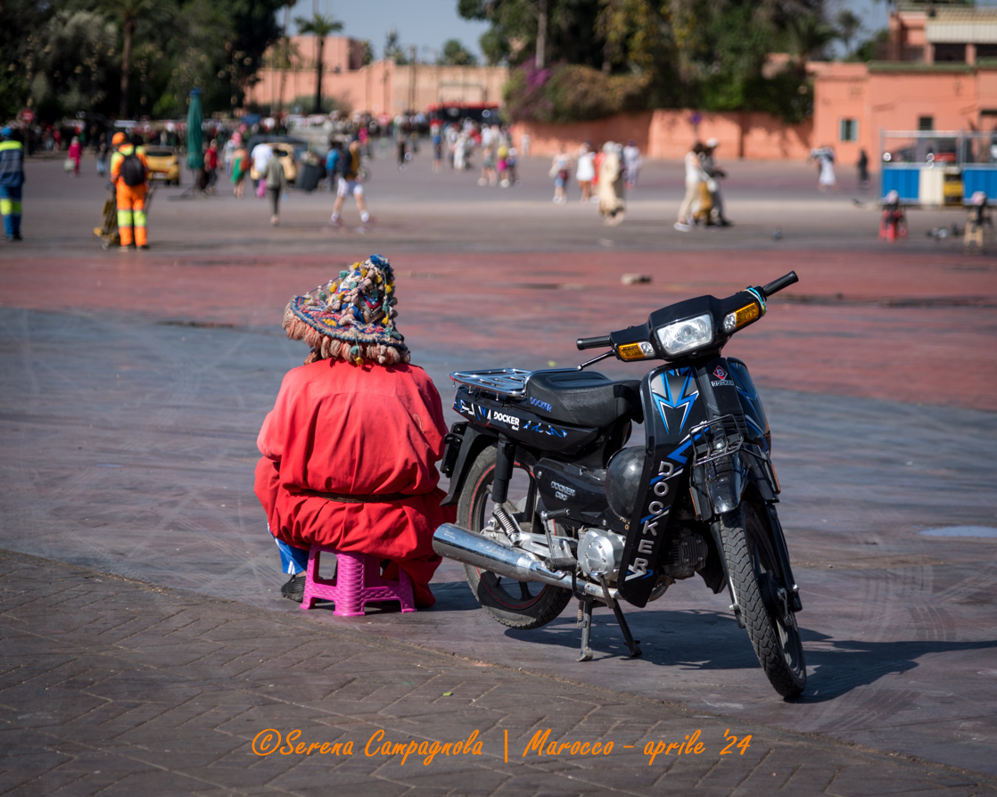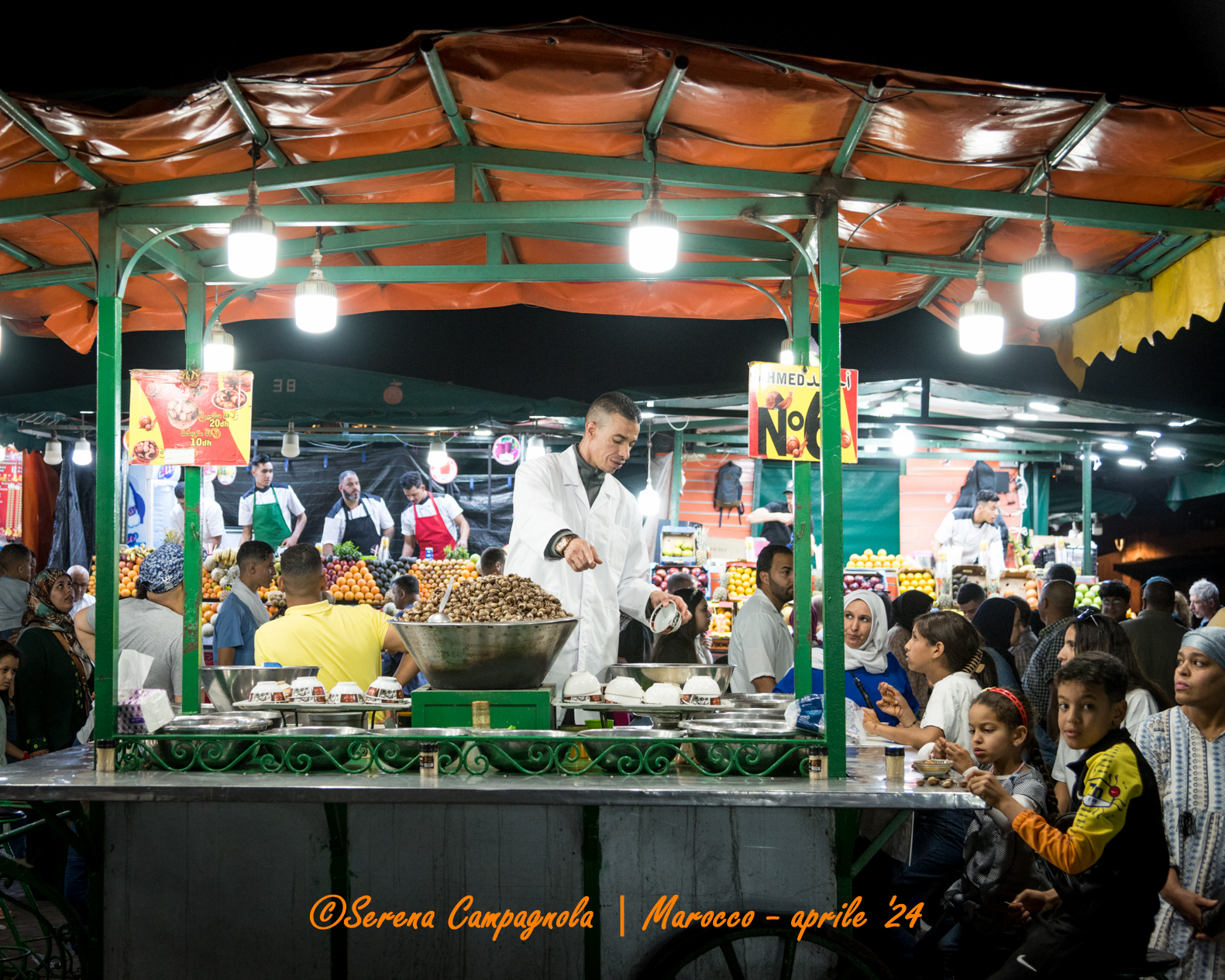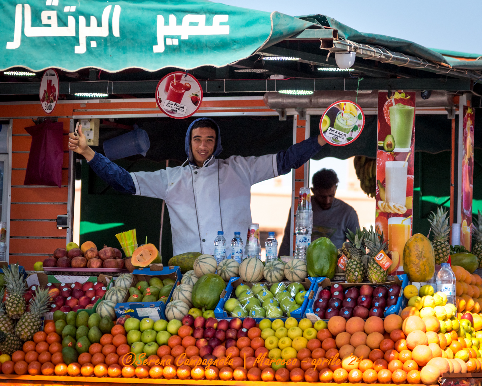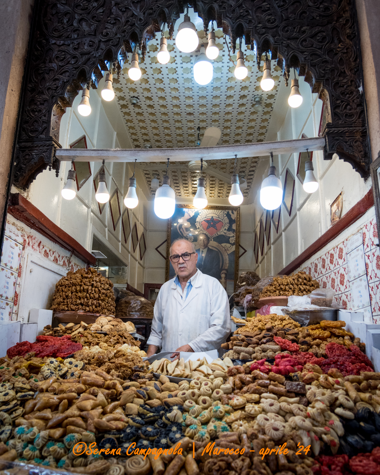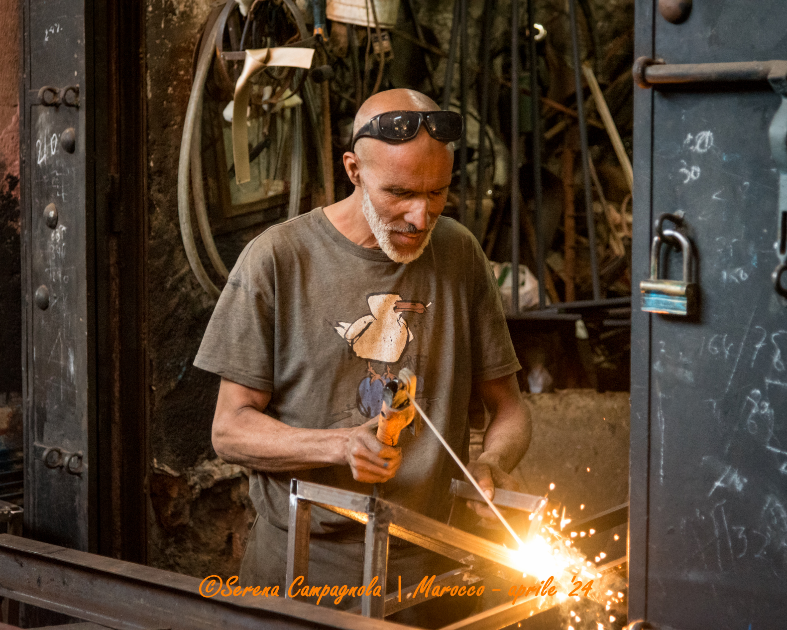 I souk di Marrakech possono sembrare stressanti ma io li adoro. Amo i mercati di tutto il mondo: mi piace farmi guidare dai profumi del cibo e delle spezie, dai colori delle stoffe e dei tappeti, dal brusio e dal caos che li caratterizzano. Senza accorgervene, sarete risucchiati in un dedalo di viuzze e vi ritroverete a vagare all’interno di questo labirinto fatto di incroci infiniti, dove spesso passano delle motociclette e mezzi di trasporto bizzarri. I negozianti sono quasi sempre sull’uscio dei loro negozi, pronti a invitarvi a entrare appena il vostro sguardo distrattamente sfiorerà qualcosa in esposizione. Vi cattureranno cercando di indovinare la vostra provenienza, facendovi mille complimenti soprattutto se siete donne, offrendovi un the alla menta di benvenuto. Non è facile sfuggire ai loro modi accattivanti, preparatevi a dire tantissimi “No, grazie!”. Io in cambio chiedevo di poterli fotografare e spesso la risposta era una mano davanti al volto.