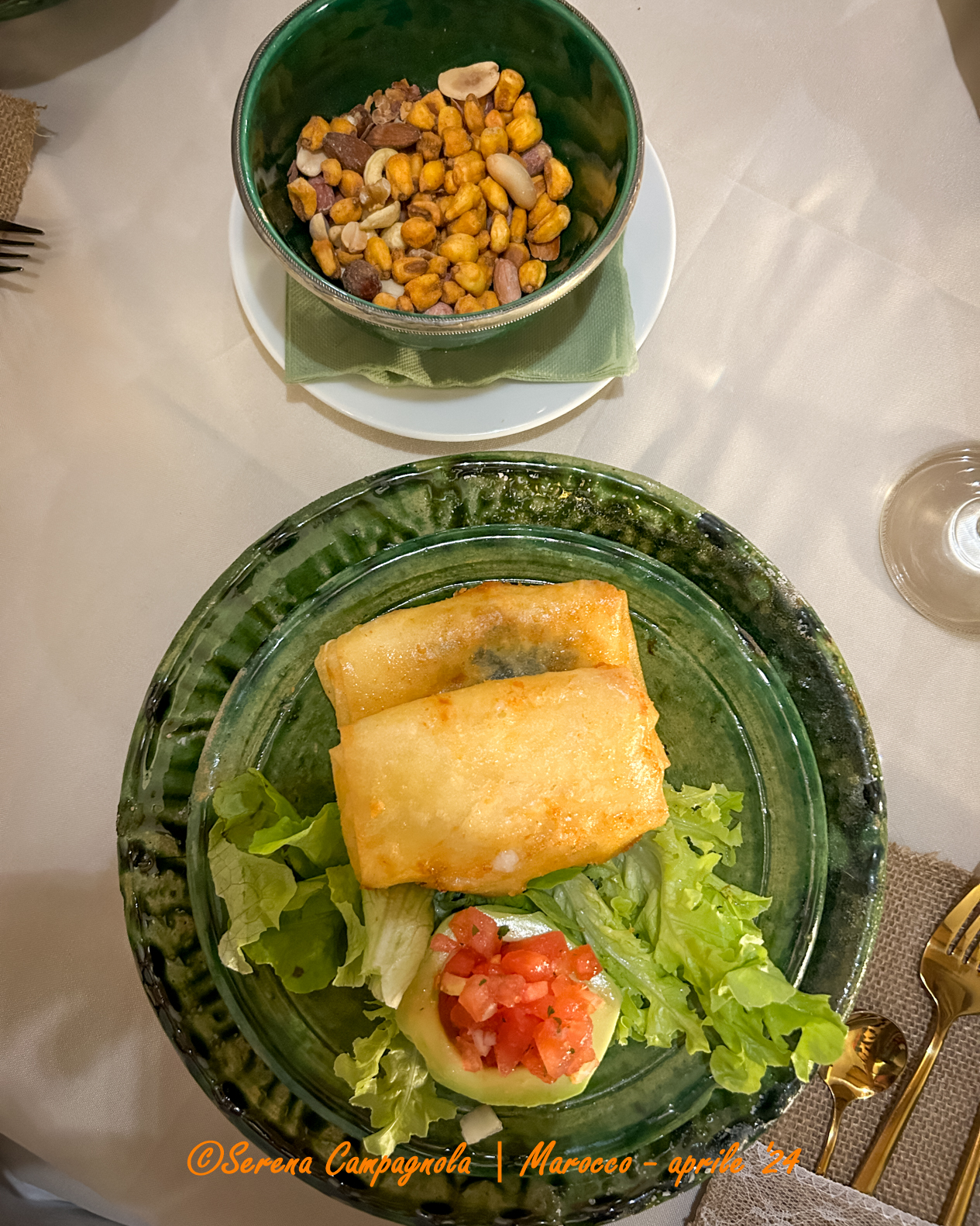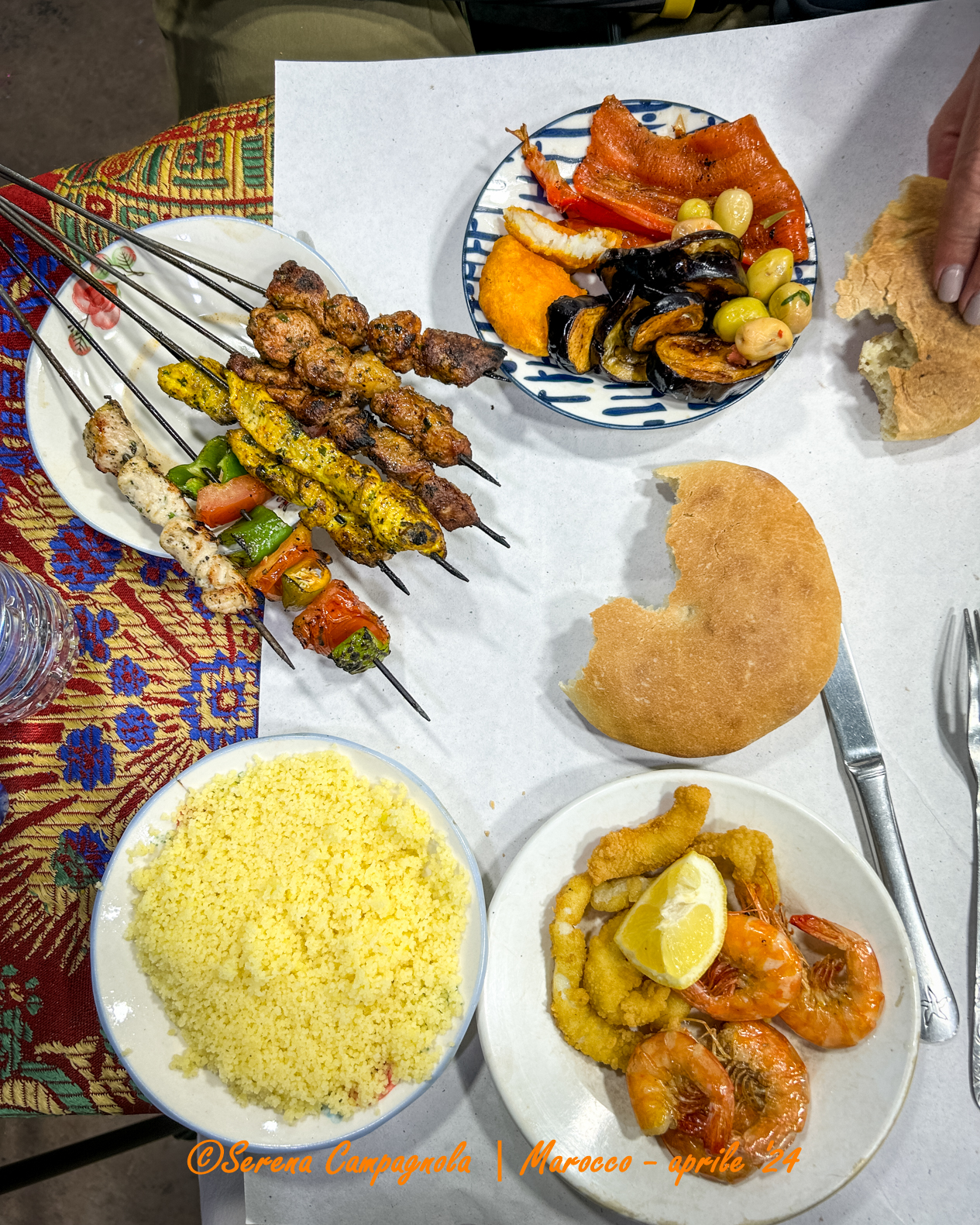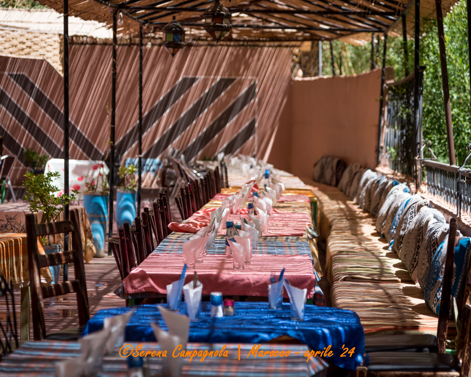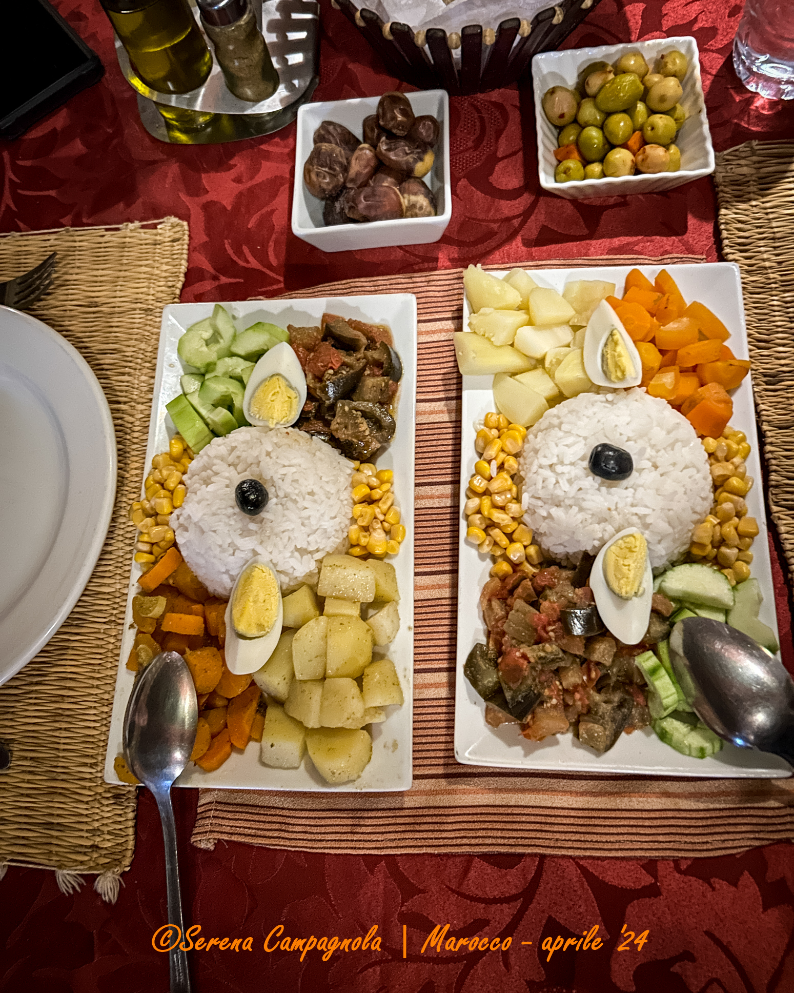 Aggiungo una nota sul CIBO. Non si tratta del mio primo viaggio in Marocco: nel 2017 ero stata a Marrakech, nel 2019 a Chefchaouen e Fez. Entrambe le volte avevo fatto molta fatica a mangiare in quanto non posso assolutamente mangiare cibo contenente spezie di alcun tipo e quantità (TOLLERANZA ZERO). Come faccio sempre ultimamente, avevo preparato l’elenco sia in inglese che in francese (onde evitare fraintendimenti) delle spezie più diffuse in Marocco che facevo leggere direttamente dal cellulare. Ovviamente, come le volte precedenti, non ho potuto assaporare la vera cucina marocchina in quanto mi hanno quasi sempre preparato un “fuori menù”. Ho sempre mangiato senza star male o dover rifiutare il piatto! Come piano B, mi ero portata anche delle barrette energetiche che non ho mai dovuto utilizzare.