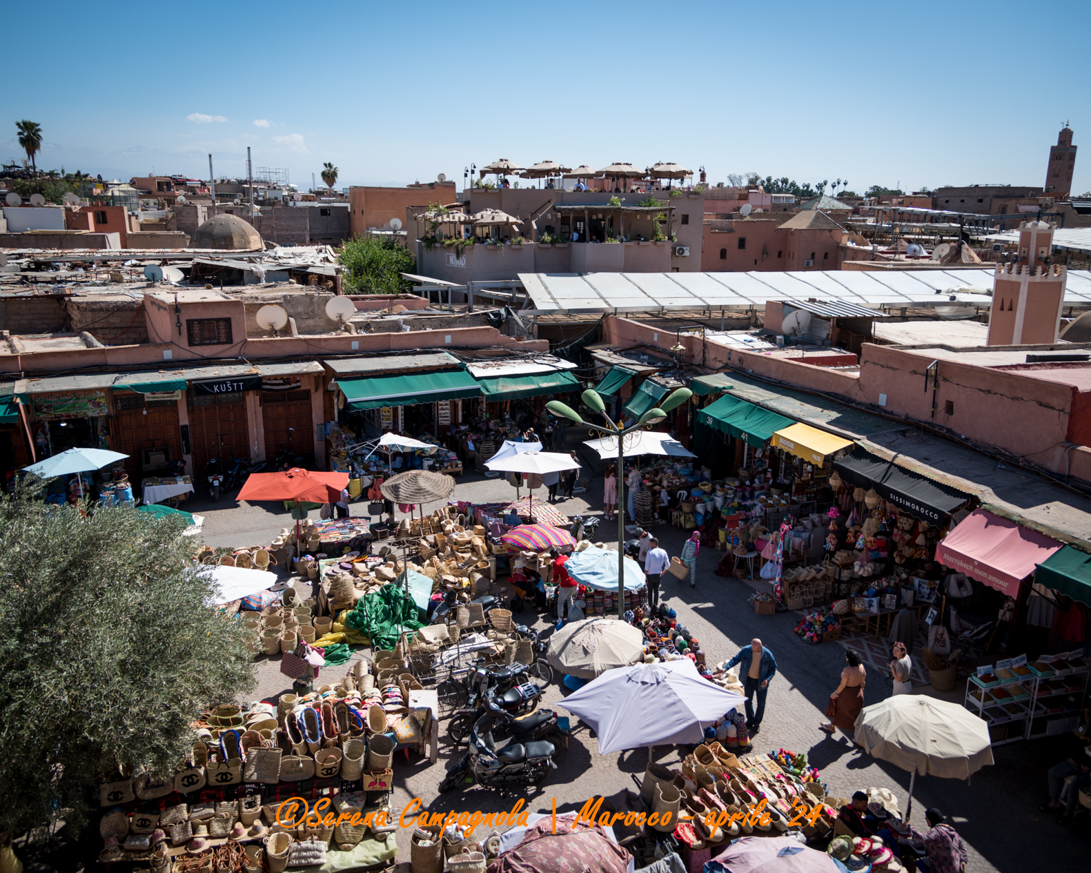 Terminata la visita, ci siamo lasciate con la guida alla Place des Epices. Una piazza molto bella: con ai lati negozi di spezie e al centro un piccolo mercato di prodotti di paglia. Siamo salite sulla terrazza del Cafè des Epices per goderci la vista su questa piazzetta coloratissima, profumata e brulicante di gente affaccendata e ne abbiamo approfittato per pranzare! Per due panini, una Coca-Cola e un’acqua abbiamo speso € 18,50. Sicuramente un bel posto, ma non economicissimo per la Medina di Marrakech!
