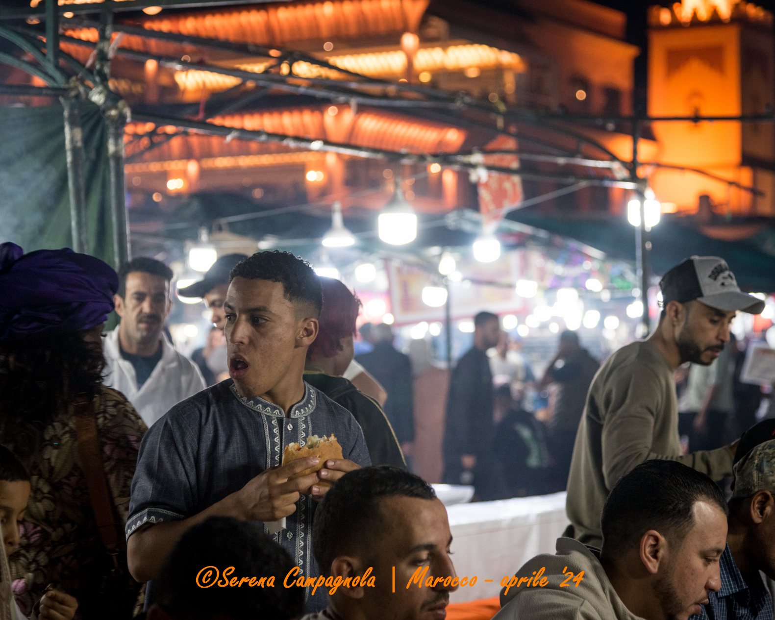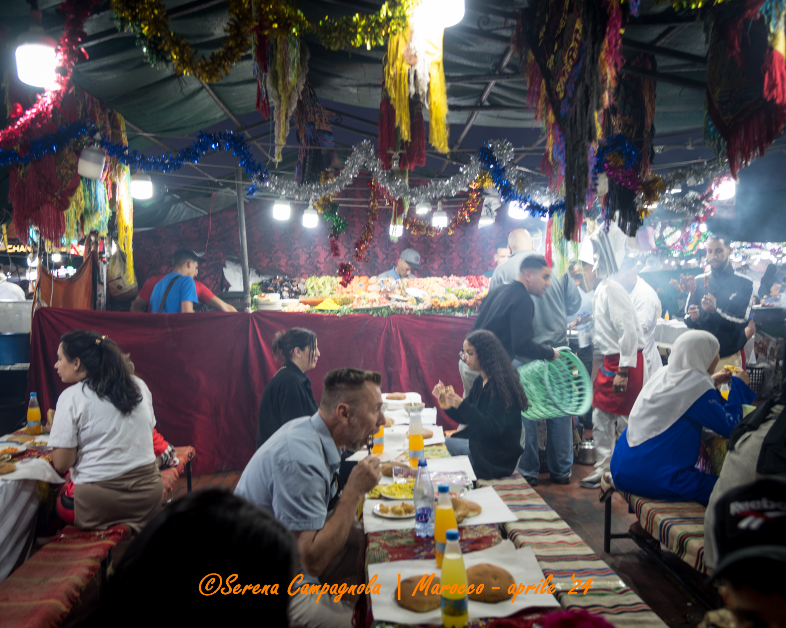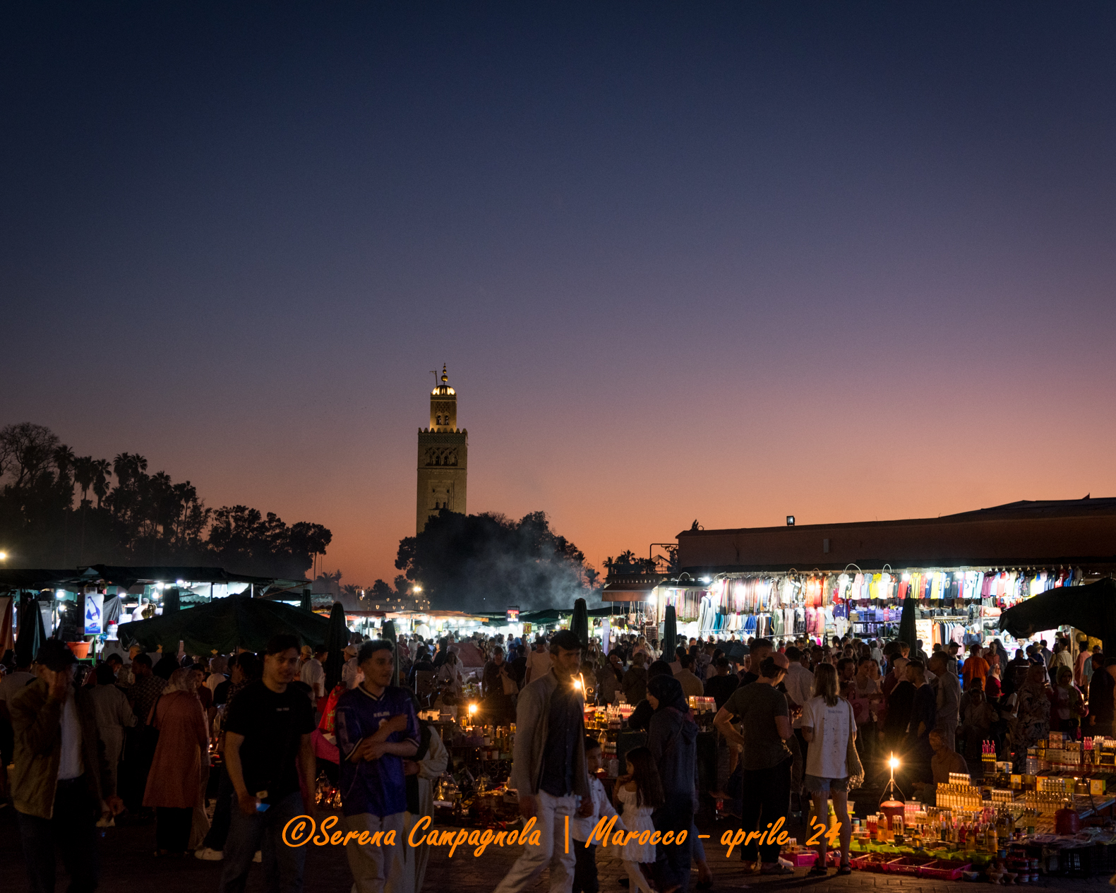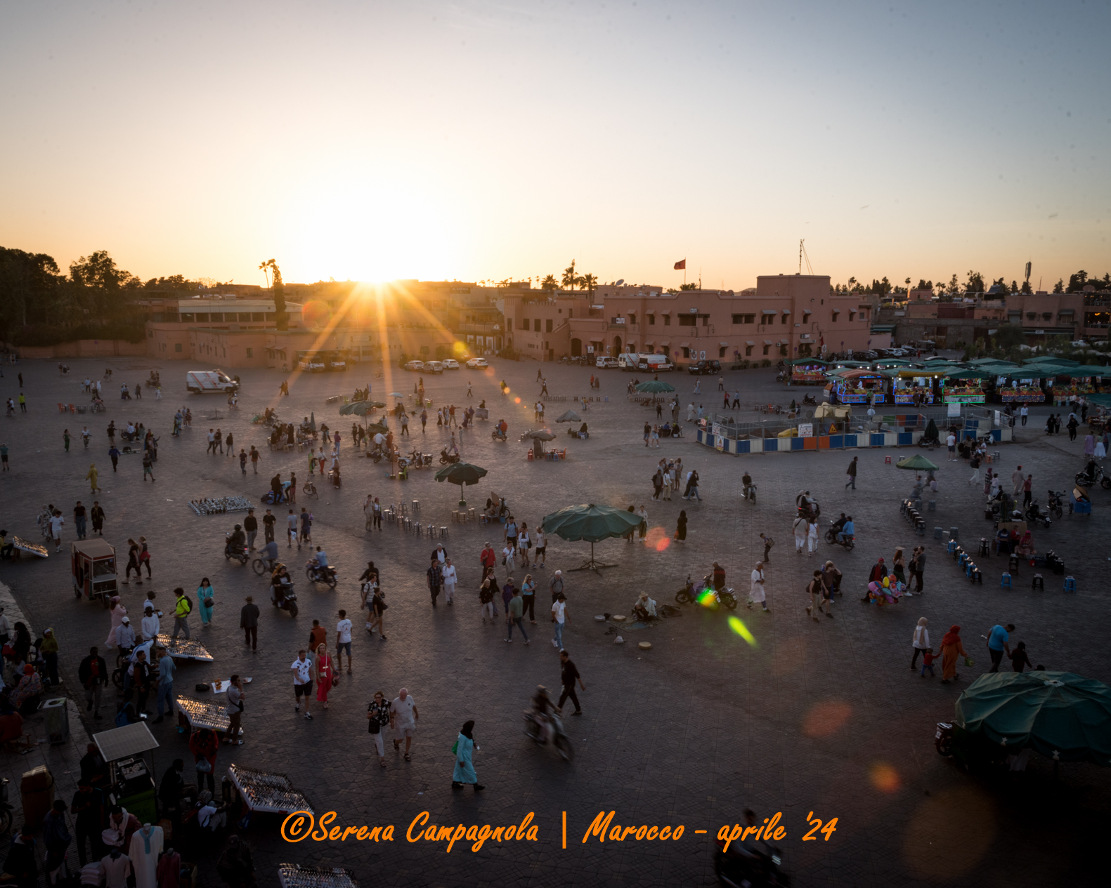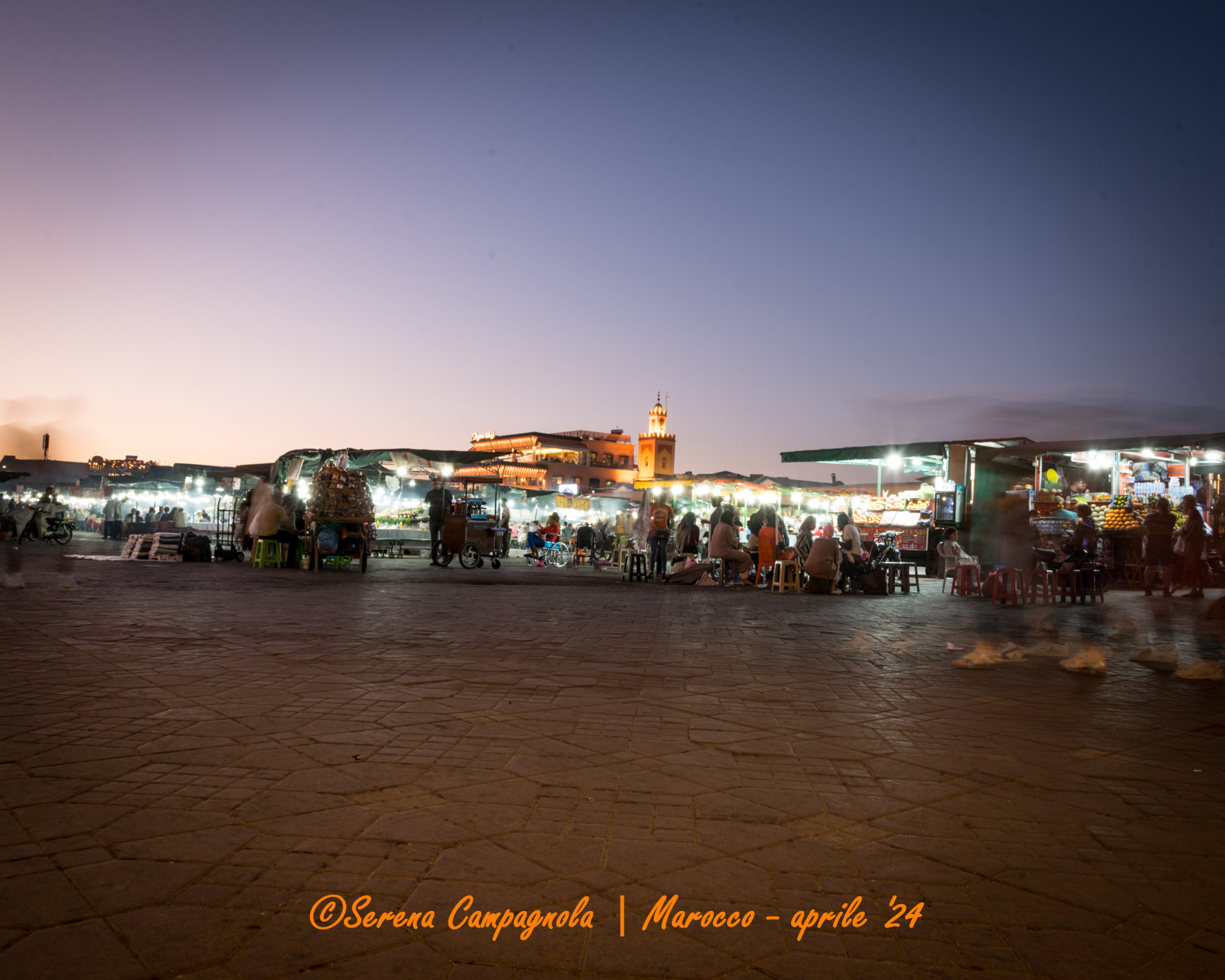 Dopo la cena abbiamo fatto un giro velocissimo in Piazza Jemaa el-Fna. Il fatto che fossero ancora tutti in festa dalla fine del Ramadan (la sera del 9 aprile) era evidente anche a noi: piazza strapiena, tantissime attività in più, tantissima gente locale… Si percepiva l’aria di festa che ha contagiato anche noi due!