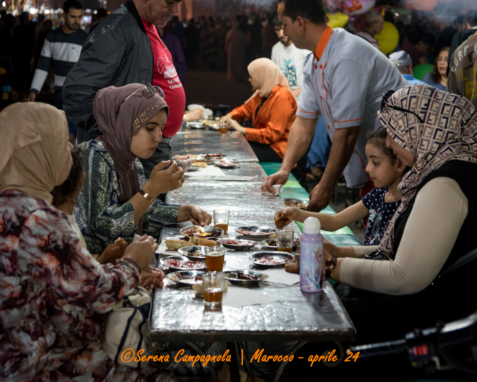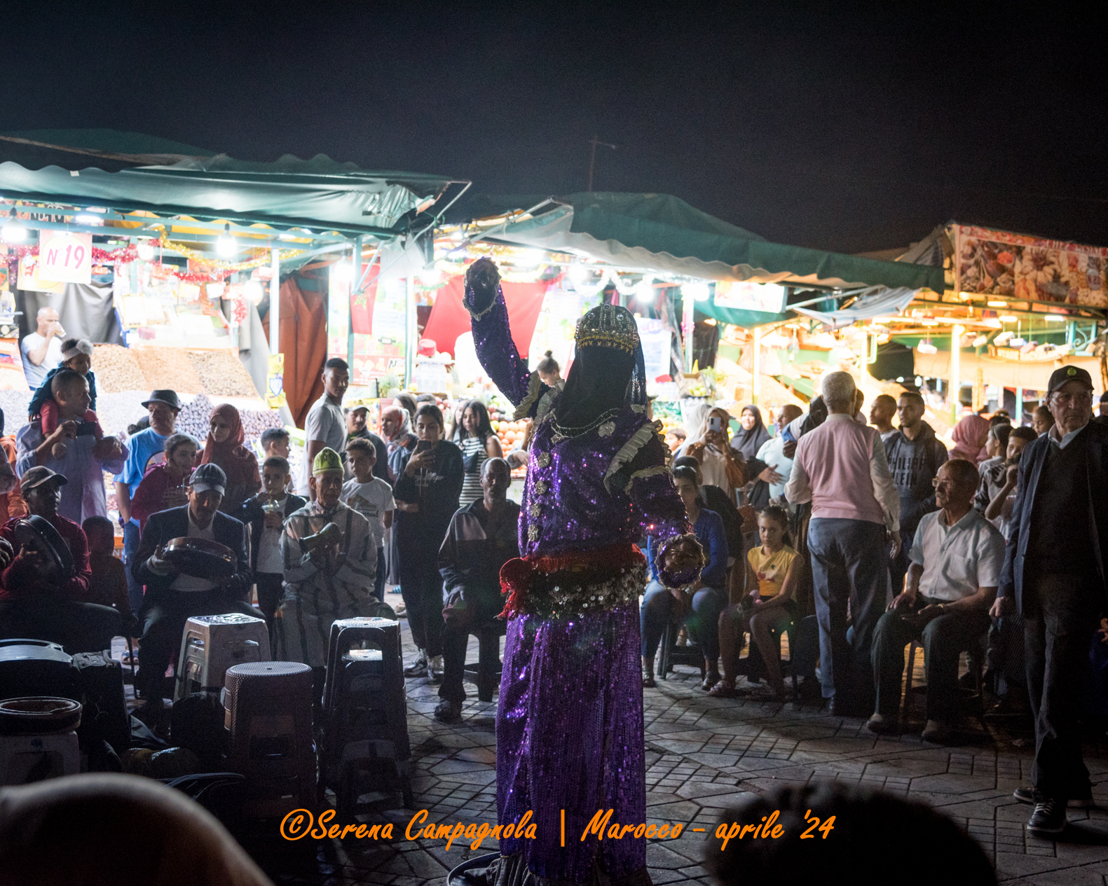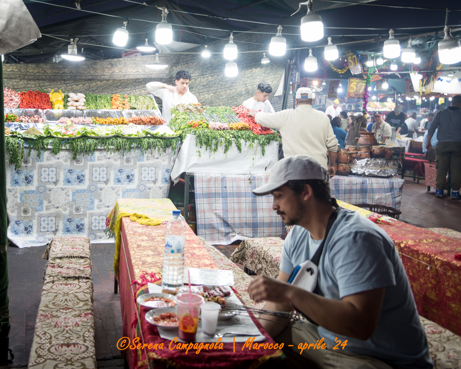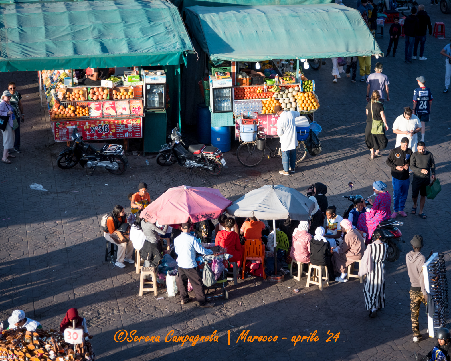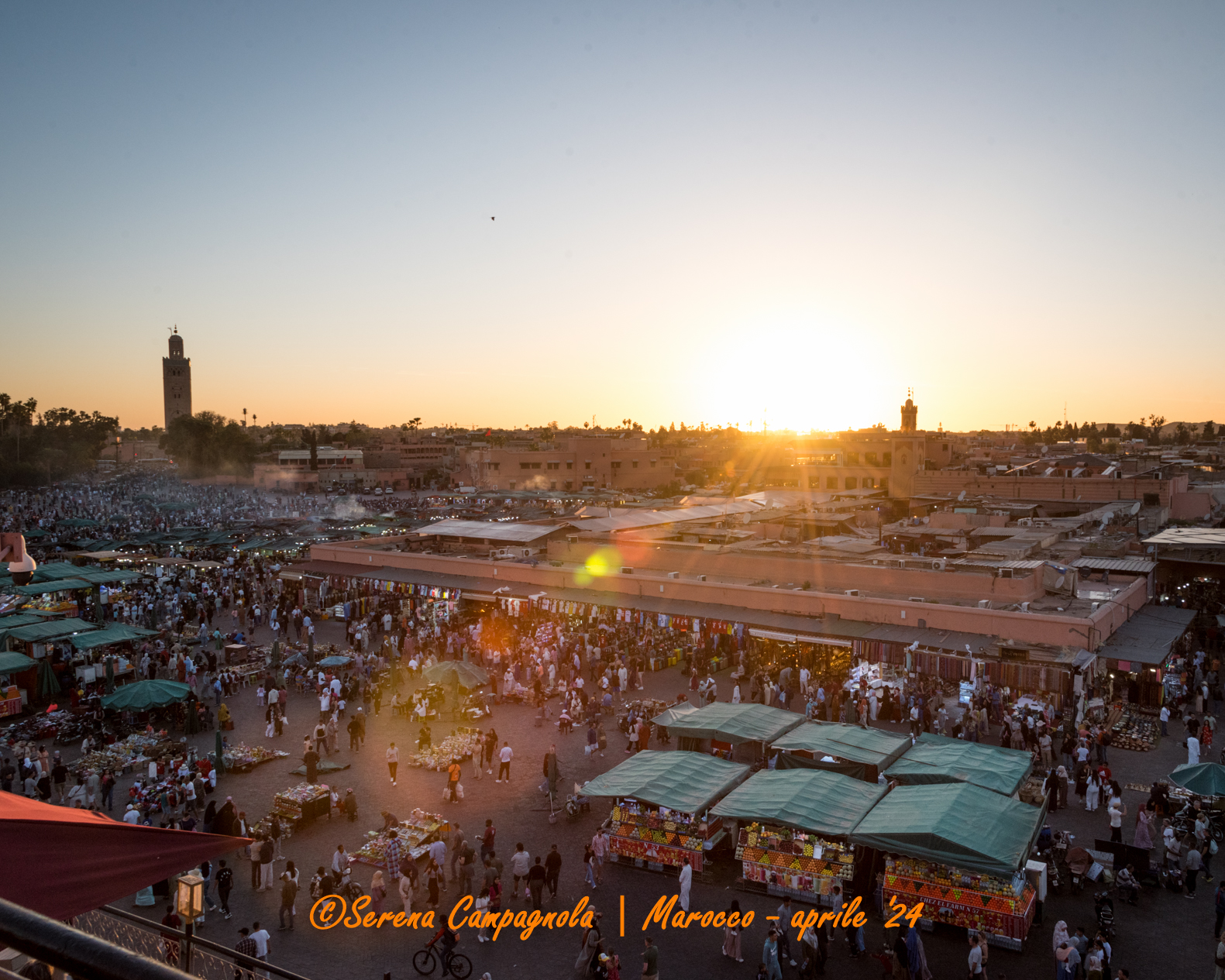 Dopo la cena abbiamo fatto un giro velocissimo in Piazza Jemaa el-Fna. Il fatto che fossero ancora tutti in festa dalla fine del Ramadan (la sera del 9 aprile) era evidente anche a noi: piazza strapiena, tantissime attività in più, tantissima gente locale… Si percepiva l’aria di festa che ha contagiato anche noi due!