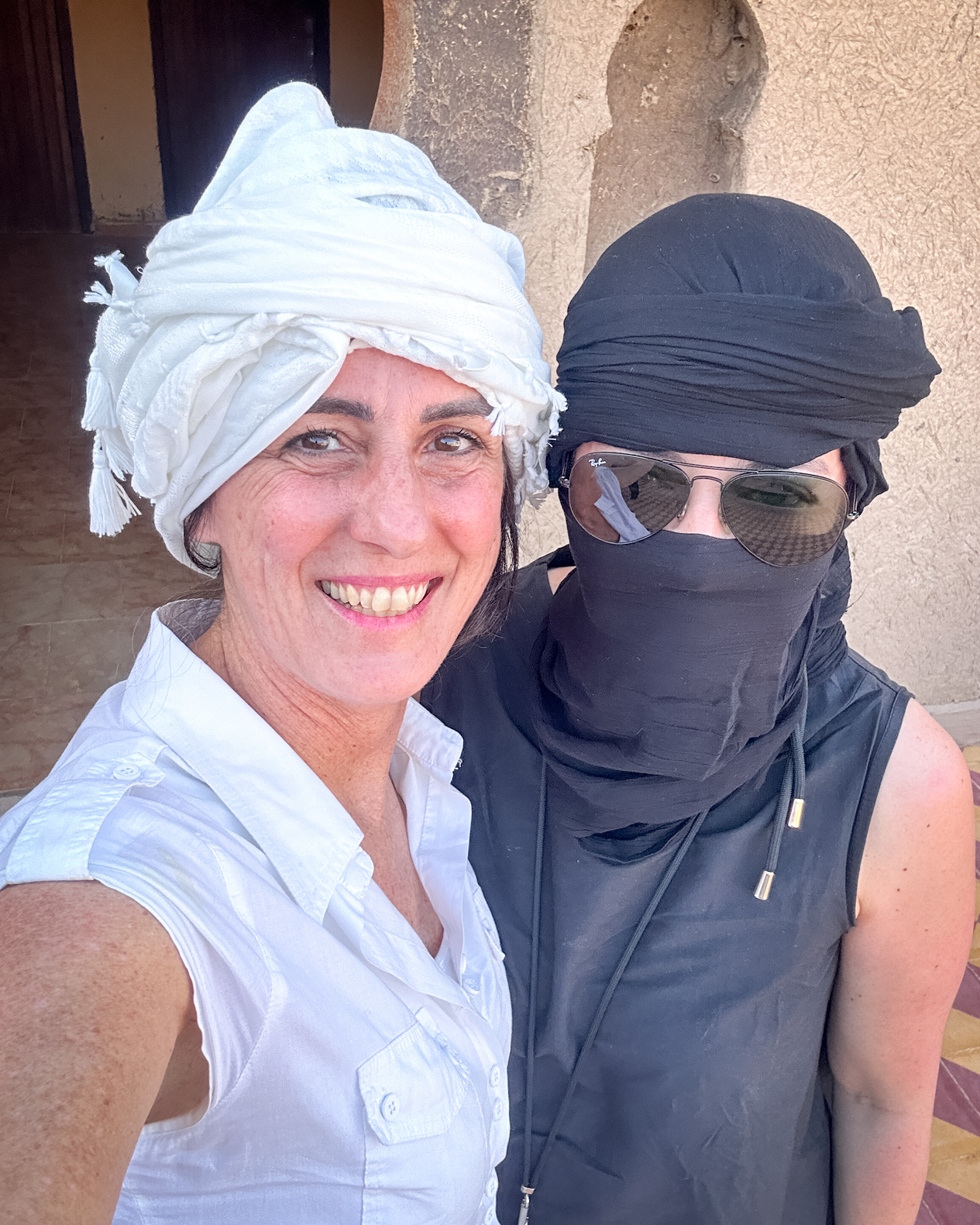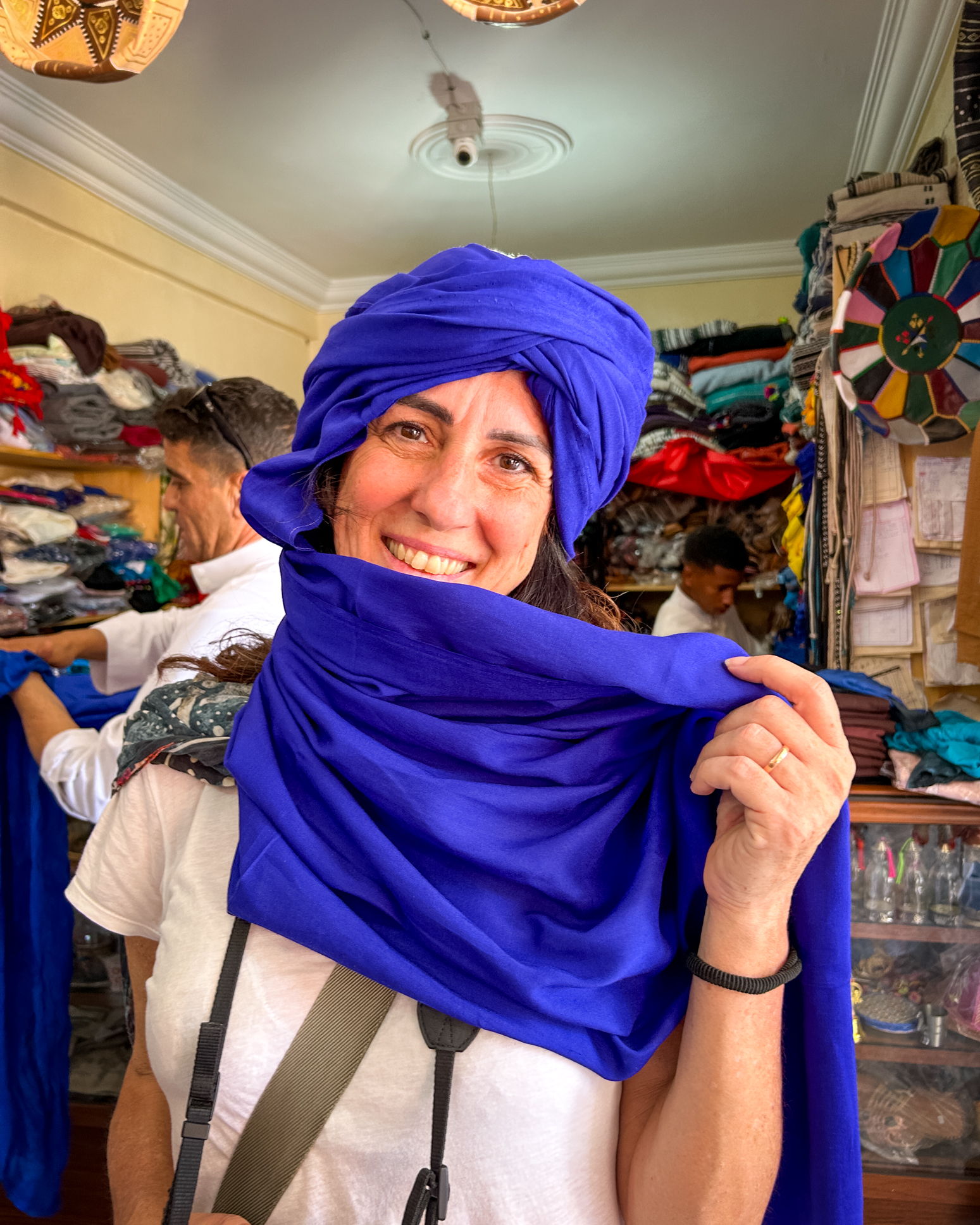 Al termine del giro, ci hanno portati in un negozio per una delle tante marchette dove ci hanno caldamente consigliato di comprare il turbante necessario nel deserto per riparare il viso da sole, vento e sabbia. Io e Giorgia, siamo partite da casa preparate e li avevamo già! Una prova non me la sono fatta mancare con uno dei miei colori preferiti!!!