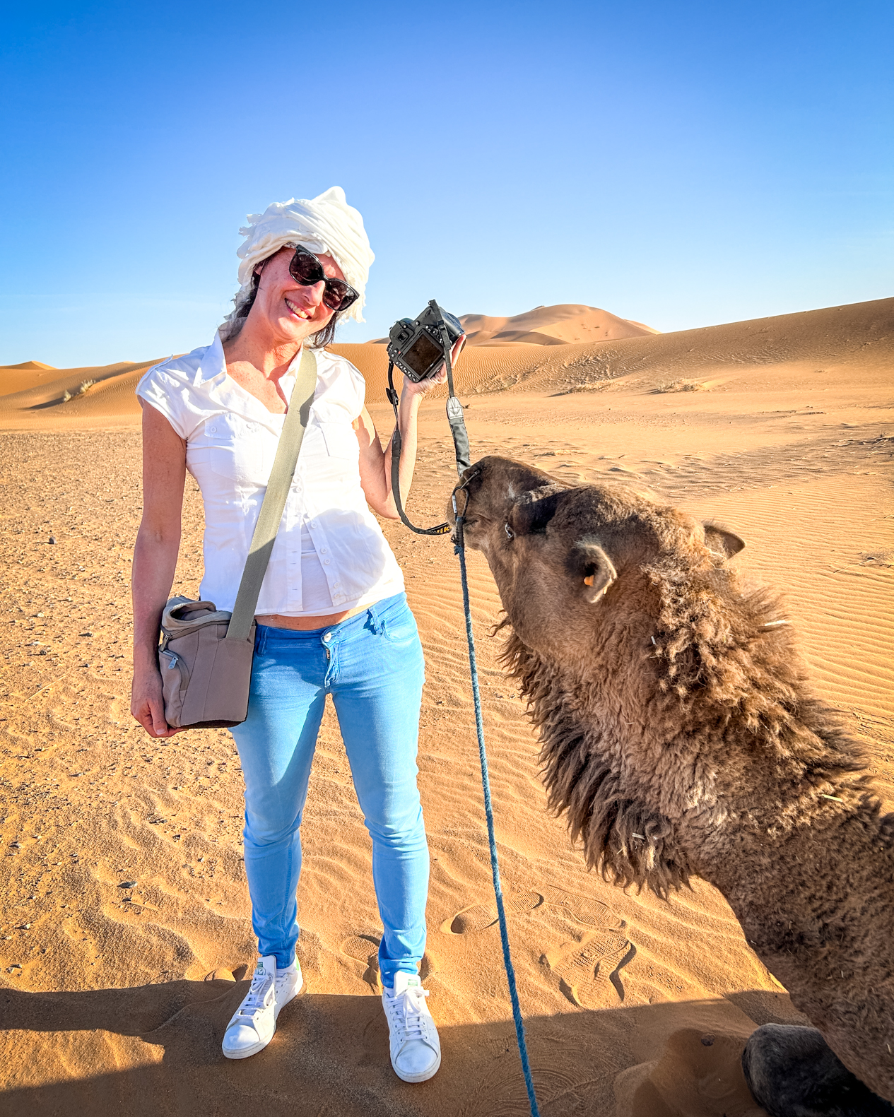 Credo siamo state molto fortunate perché c’era pochissimo vento. Posso solo immaginare i rumori dentro la tenda quando il vento è più forte ed anche il fastidio durante la cammellata. C’era talmente poco vento che i turbanti erano quasi superflui!