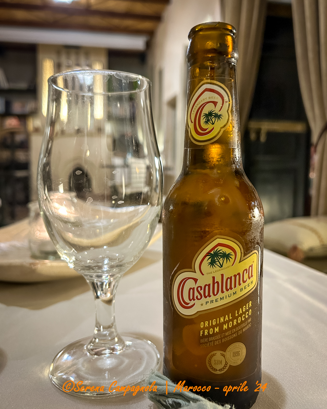 La cena è stata veramente buona. Avevano previsto un menu diverso per i miei problemi, ma la seconda portata si sono sbagliati a servirla, invertendo i piatti… Va beh. Aggiungo che nel Riad ho potuto bere la prima e unica birra della vacanza!