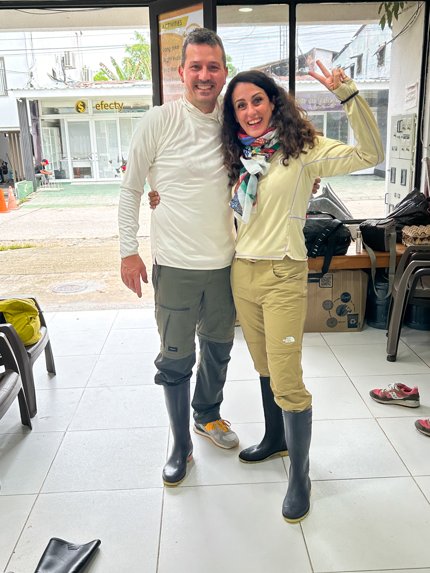 Arrivati in agenzia, ci siamo collegati al loro wi-fi (perché non c’era campo) per comunicare a casa il nostro arrivo in Amazzonia e ci siamo organizzati per tenere solo gli zaini e lasciare in agenzia il bagaglio da stiva. La sera precedente avevamo preparato lo stretto necessario per i 3 giorni in Amazzonia. Vi dico cosa secondo me non deve mancare: un mini beauty-case con campioncini vari, solari, spray antizanzare, adattatore, cappelli con zanzariera, torce da testa, documenti, medicine, impermeabili. Come abbigliamento ci siamo rivolti al Decathlon (pantaloni) e allo store di The North Face (pantaloni e maglie tecniche con cappuccio). La raccomandazione è ovviamente quella di portare abbigliamento di colori chiari, non aderente, traspirante e con asciugatura rapida. In Amazzonia la grande umidità fa sudare tantissimo e, se l’alloggio è senza aria condizionata, il rischio è che la roba non si asciughi!
