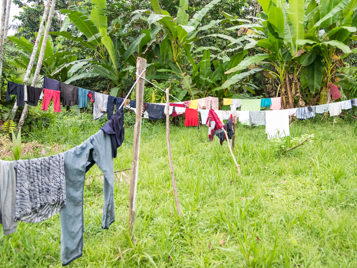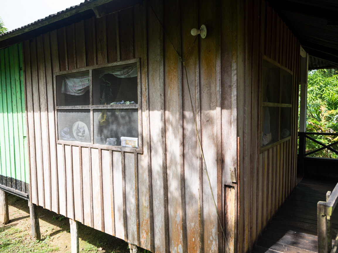 Sbarcati a stento tra tronchi e fango, abbiamo camminato per 10 minuti sotto un muro di pioggia. La nostra guida oltre ad avere il poncho, ha ricevuto anche un ombrello dalla guida locale…noi no, ma eravamo convinti della tenuta degli zaini! Arrivati nella nostra “stanza” sulla palafitta, ci siamo accorti di due cose: in stanza c’era solo il letto, una zanzariera sul letto e una panca (no bagno, no aria condizionata, no luce); i nostri bagagli non avevano retto la pioggia tanto che li abbiamo dovuti strizzare! Abbiamo così sfruttato ogni angolo e chiodo della nostra piccola stanza per appendere il più possibile! Ovviamente esternamente con i rischi di ragni, tarantole e altro non abbiamo potuto appendere nulla. Considerato che non avevamo né clima, né ventola, né ante…potete immaginare quanto si è asciugato!