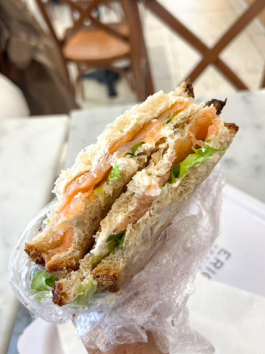 Prima di risalire in macchina abbiamo fatto uno spuntino alla Boulangerie Éric Kayser dove abbiamo preso due ottimi Club Sandwich al salmone a € 15. Locale molto carino con buoni prodotti!