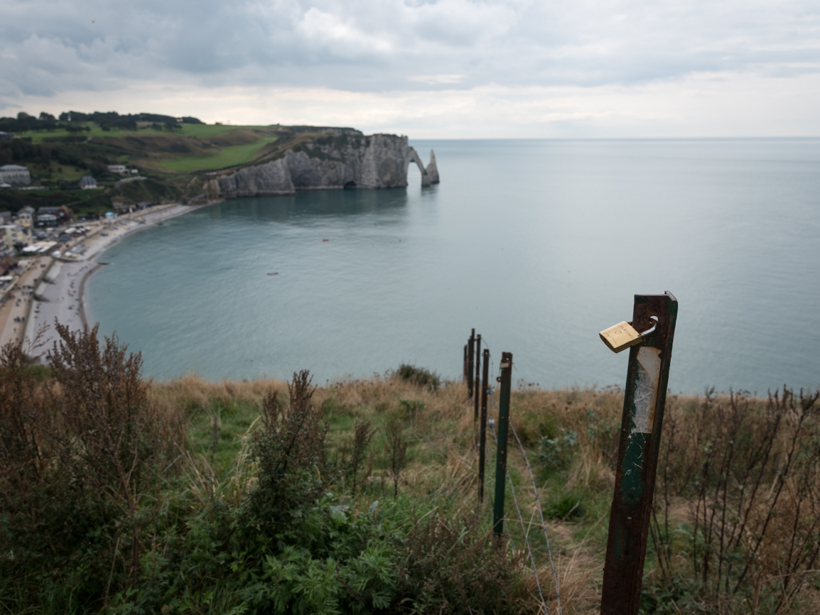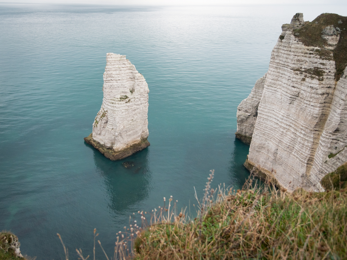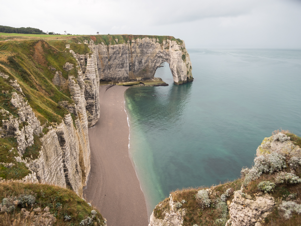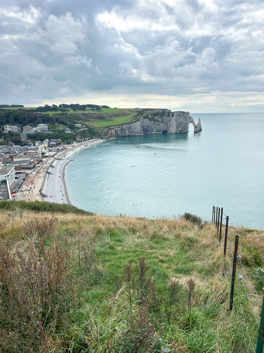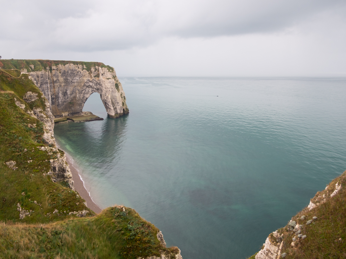 Fortunatamente la pioggia si è fermata per un’oretta e ci ha permesso di salire verso la Falaise Porte d’Aval che è la vera attrazione di Étretat. Si tratta di un arco che emerge dal mare e si trova esattamente sul versante opposto rispetto alla Falesia D’Amont.