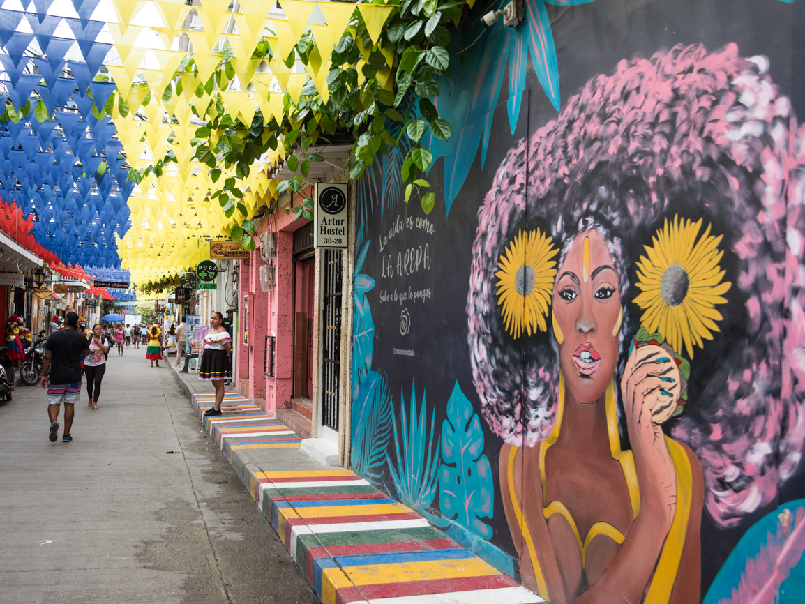 Siamo entrati nel Getsemani attraverso Calle de la Sierpe, piena di murales. Tra i più famosi, quello dedicato a Gabriel Garcia Marquez e al cantante Joe Arroyod e alla sua canzone “La rebelion”, proprio scritta per la città di Cartagena. Abbiamo così raggiunto Plaza della Trinidad, il cuore pulsante di Getsemani. I dintorni di questa vivace piazza del barrio Getsemani sono decorati con interessanti opere di street art e ricchi di piccoli ristoranti dove, in un’atmosfera informale, è possibile assaggiare le specialità della cucina tradizionale colombiana. Da Plaza della Trinidad partono Calle de San Juan, Callejón Ancho, Callejón Angosto, Calle Chancletas. Sarebbe stato interessante avere una guida per sentire racconti da chi ha vissuto la storia di Getsemani e della sua recente rinascita.