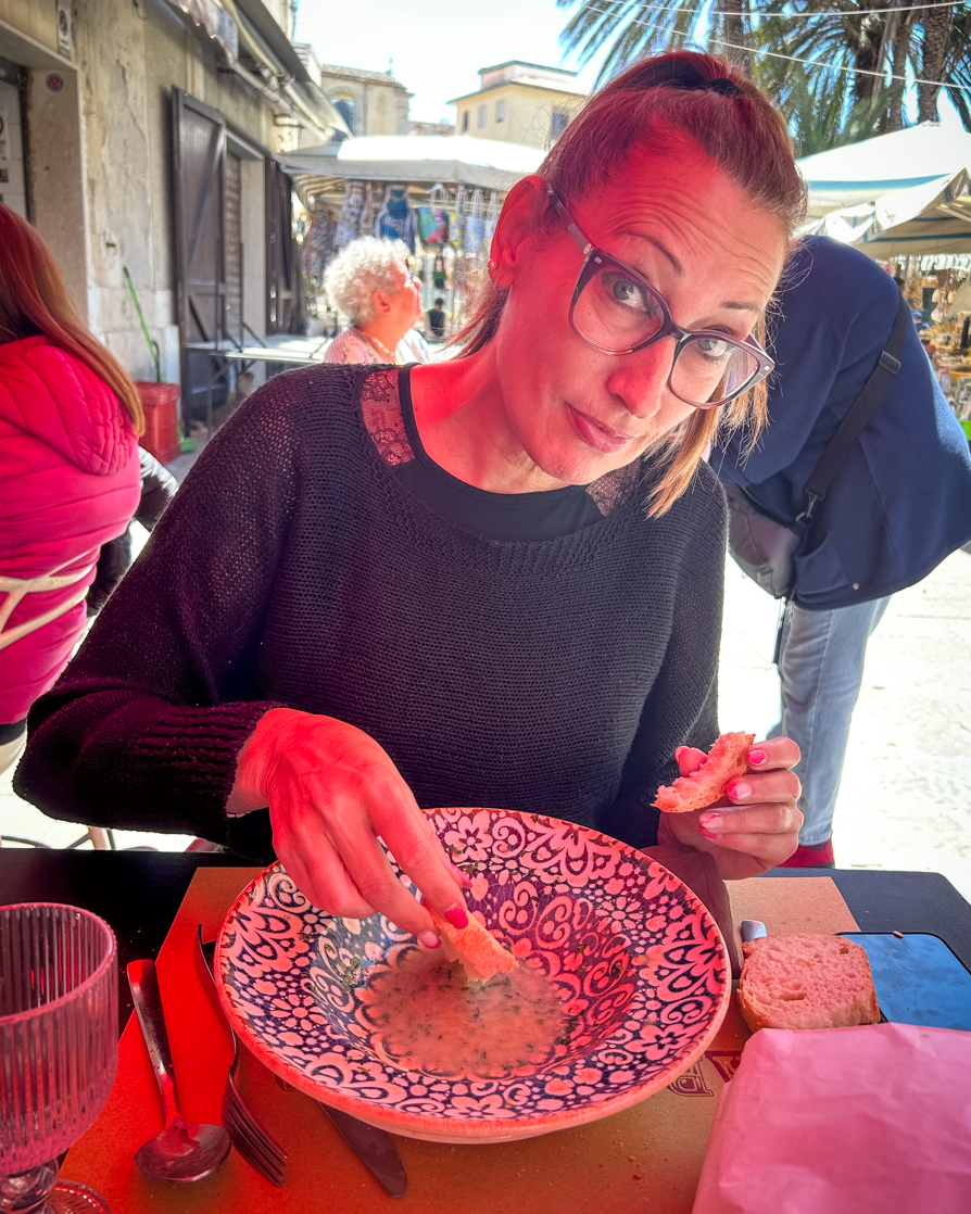 Abbiamo deciso di pranzare in mezzo ai banchi del Mercato di Ortigia alla Carnezzeria, un ristorante che ci è stato consigliato da Corrado (Casa Memi). Abbiamo mangiato dell’ottimo pesce ottimo! Abbiamo speso € 63 per: una birra Messina, un bicchiere di vino, 1 bruschetta alici e burrata, 1 insalata di polpo, 1 piatto di pasta alle cozze e 2 caffè. Io e Mic, avendo più o meno gli stessi gusti, ci siamo condivise tutti i piatti!!!