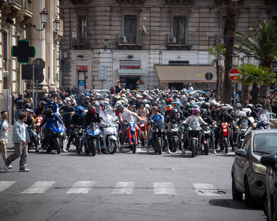 Abbiamo ripreso a percorrere Via Crociferi fino all’Anfiteatro Romano arrivando in Piazza Stesicoro dove siamo state sorprese da una “processione” impressionante di scooter e moto. Mi ha portata un po’ con i ricordi a Providencia (Colombia).